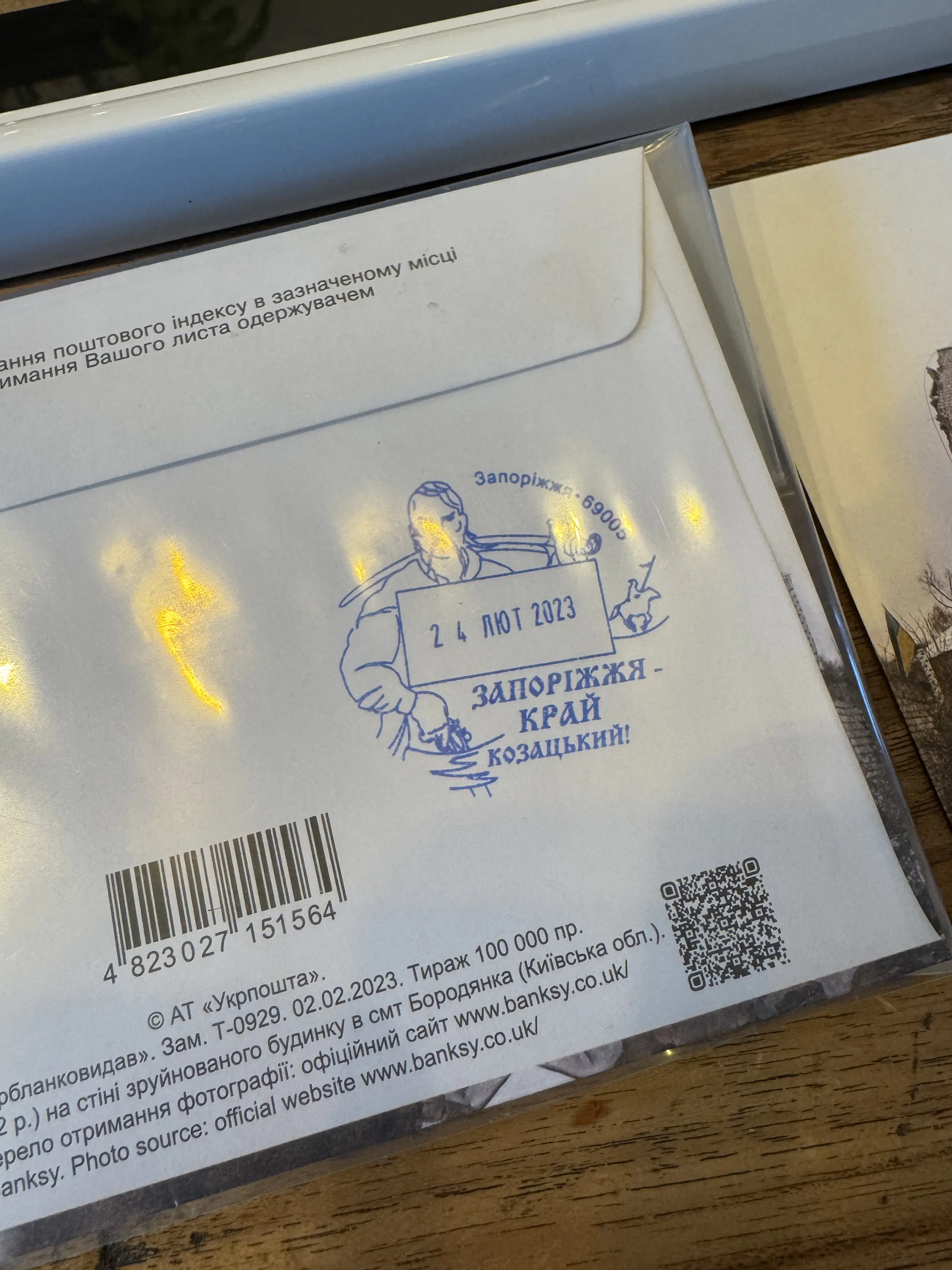 Er zijn ook twee postzegels (op de voor- en achterkant van de envelop) in blauwe inkt, eveneens gedateerd 24 februari 2023, die een man voorstellen, gewapend met een sabel en met de woorden: "Zaporizhia Cossack Region".