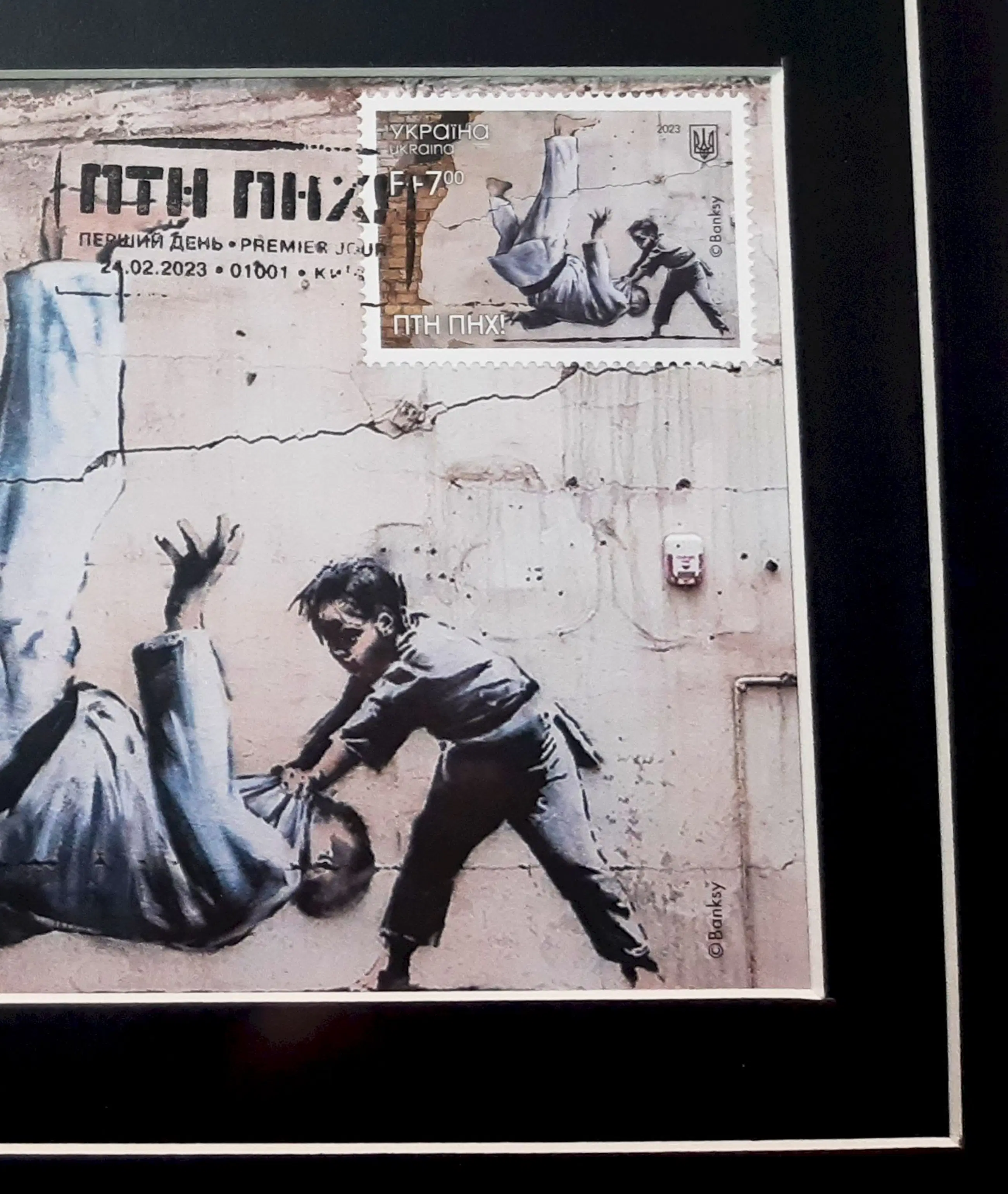 Het betreft een zeldzaam ingelijst exemplaar met de Maximumkaart FDC met annuleringsstempel 24.02.2023 Kyiv van de kunstenaar Banksy.