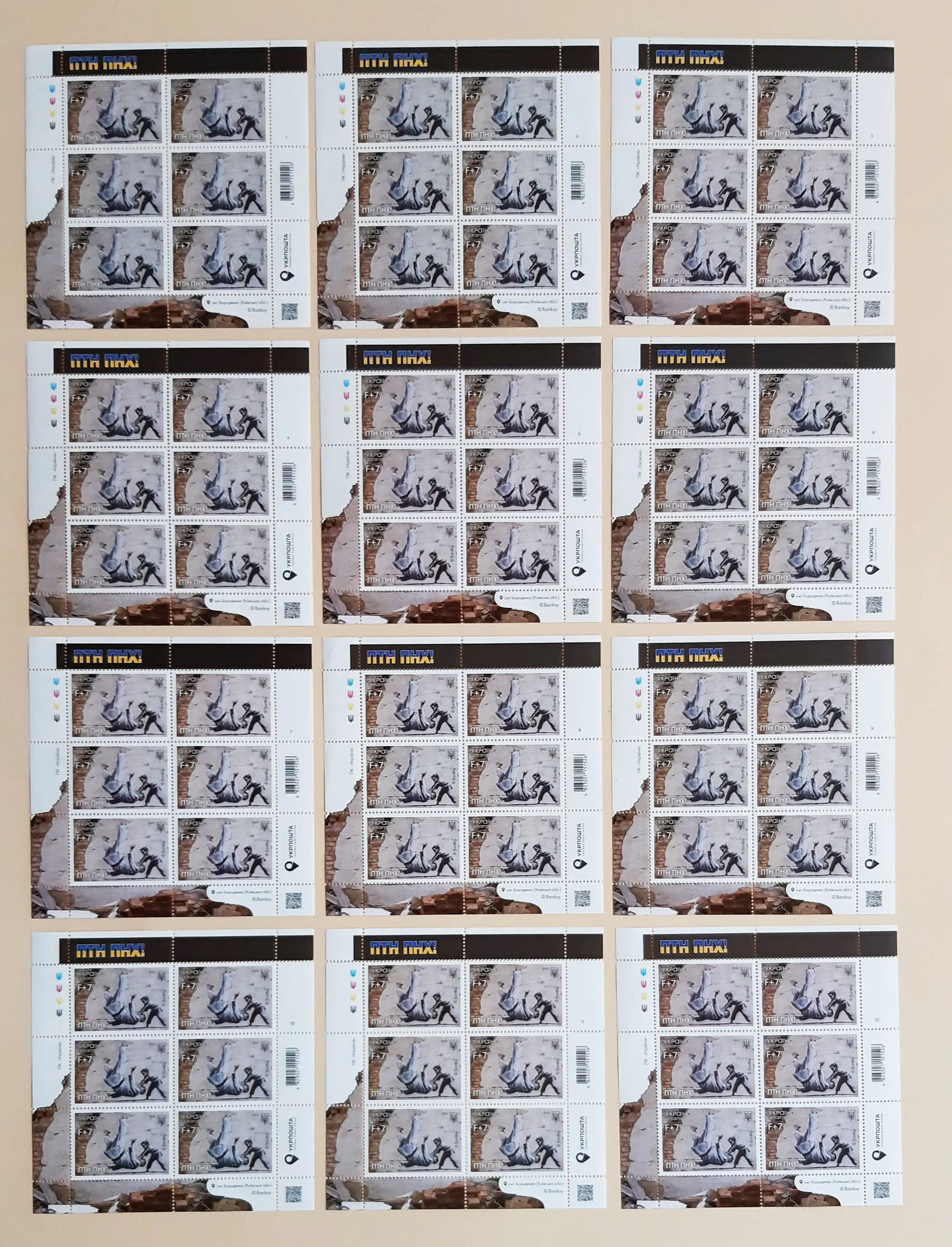 De auteursrechten van Banksy zijn op elke postzegel zichtbaar.
