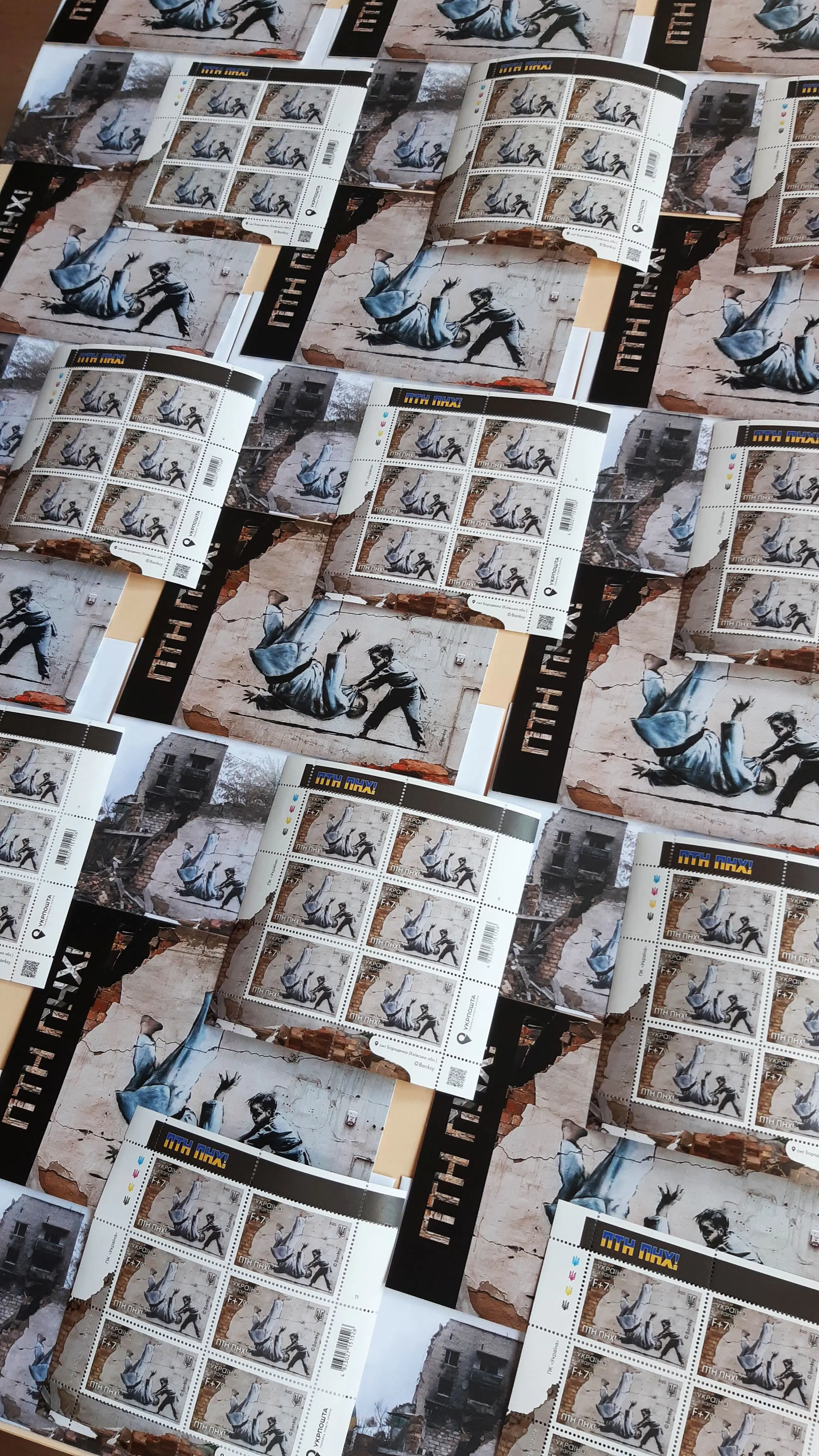 De auteursrechten van Banksy zijn op elke postzegel zichtbaar.