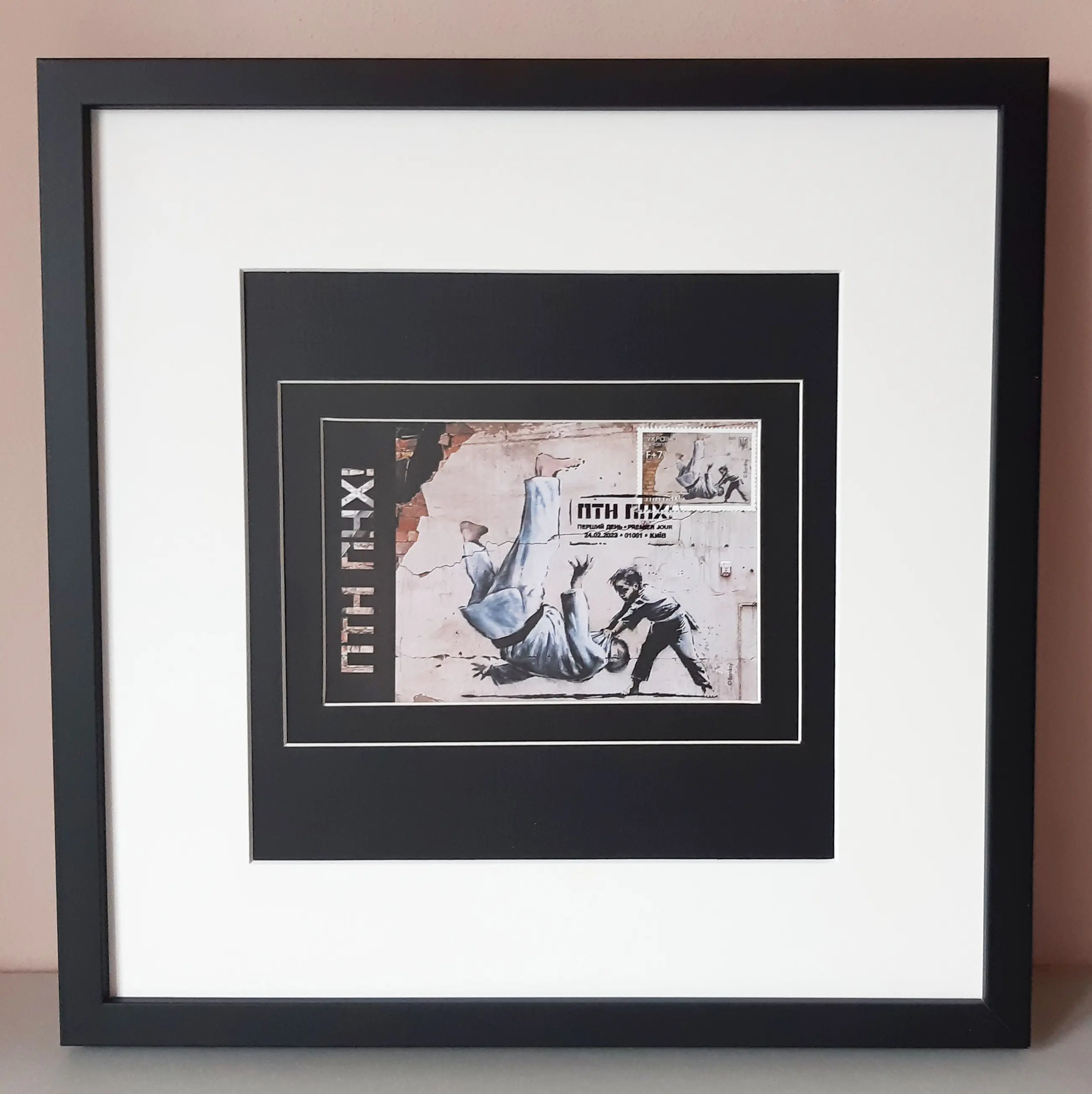 Het is een zeldzaam ingelijst stuk, waarop de Maximum-kaart FDC met annuleringsstempel van 24-02-2023 uit Kiev van de kunstenaar Banksy te zien is.