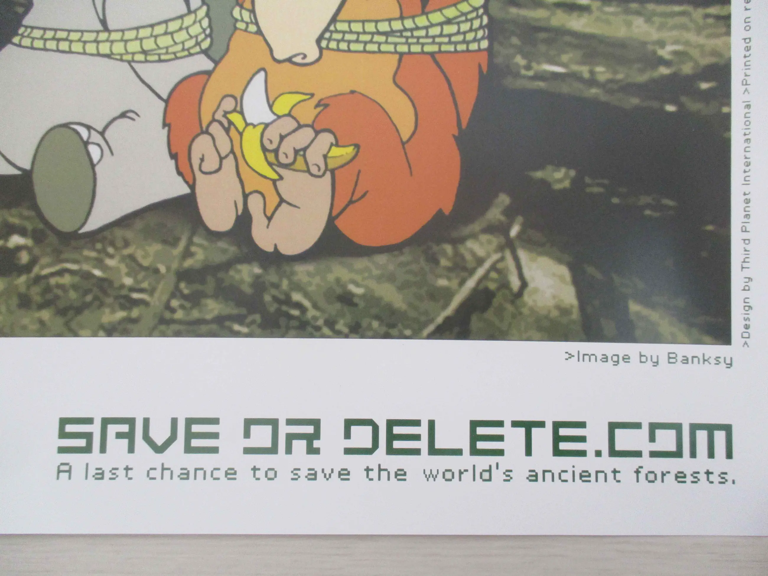Banksy's zeldzame poster geprint op gerecycled papier en een originele bijbehorende sticker.