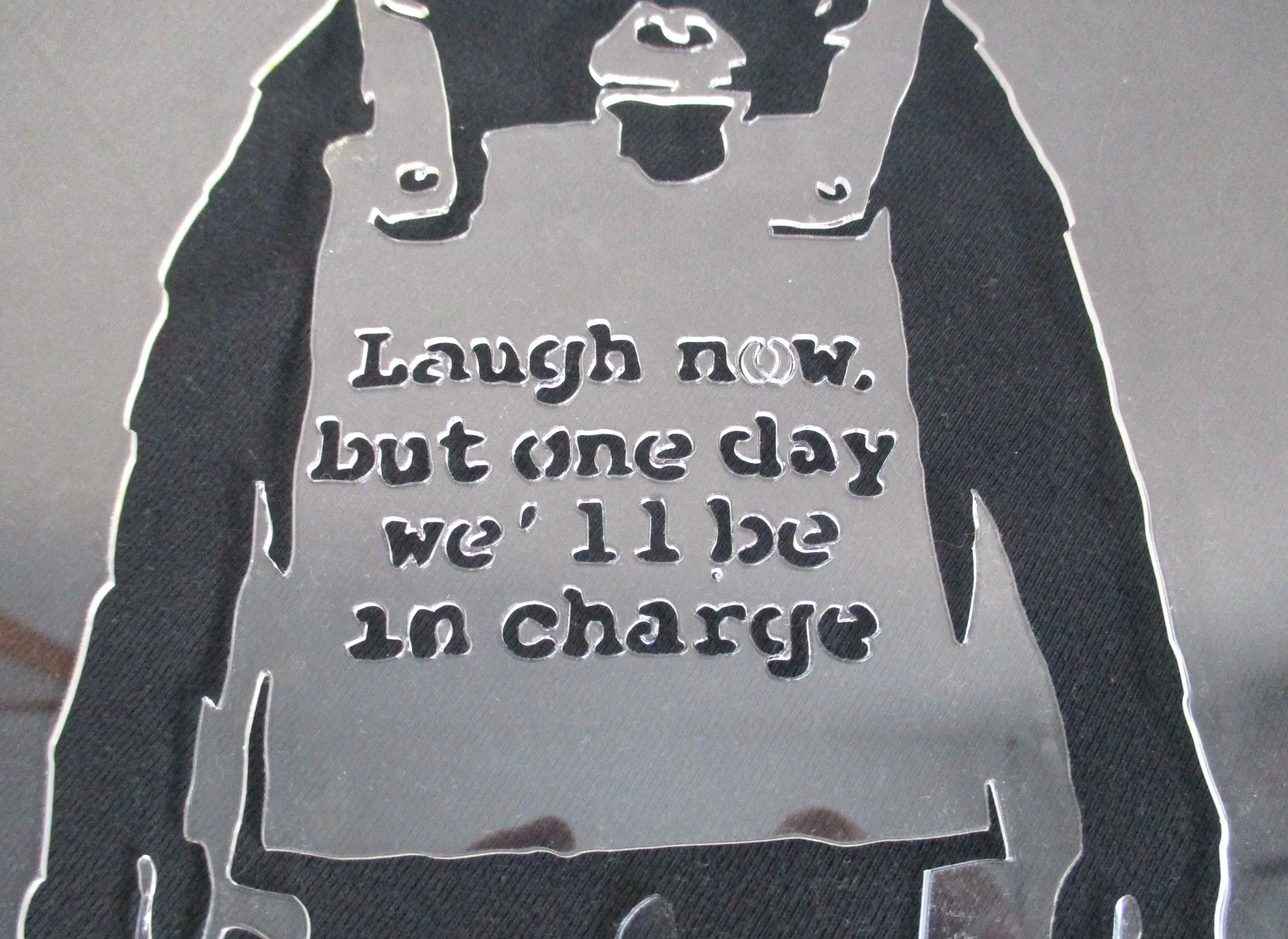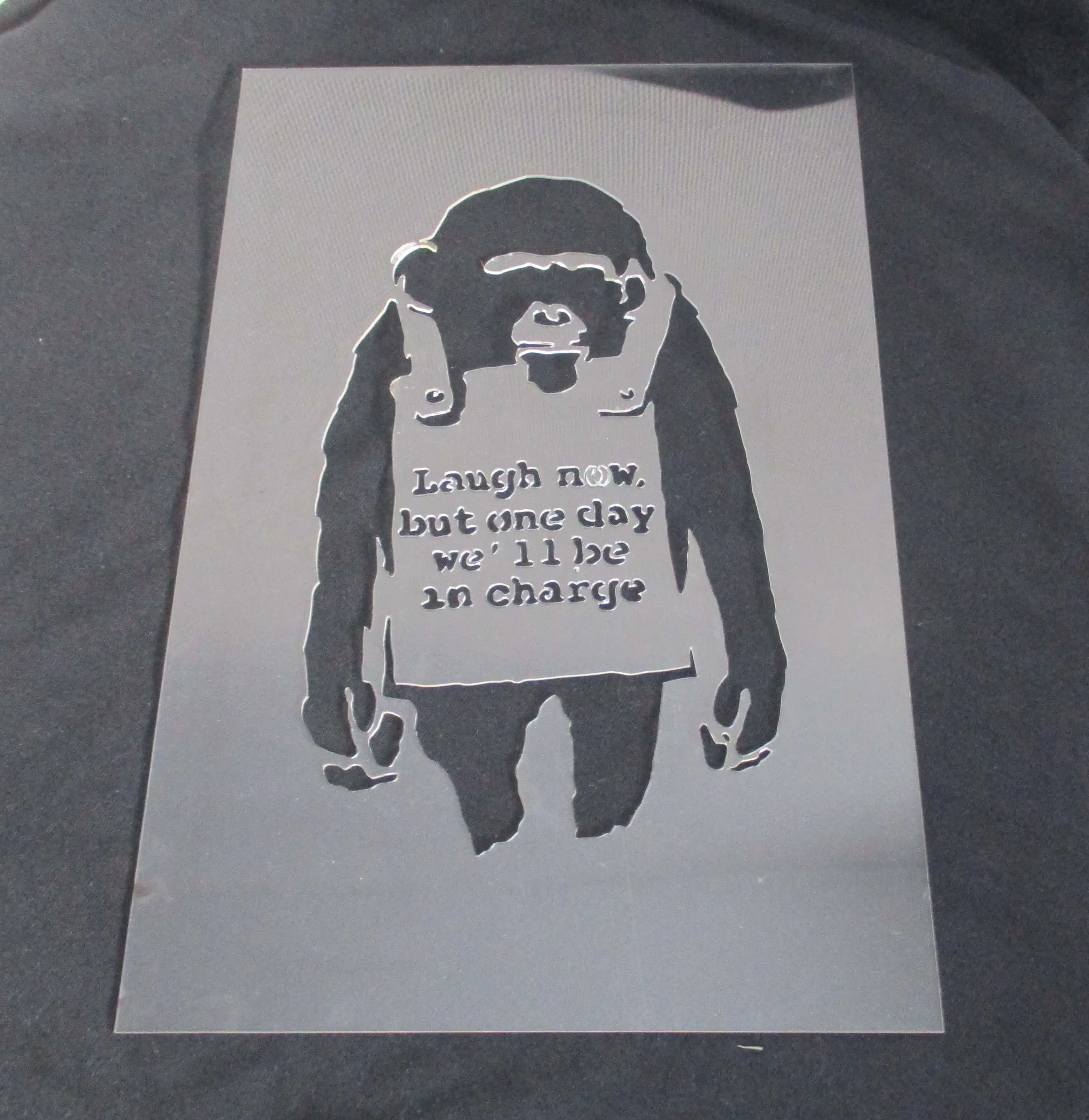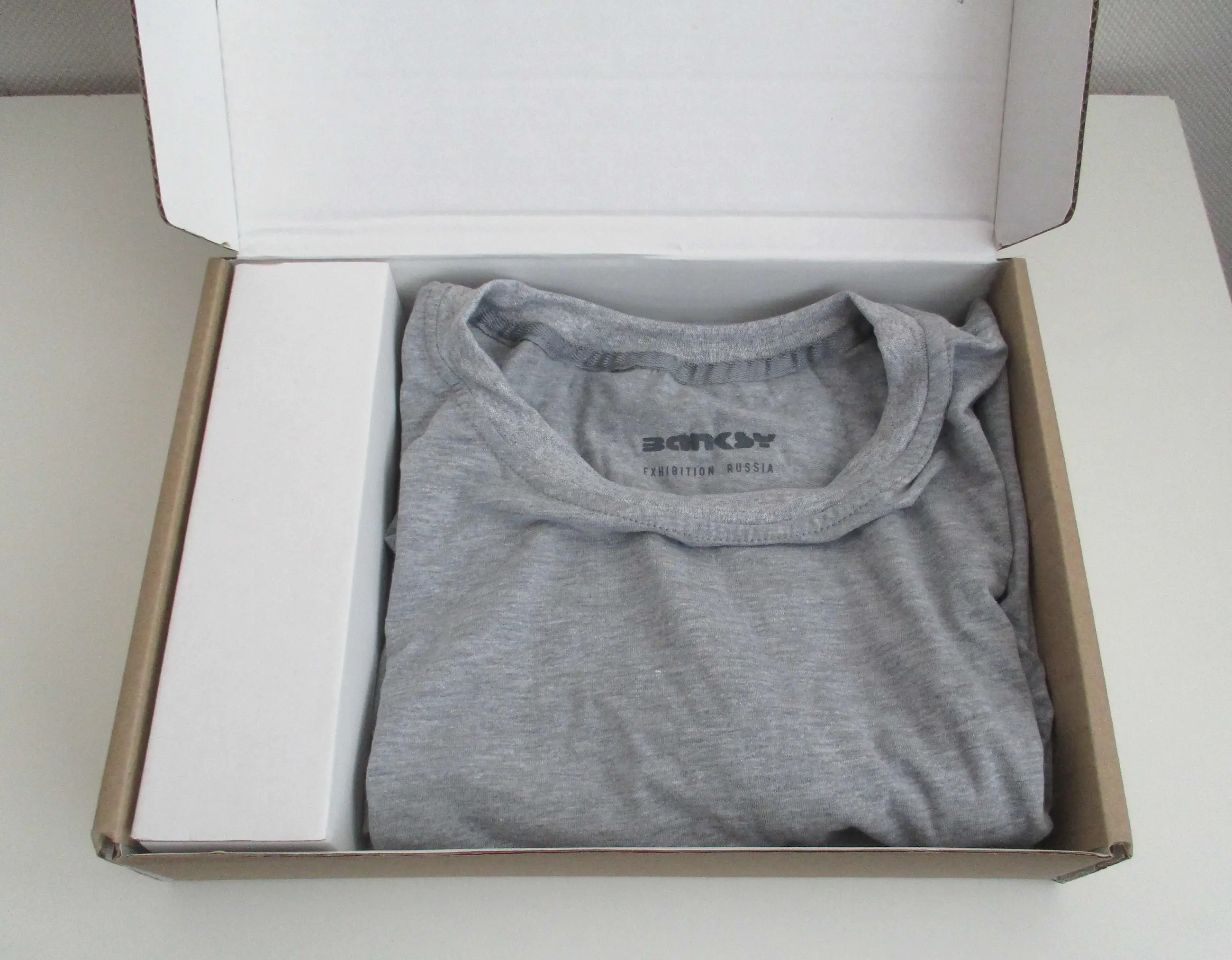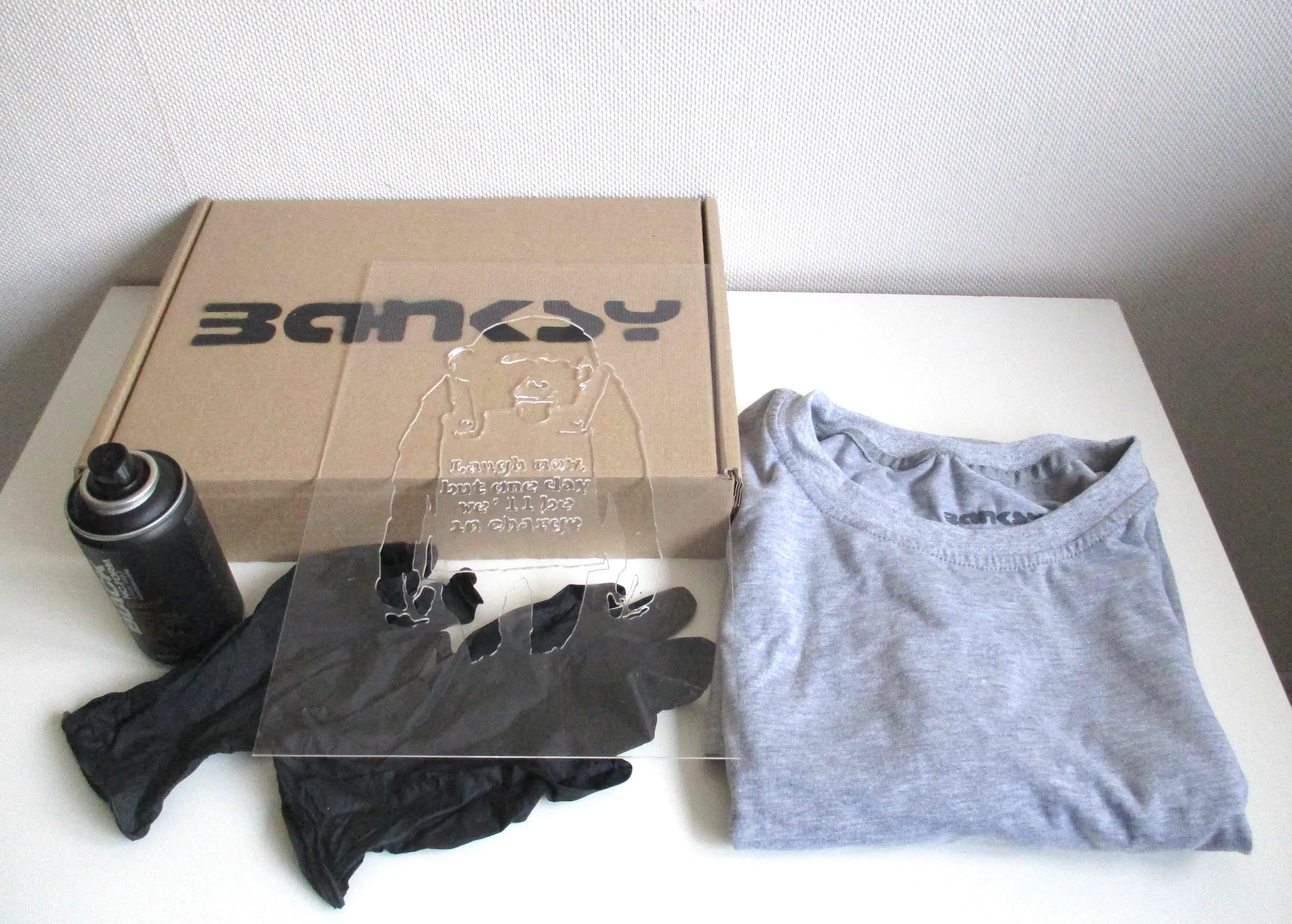 Dit is een stencil kit in beperkte oplage die exclusief werd verkocht tijdens de Banksy Exhibition in Moskou in 2018. Het pakket bevat: 1x Montana Zwart 150ml spuitbus (vol) 1x paar zwarte latex handschoenen 1x BANKSY lichtgrijs large T-shirt (blanco) 1x 'Laugh Now' stencil/sjabloon Afmetingen doos: 33 x 23 x 6,5 cm.