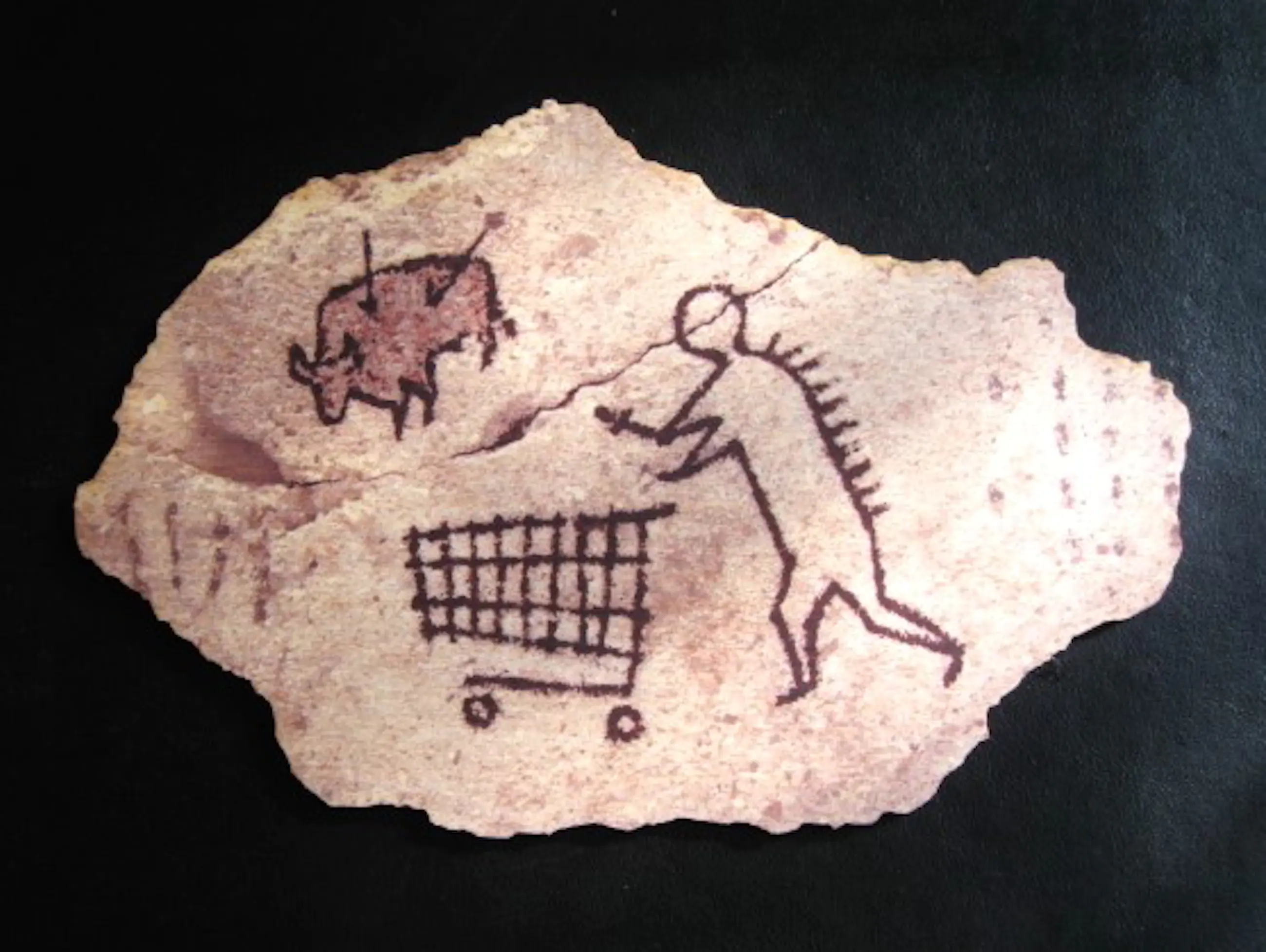 Dit is een houten replica van Banksy's Peckham Rock-muurkunst, met een vermeende prehistorische figuur die een winkelwagentje duwt. Een officieel Banksy-kunstproduct in beperkte oplage.