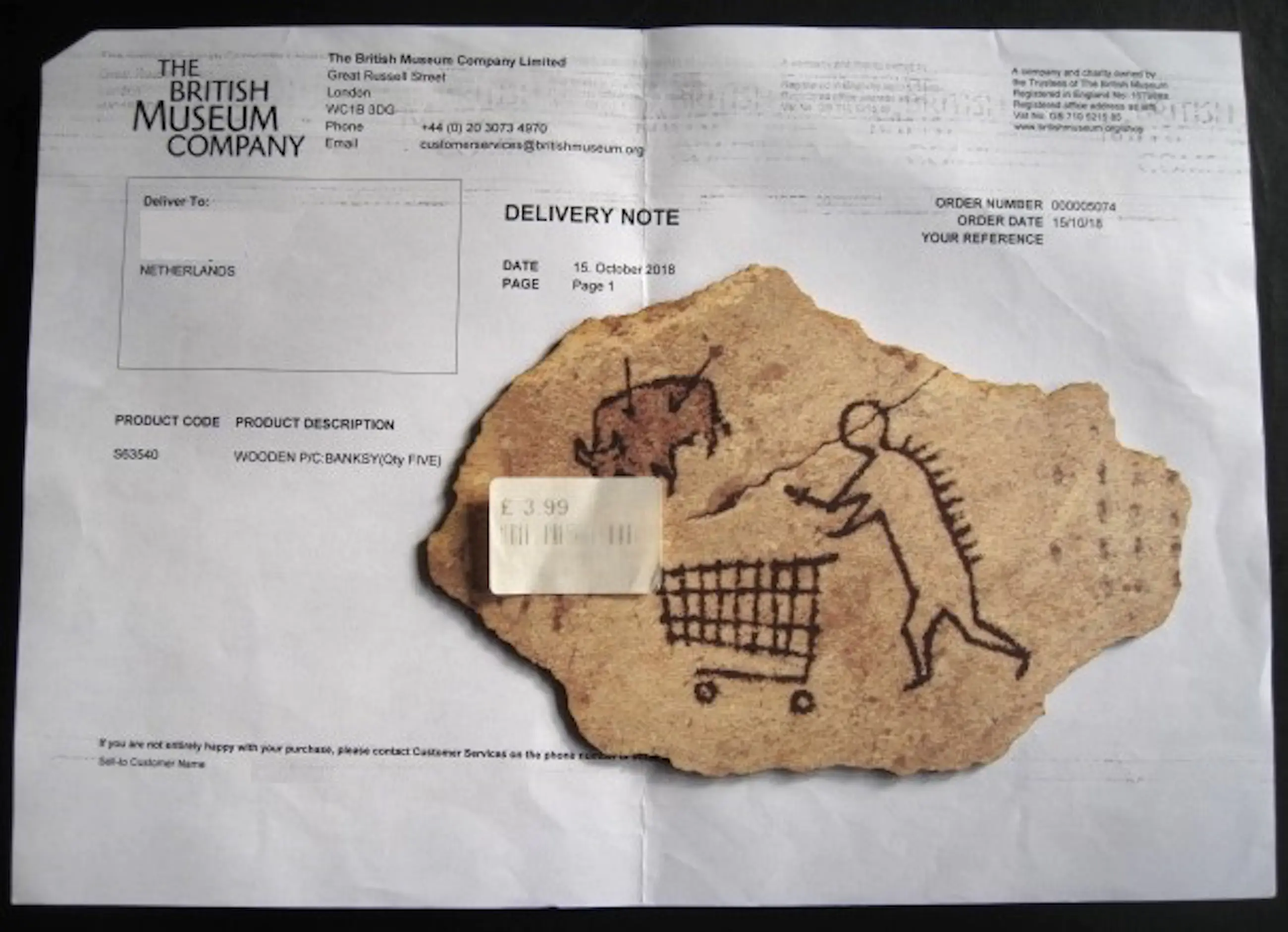 Replica in hout van Banksy's Peckham Rock, in 2005 door de kunstenaar het British Museum binnengesmokkeld als een officiële tentoonstelling.