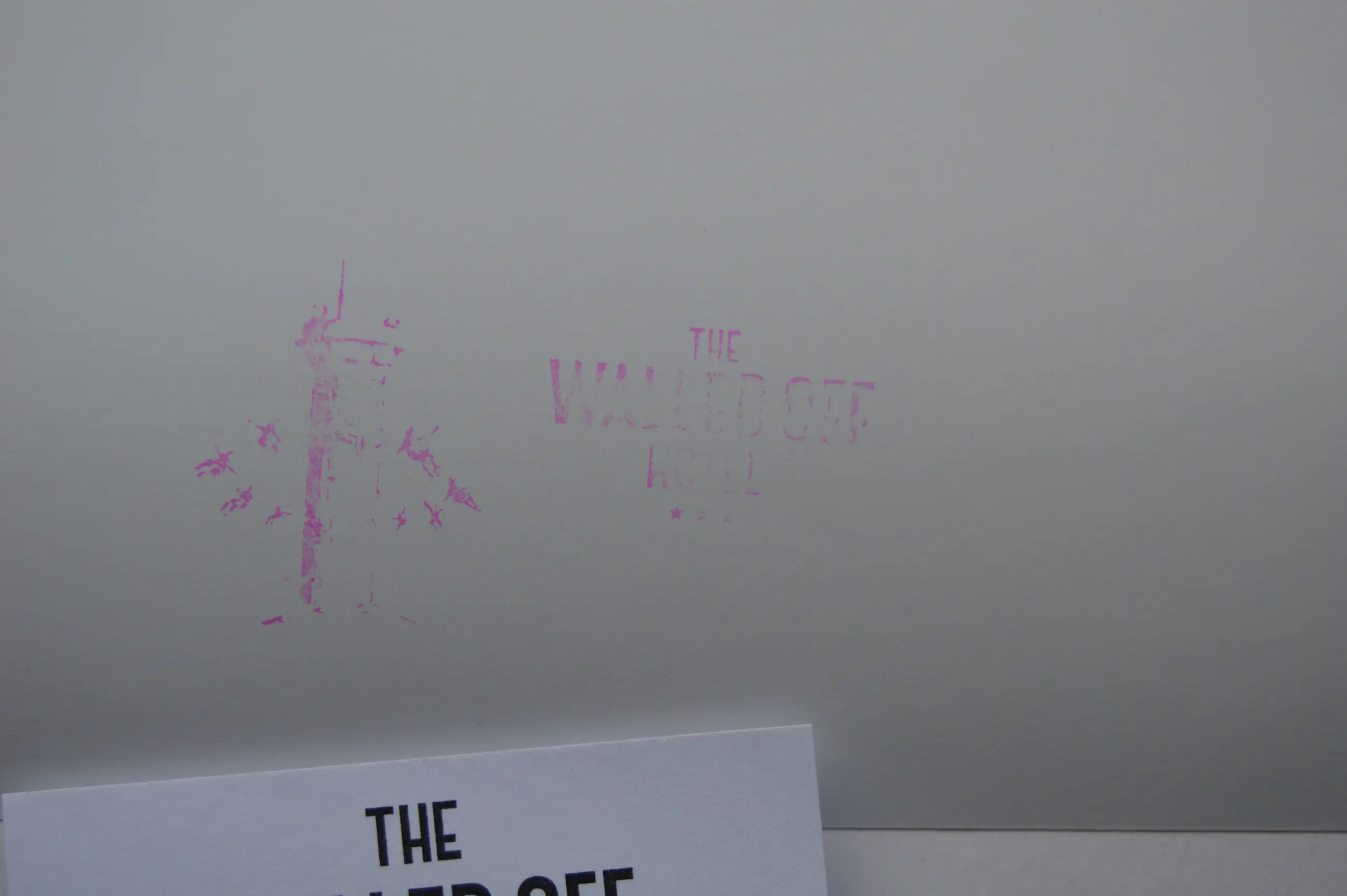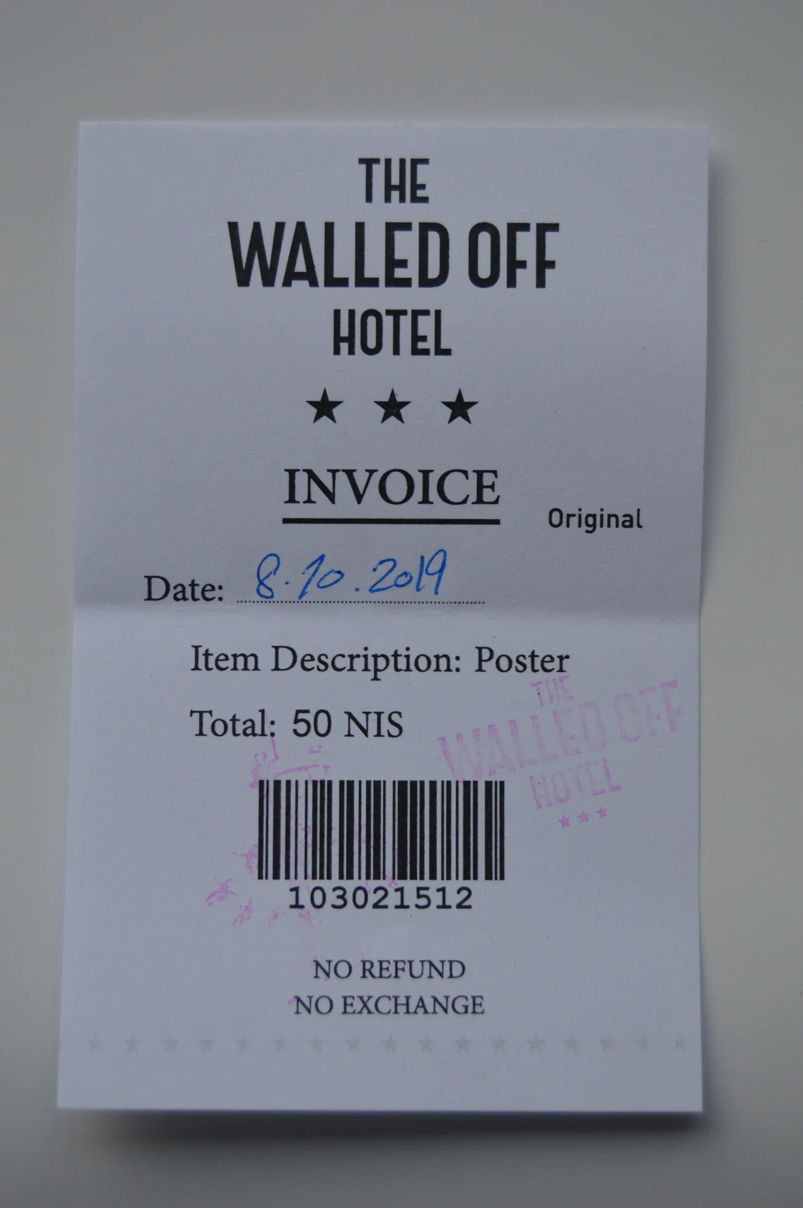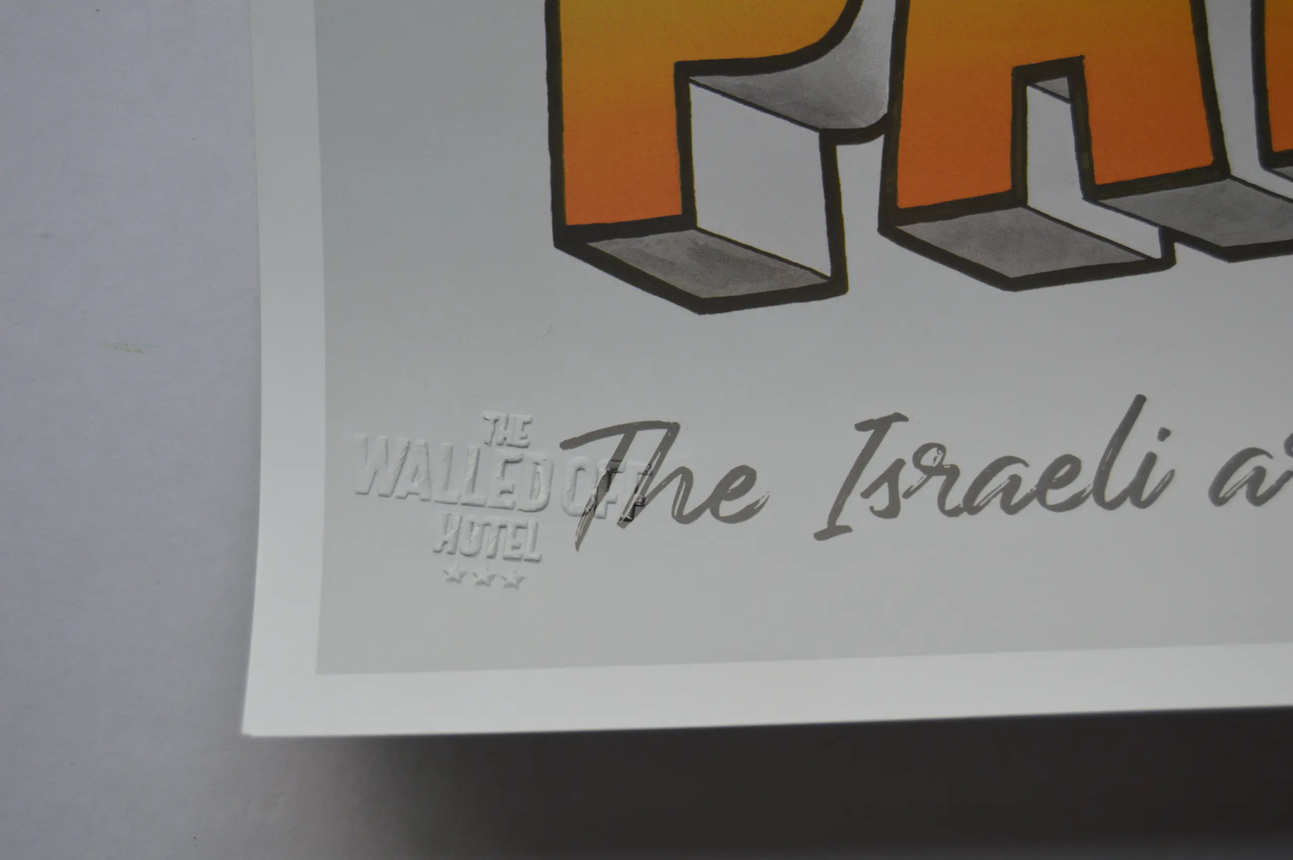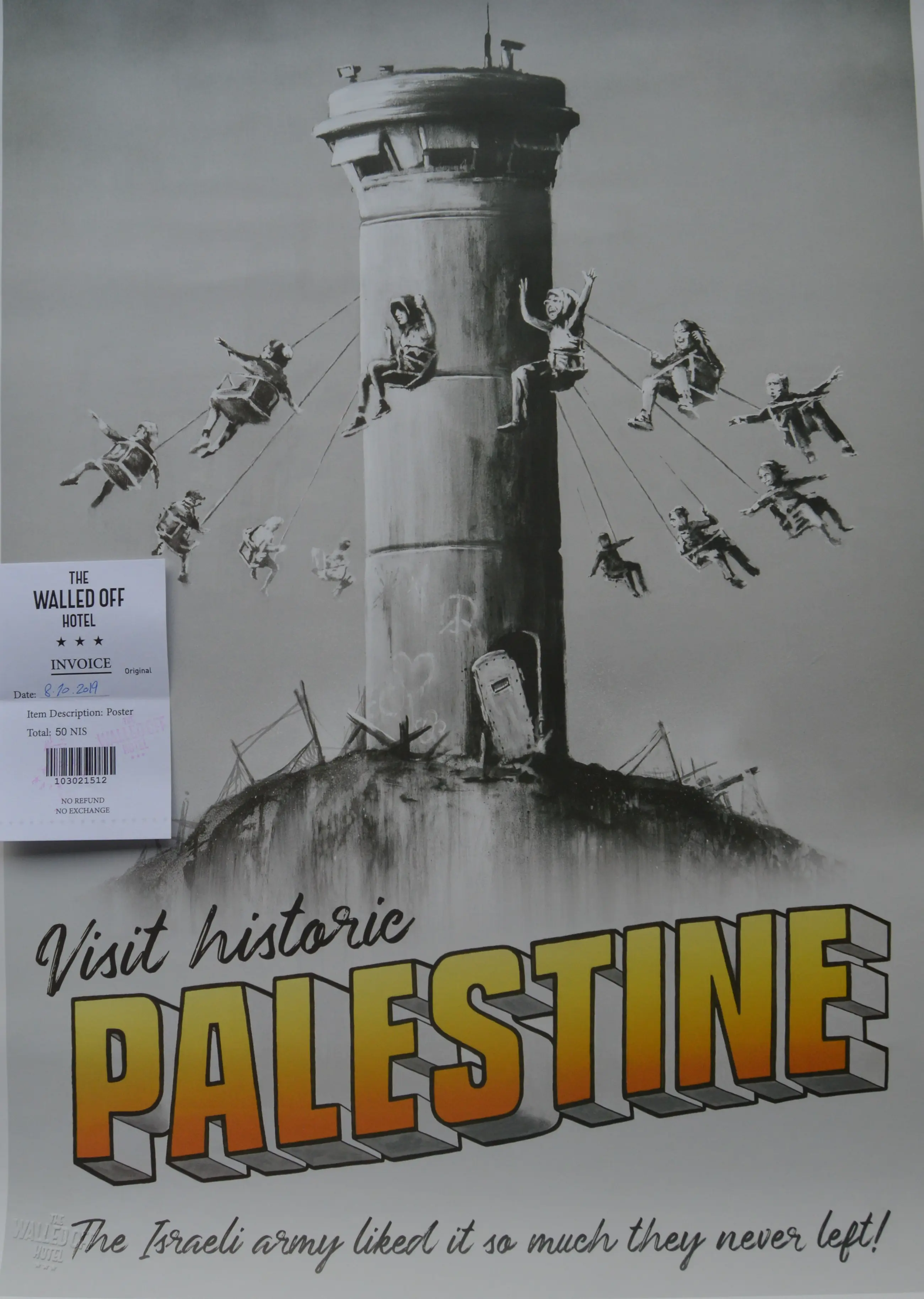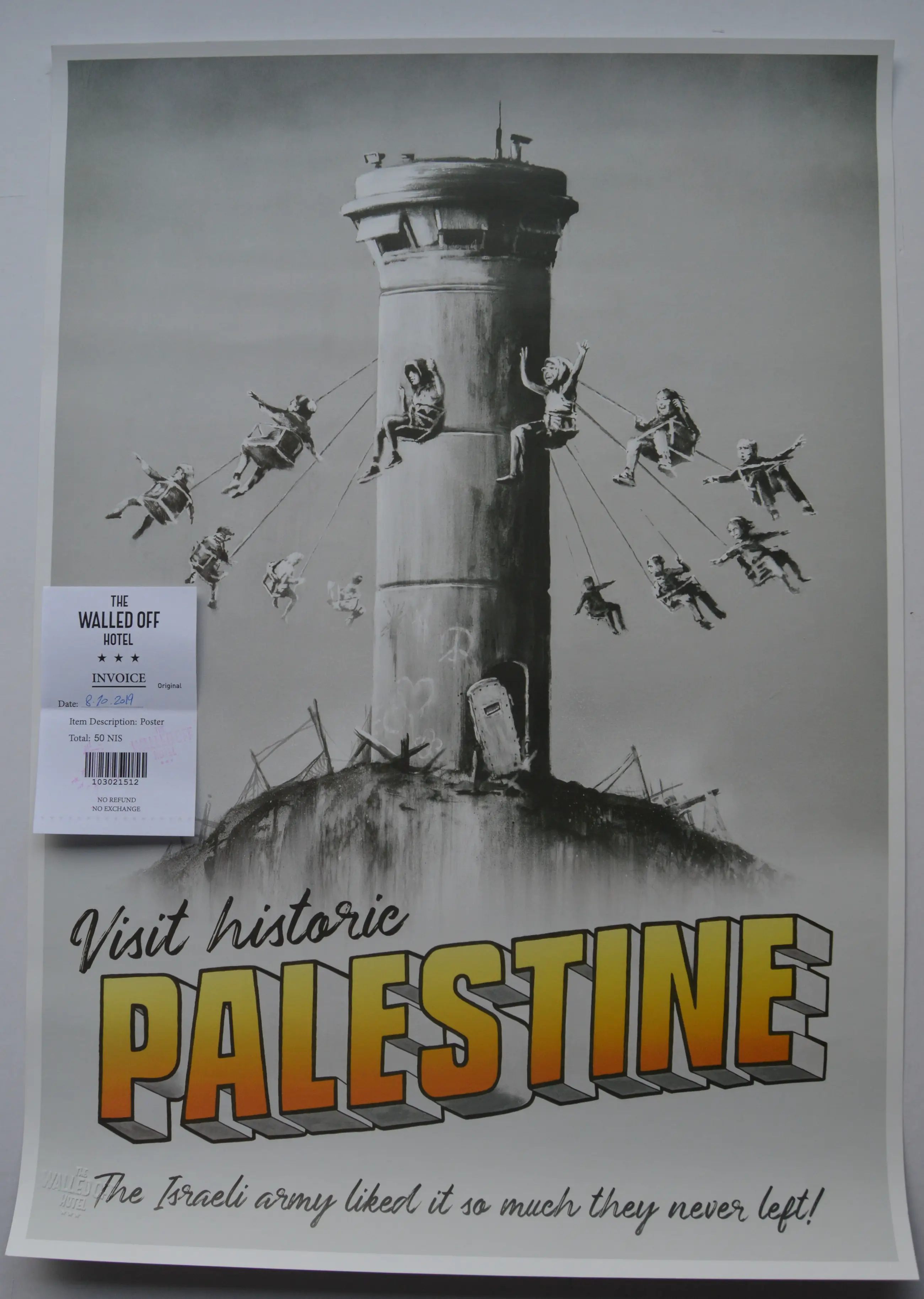 Originele poster uitgegeven op World Travel Market, Excel Centre, Londen, november 2018. Slechts 3000 exemplaren werden geproduceerd voor het evenement en de resterende afdrukken keerden terug naar het Walled Off hotel in Bethlehem. Afmetingen 59 x 41 cm. Inclusief aankoopbon. Met stempel Walled Off hotel. Poster met blindstempel Walled Off hotel en rode stempel achterzijde poster. Verzending aangetekend