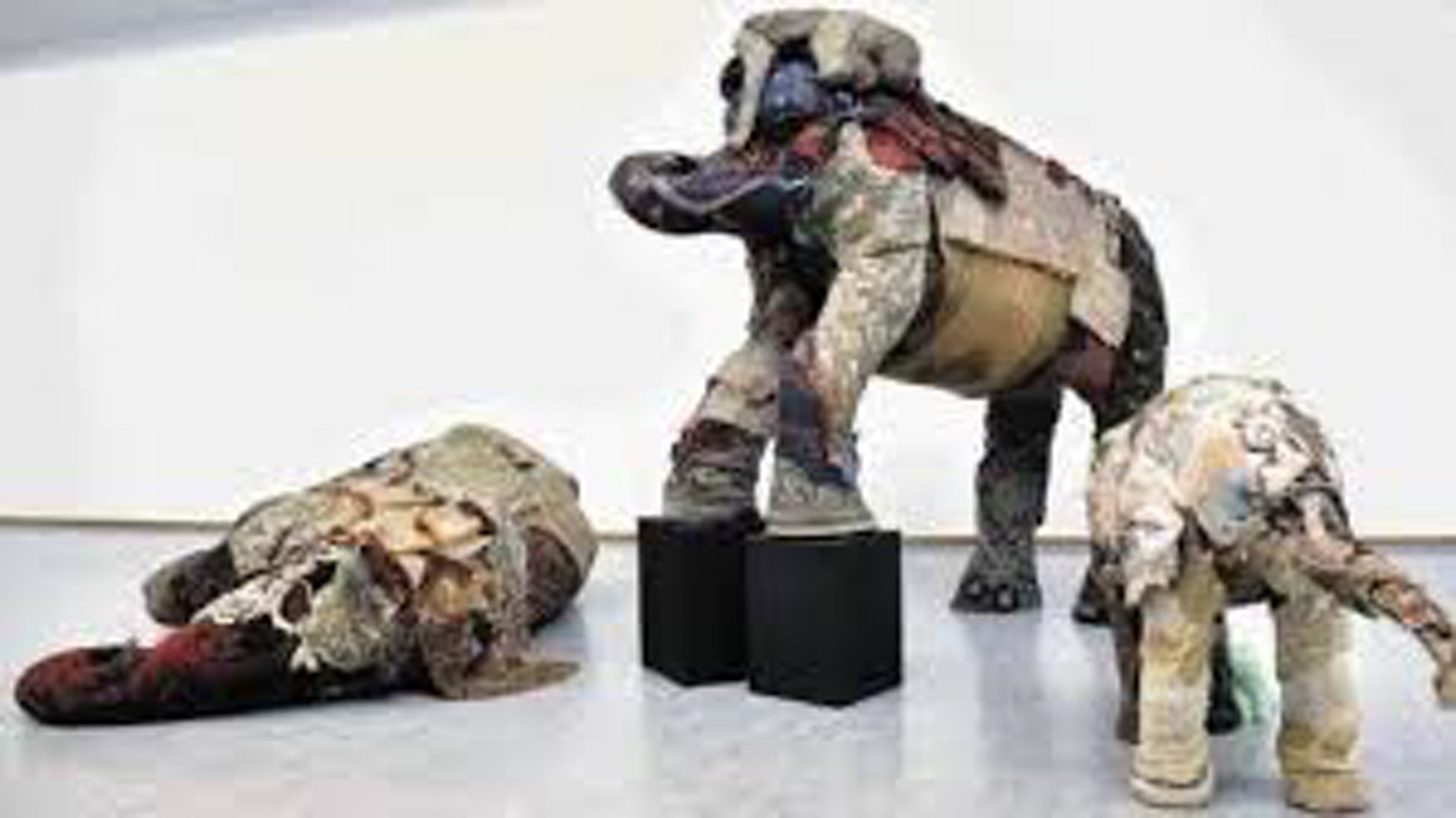 | Bij deze. Het betreft een grote olifant van textiel op een geraamte van gaas en daarnaast een kleine olifant in gebakken groene klei. Beiden door de kunstenaar afgeleverd en onaangeroerd (enkel afgestoft met zorg) geplaatst in een meditatie ruimte | |