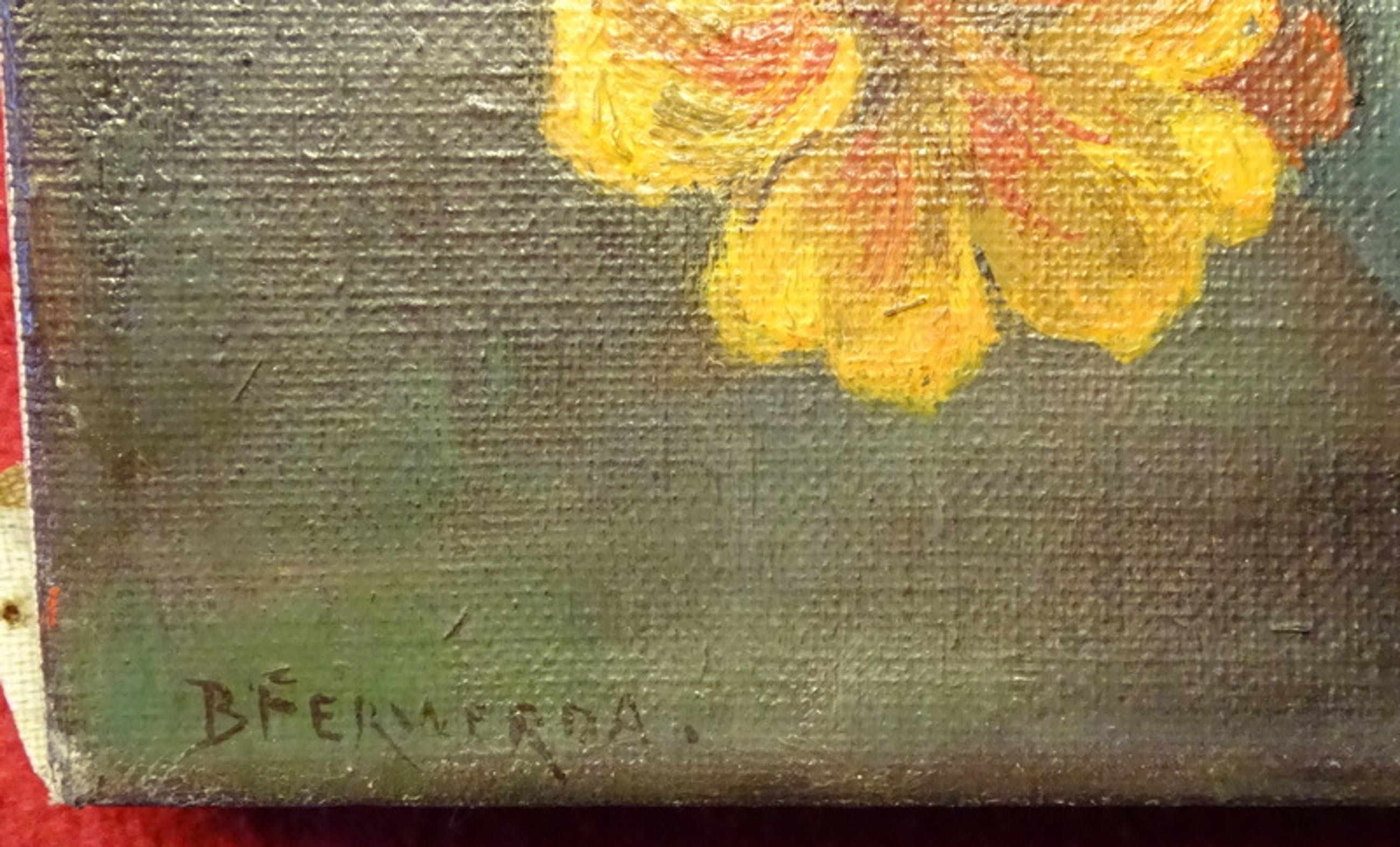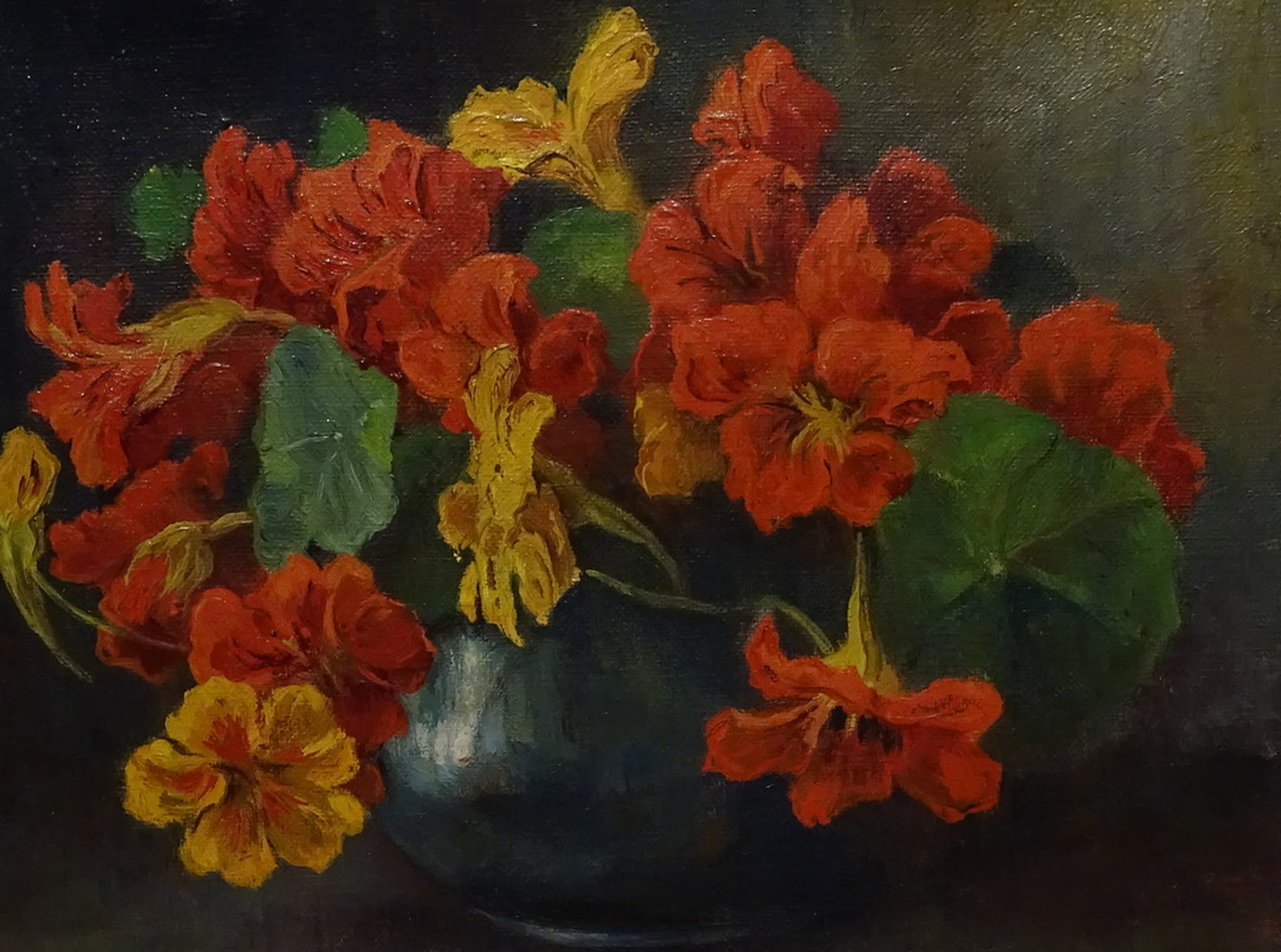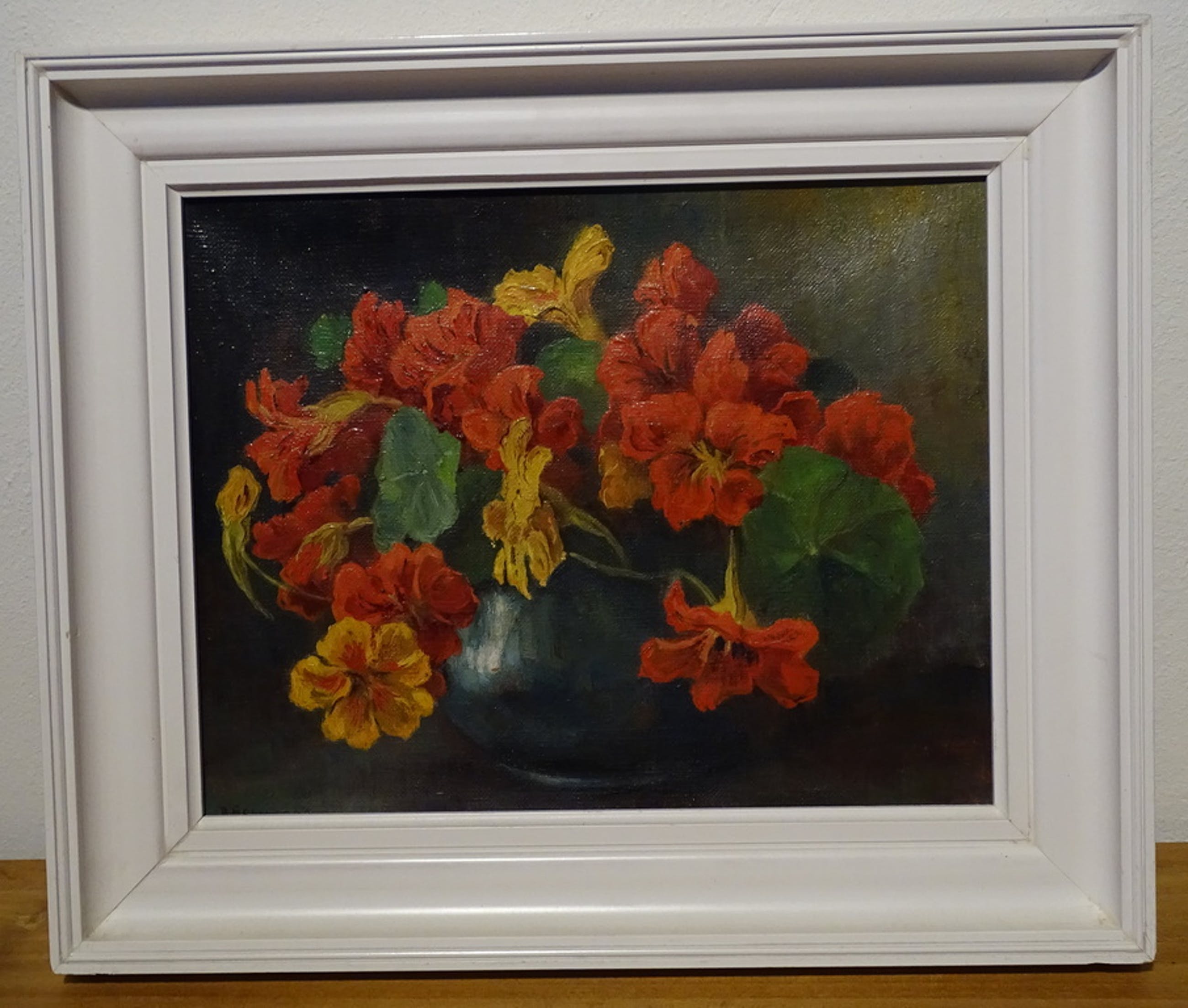 Sfeervol bloemstilleven, linksonder gesigneerd. De signatuur valt voor het grootste deel onder de lijst. Het werk is in prima staat en kan zo aan de muur.