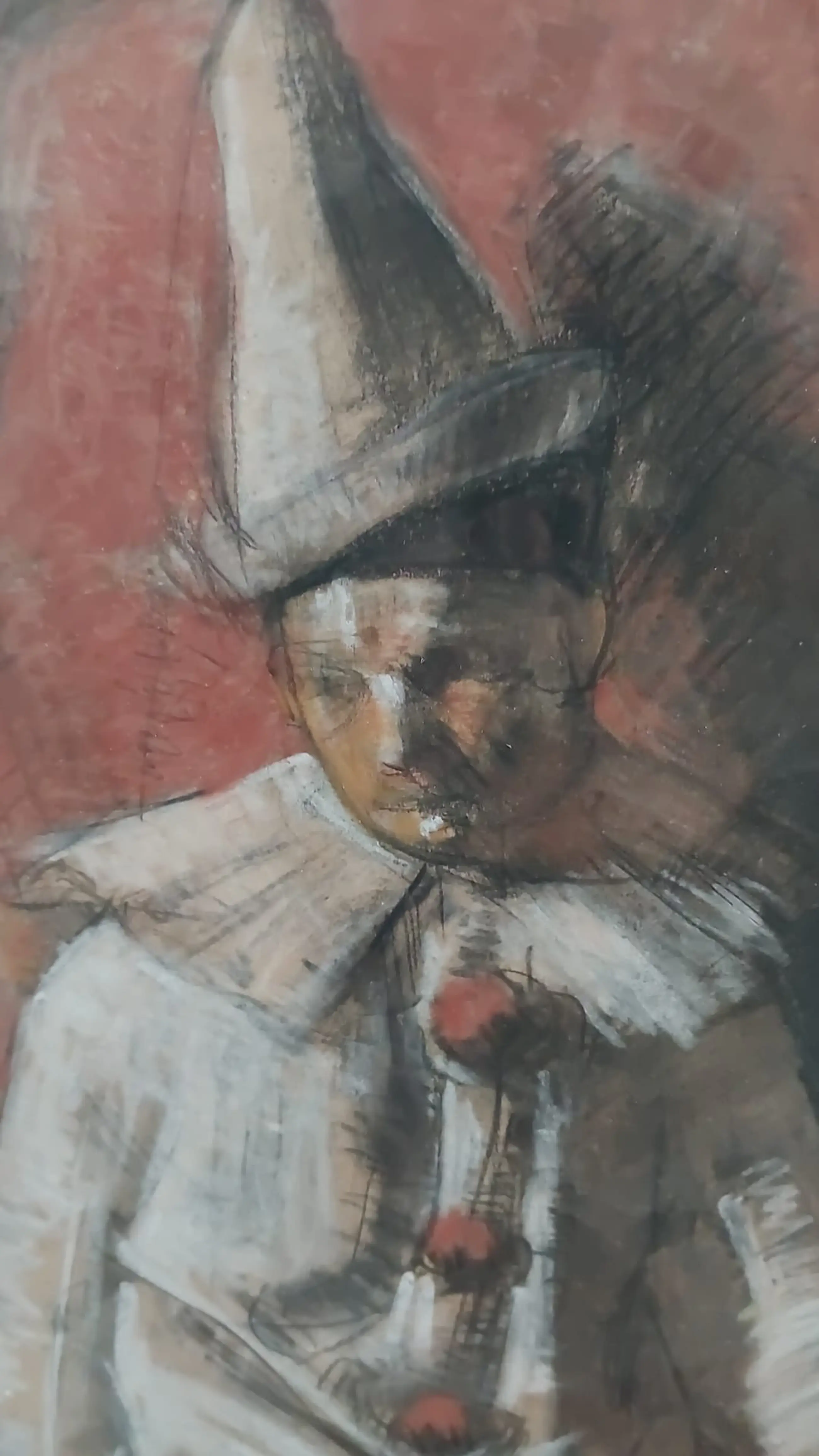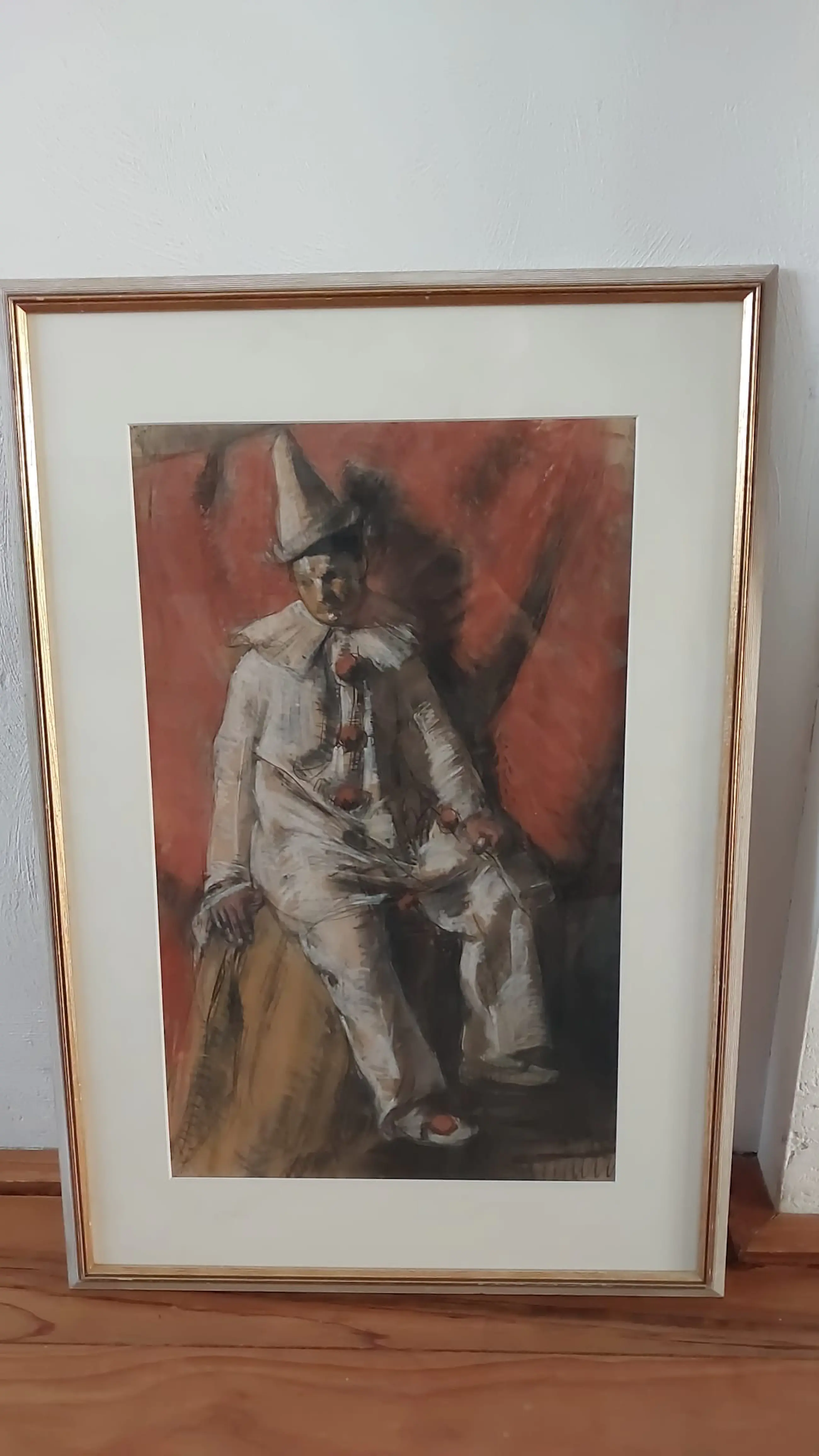 In krijt opgezet figuur van een treurige clown. Onderdeel van de stroming St Lucas Amsterdam