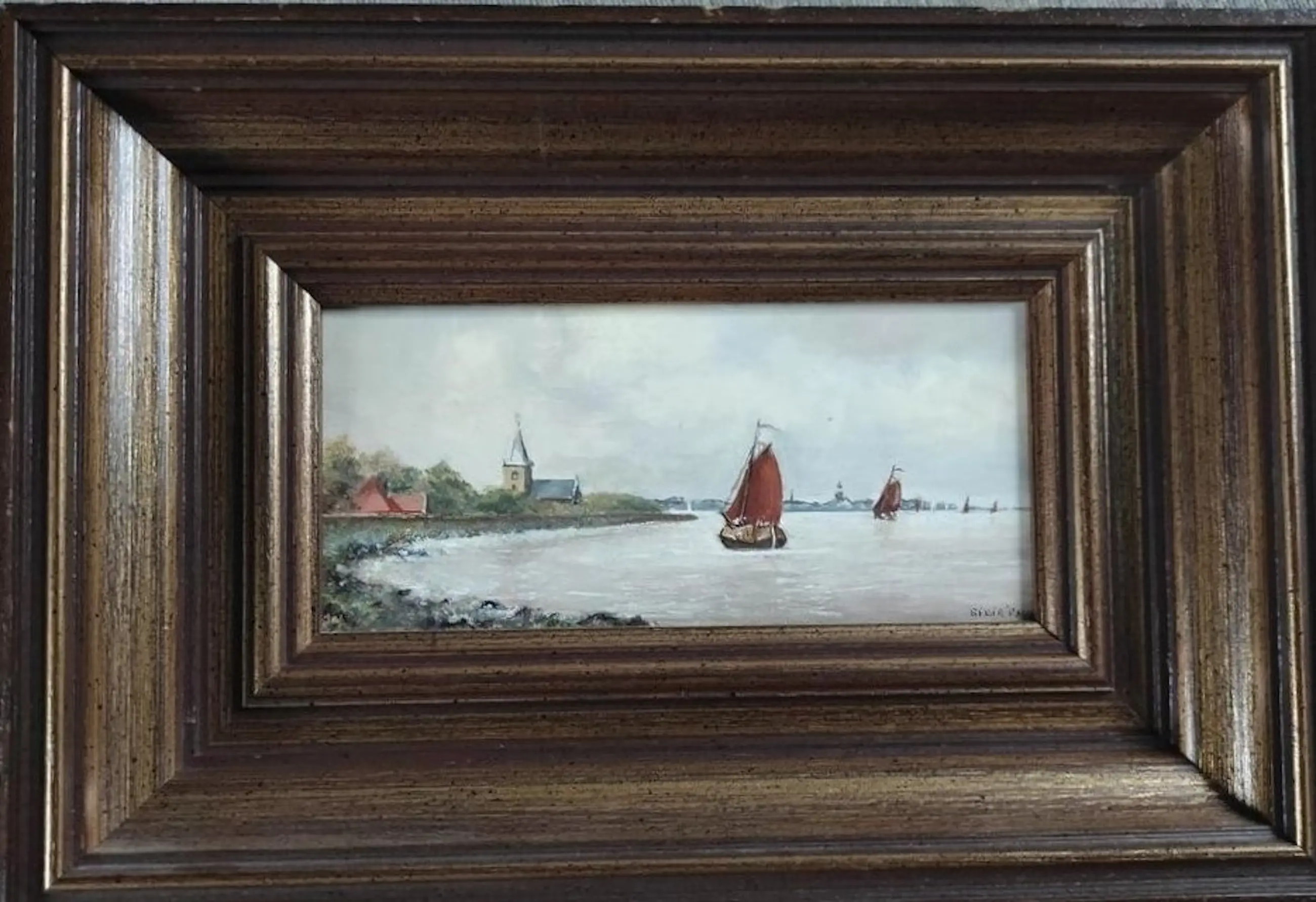Het schilderij ''Gezicht op Enkhuizen'' van Barend Sibie is een olieverf op paneel. Het schilderij is handgesigneerd en ingelijst in een mooie gouden lijst. De afmetingen van de lijst zijn 20 x 4,5 x 30 cm. (hxbxl). De afbeelding meet 18 x 8 cm. Beiden zijn in goede staat.