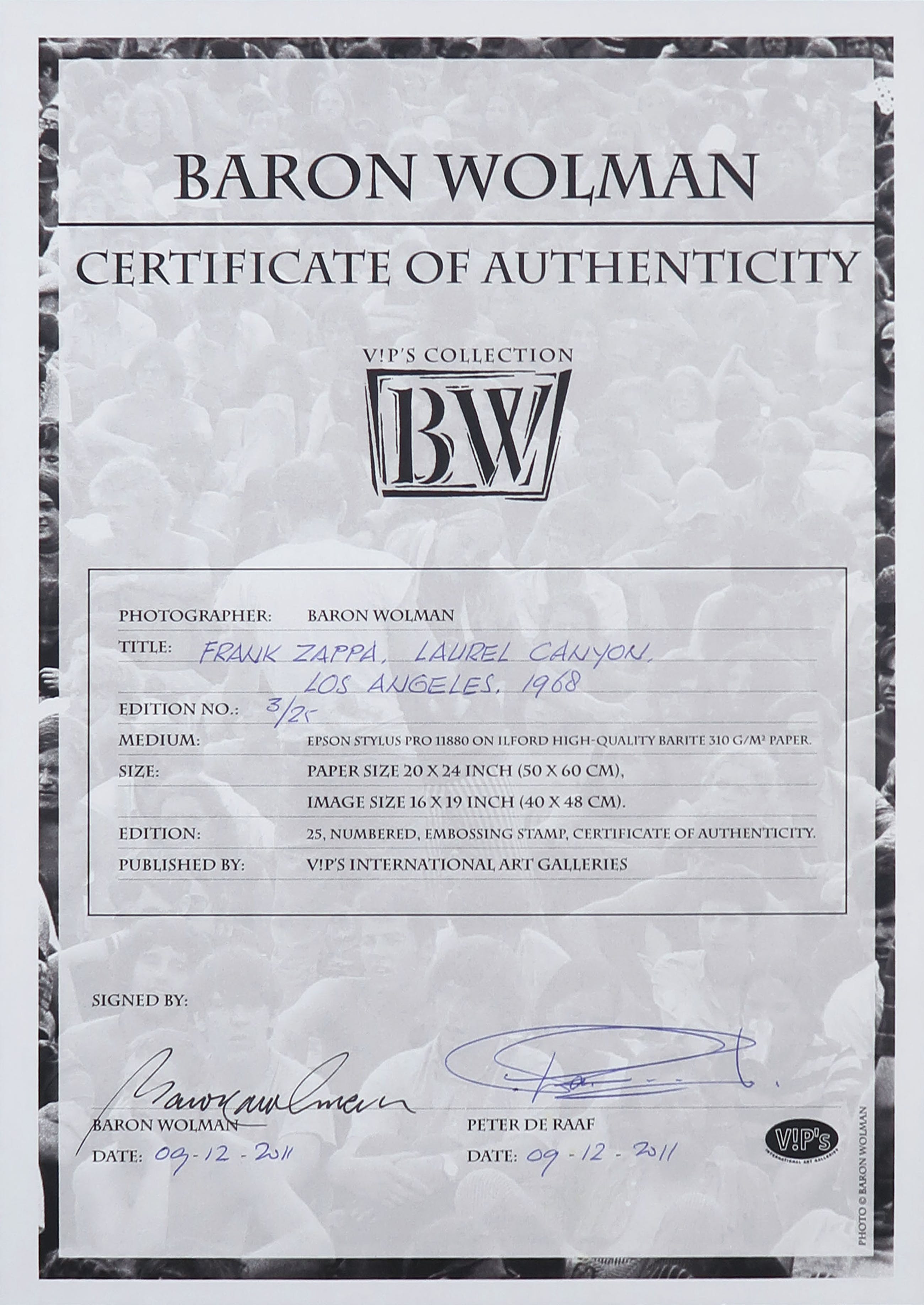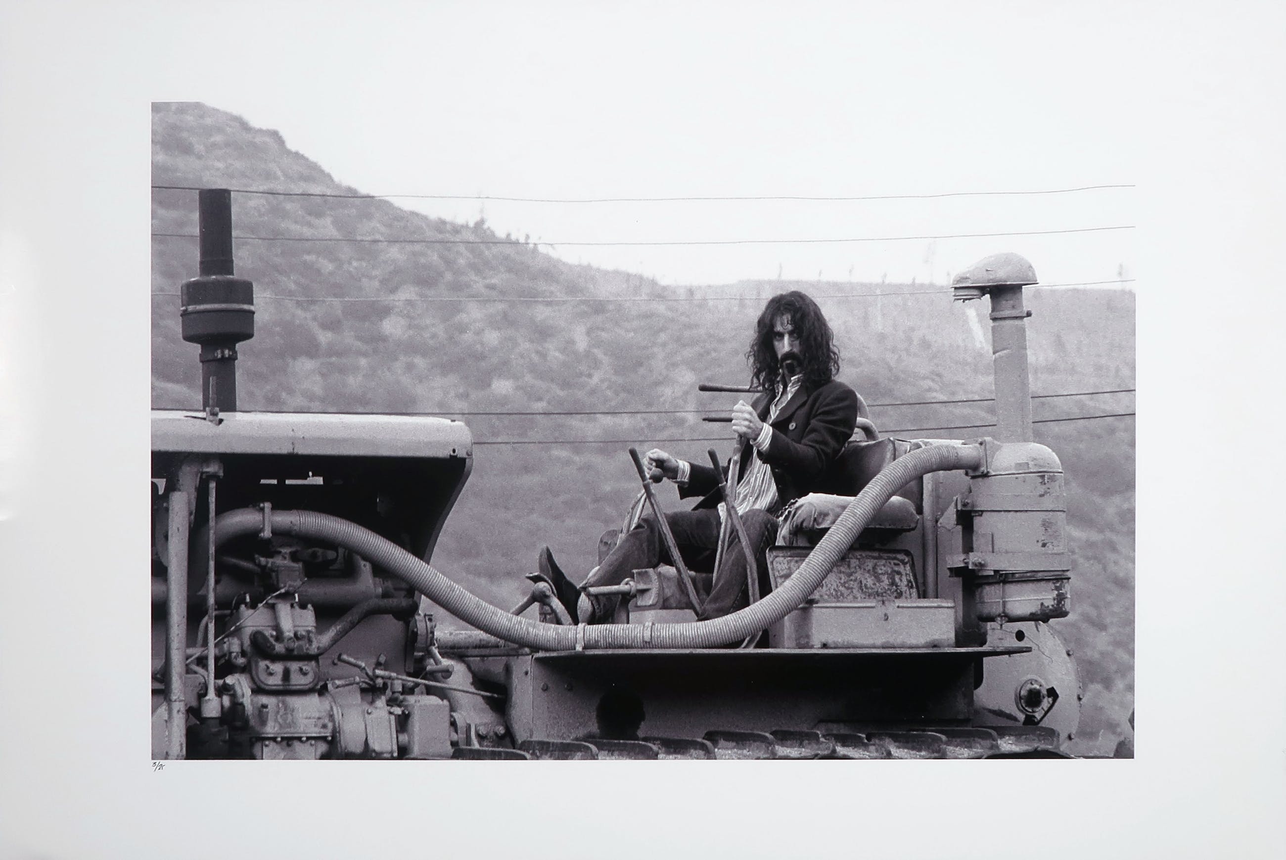 Foto van Frank Zappa, op een bulldozer, in Laurel Canyon, Los Angeles in 1968. De foto wordt geleverd inclusief een certificaat van echtheid. De foto is ongesigneerd, maar wel voorzien van een blindstempel van de fotograaf.