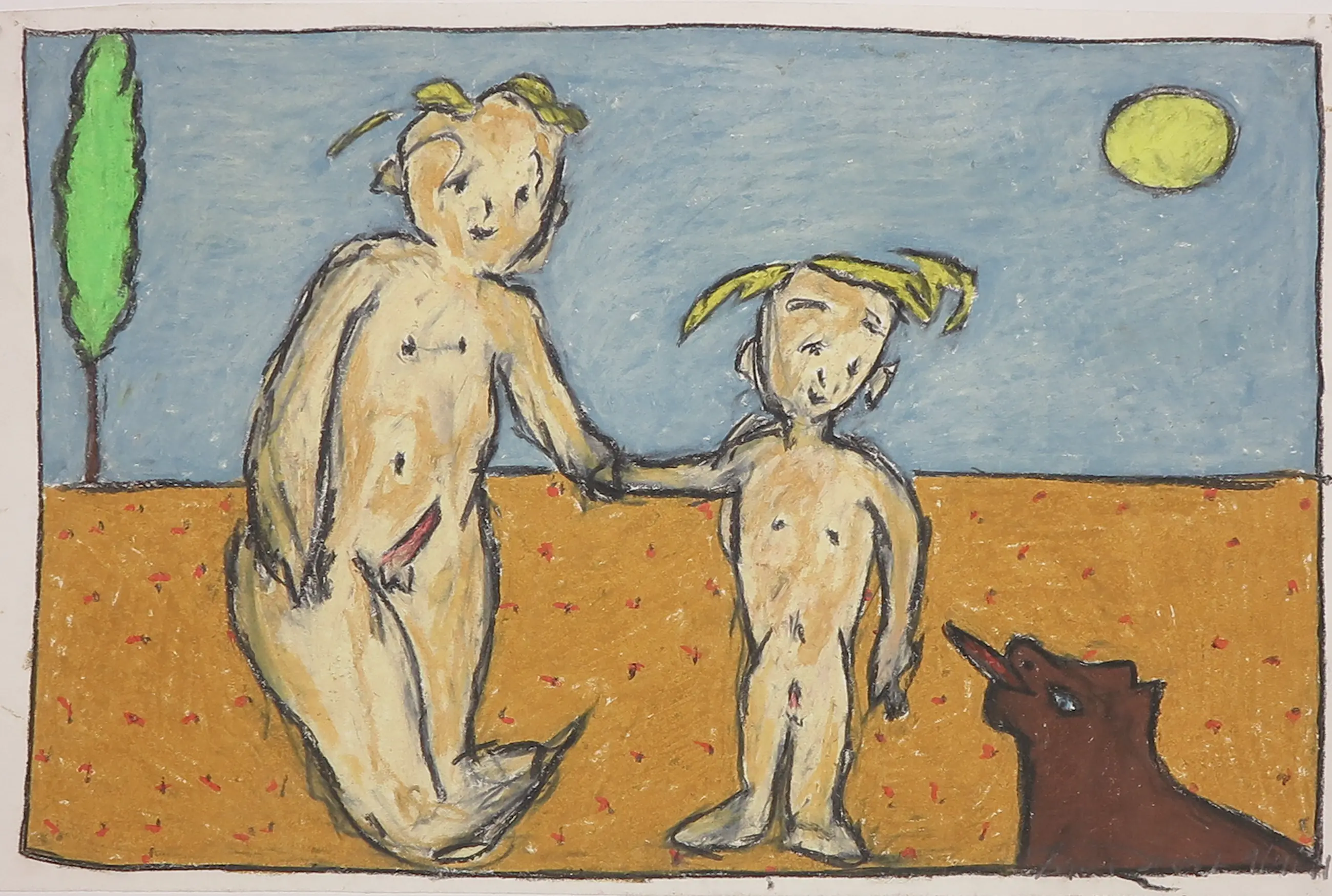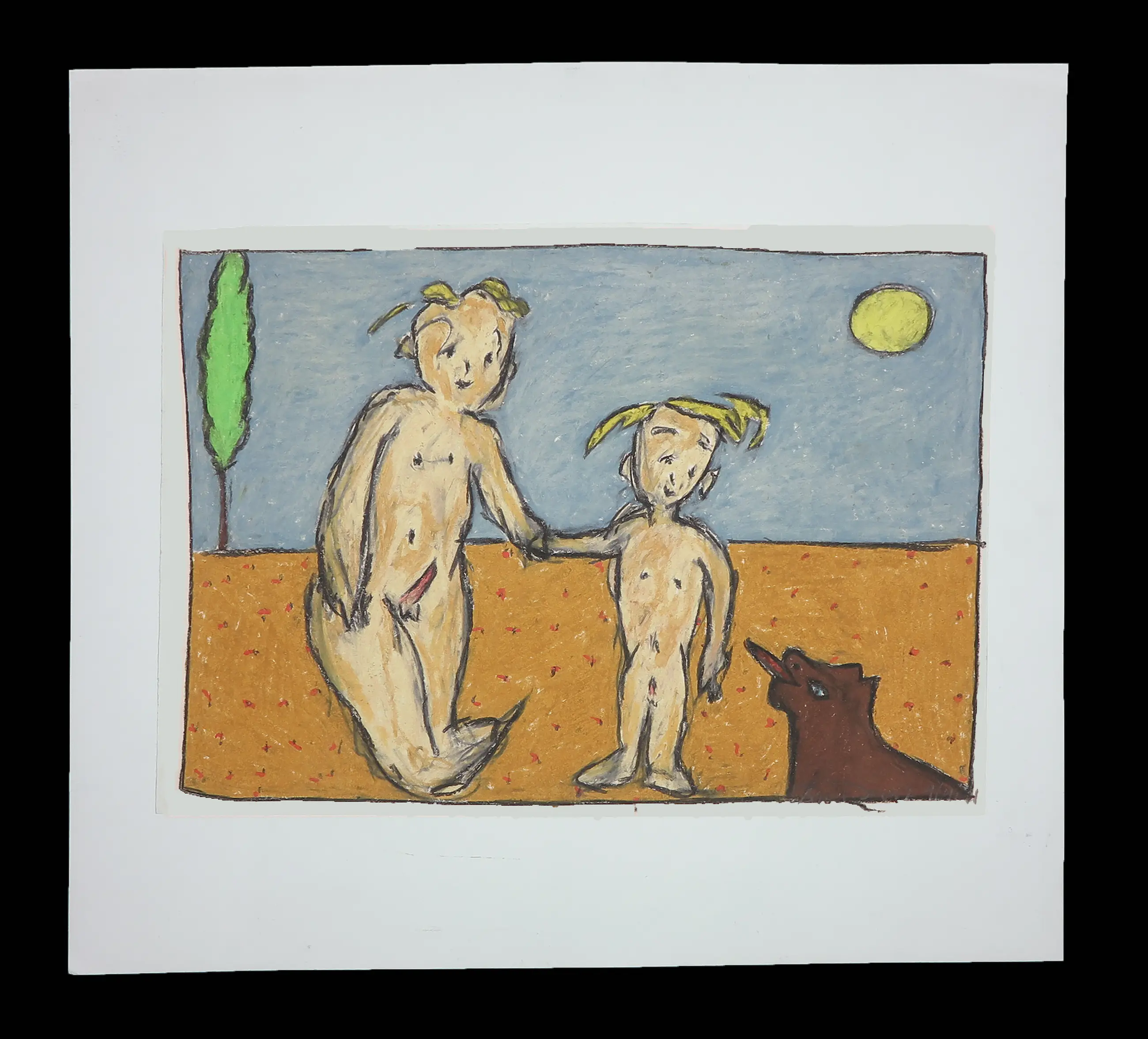 Originele krijttekening van Nederlandse kunstenaar Bart Drost van vermoedelijk vader en zoon.
