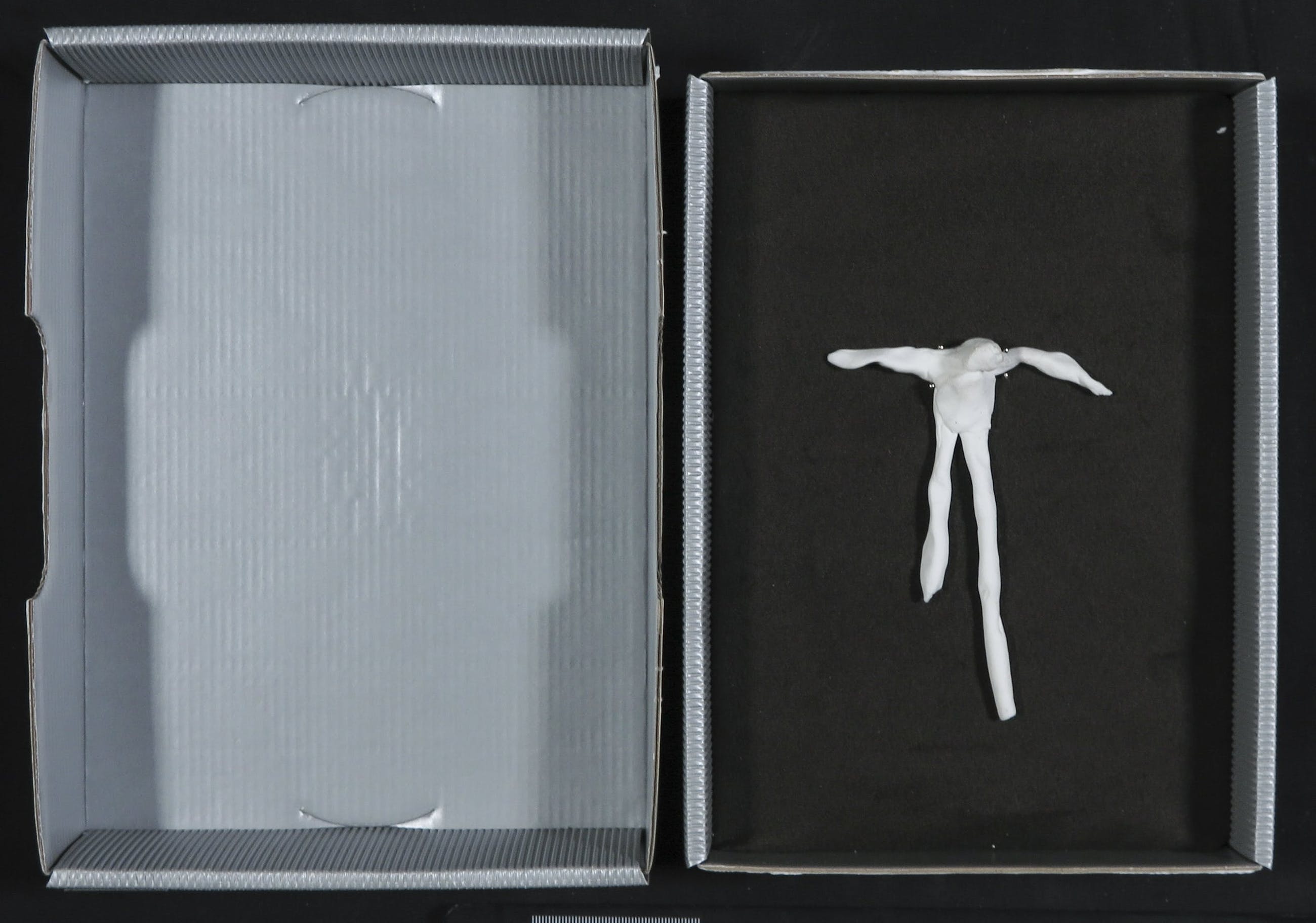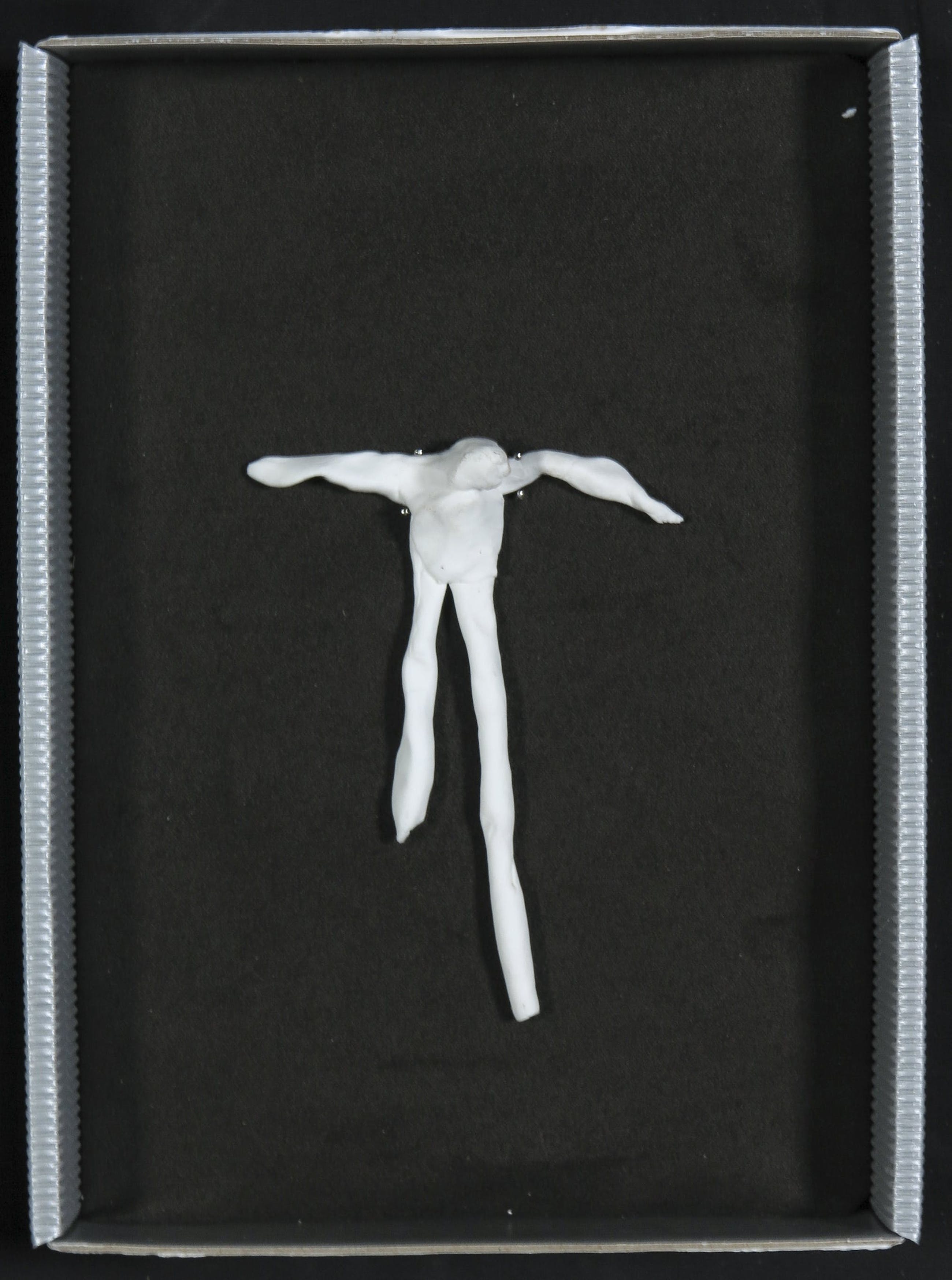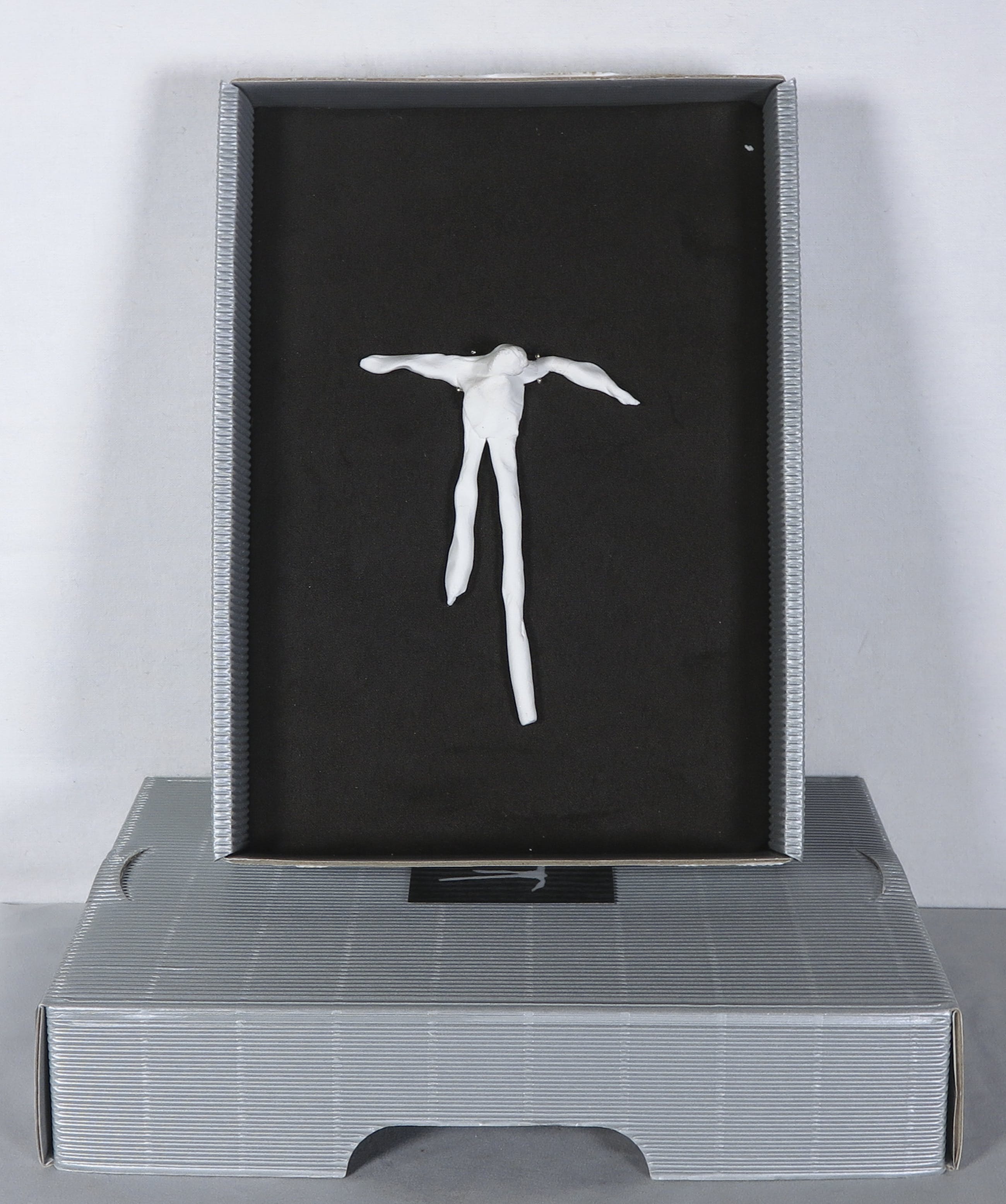 Klein porseleinen figuur in een kartonnen box. Bart Drost vervaardigde het figuur - als onderdeel van een grotere serie - tijdens zijn residentie in het Europees keramisch werkcentrum in Den Bosch in 2007. De serie omvat ca. 100 fragiele figuren; variaties op de lijdende Jezusfiguur.