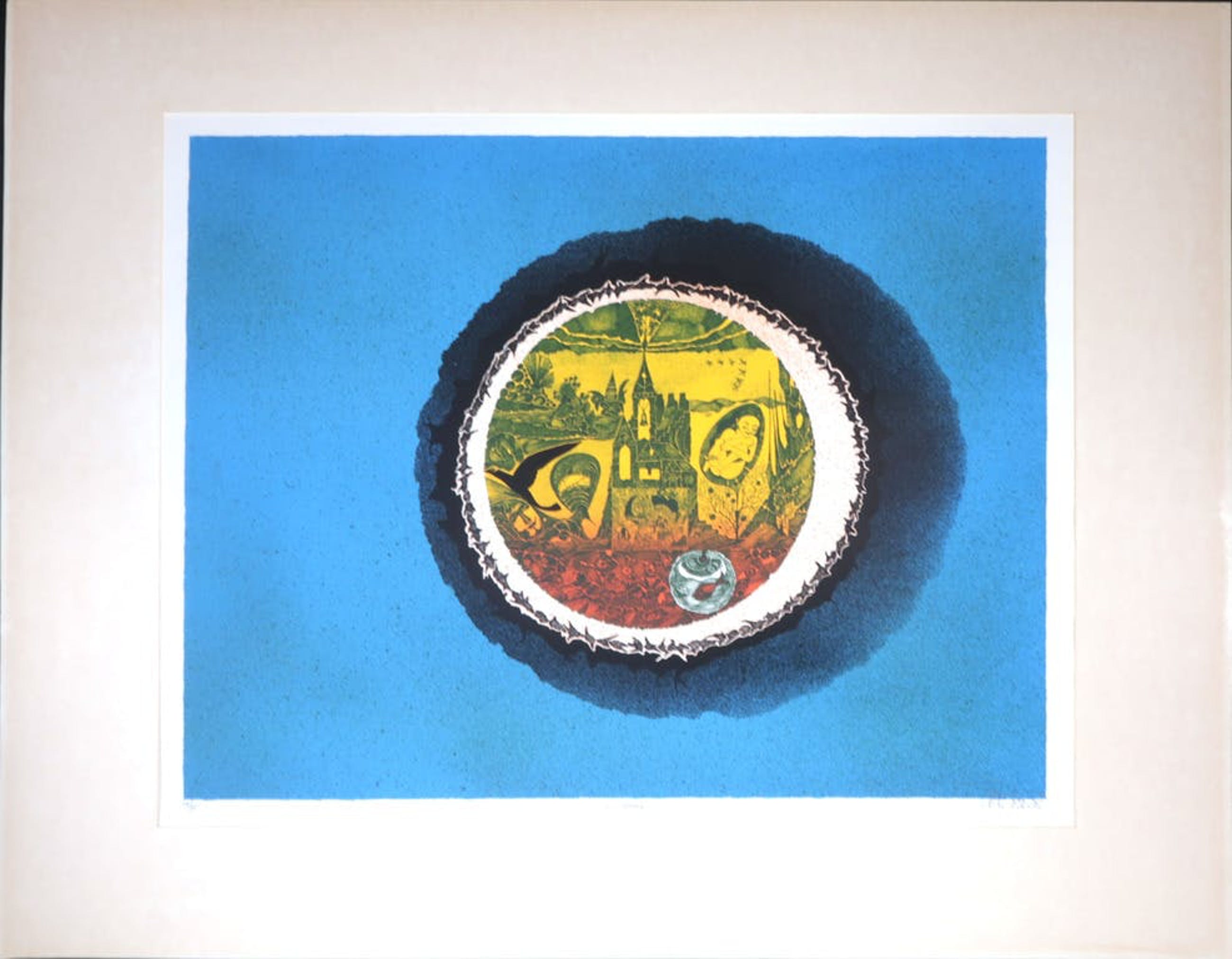 Materiaal: Zeefdruk op papier, bevestigd achter passe-partout