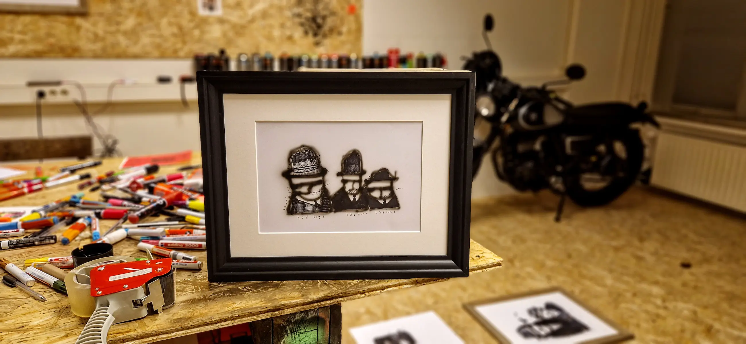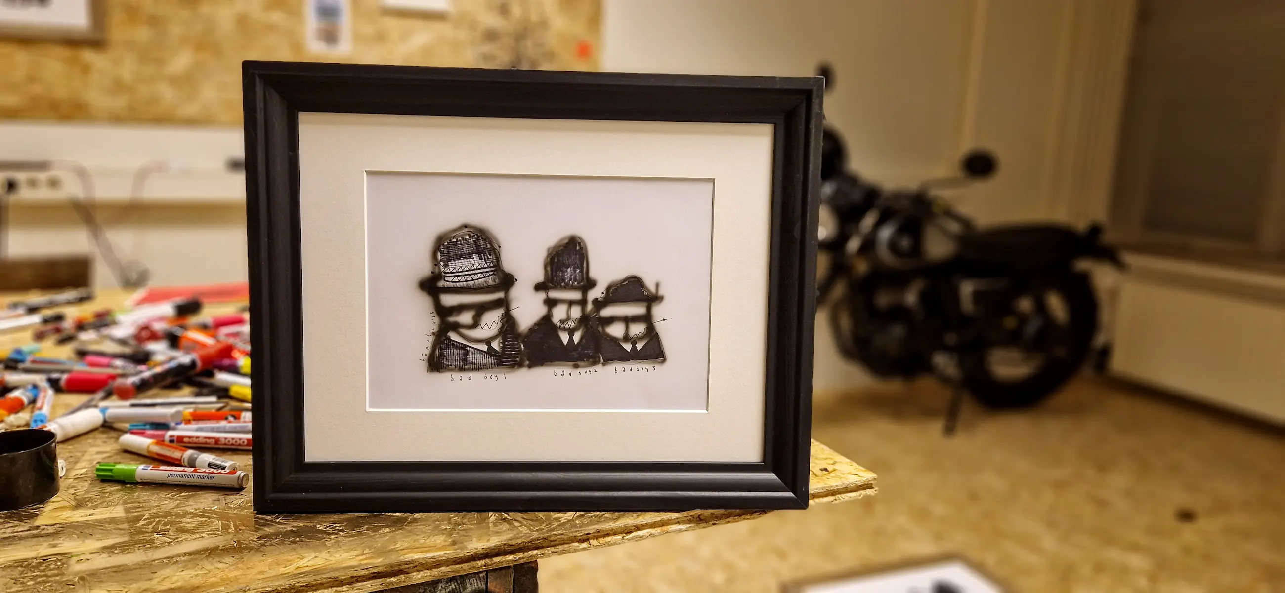 Orginele illustratie tekening van de Nederlandse kunstschilder/illustrator Bart Hamelink. Illustratie tekening van 3 boys. Gemaakt met air brush , marker en inkt .De kunstenaar heeft zijn kunstopleiding afgerond in Delft ( Nederland) hij gebruikt vaak verschillende technieken in zijn werken. Waar onder graffiti, air brush , marker, inkt, acrylverf, . Zijn thema's zijn vaak mensen en dieren. Hij heeft een voor liefde naar het schilderen van portretten. Maat op dit moment houd hij zich meer bezig met de illustratie s van figuren.
