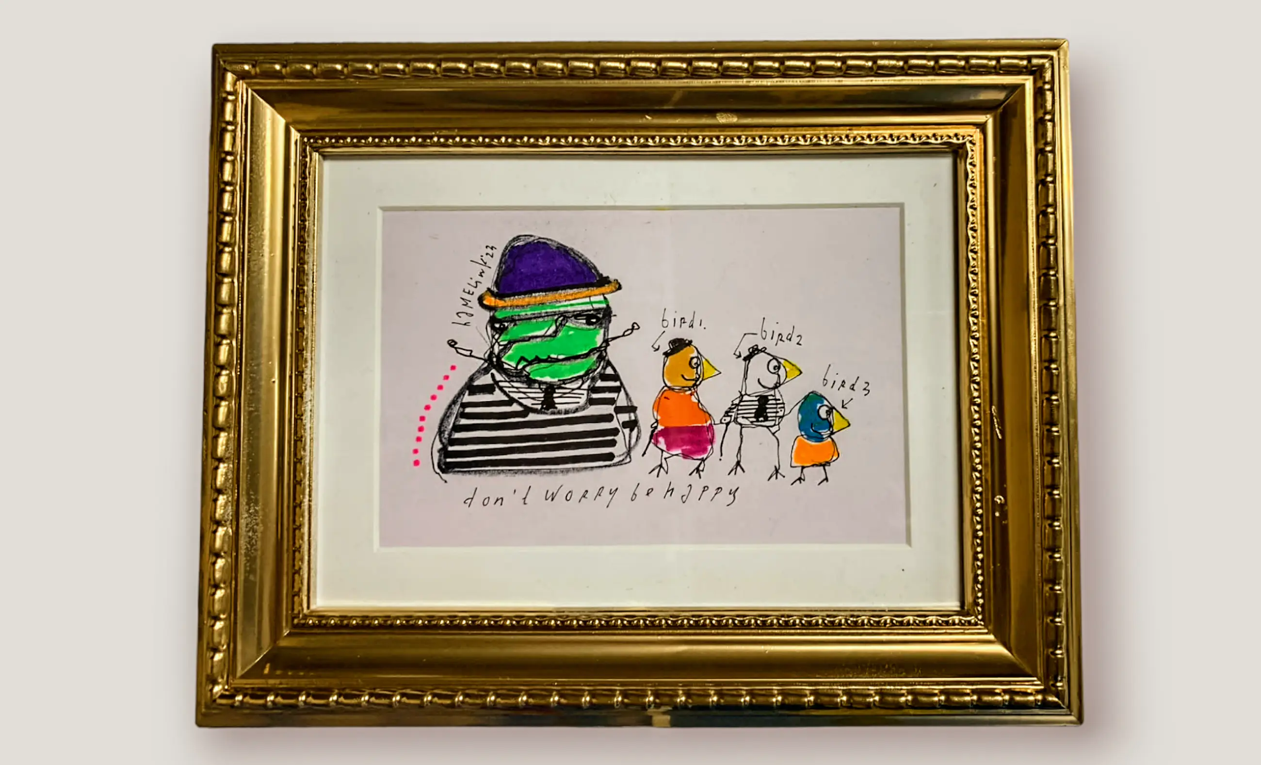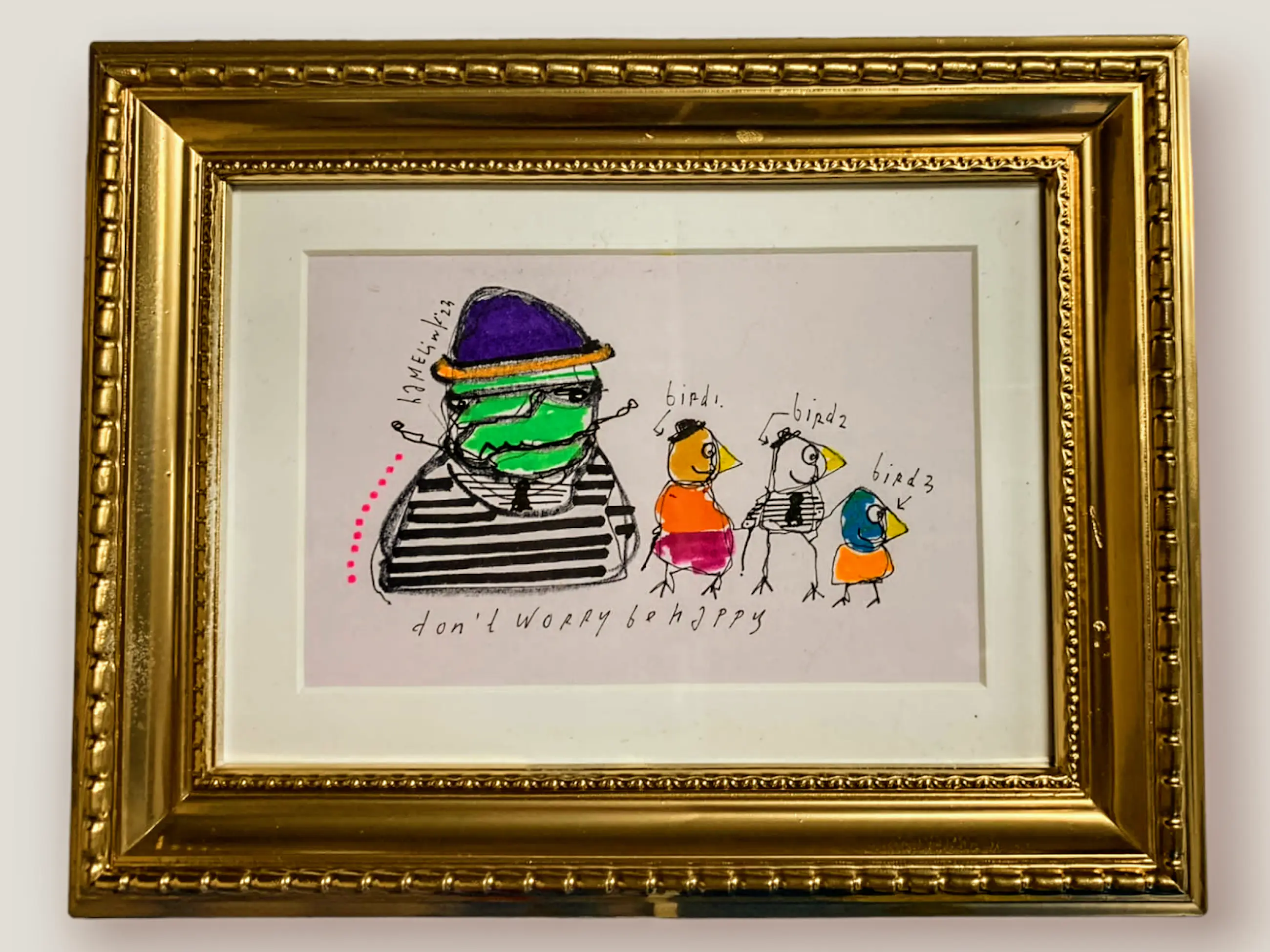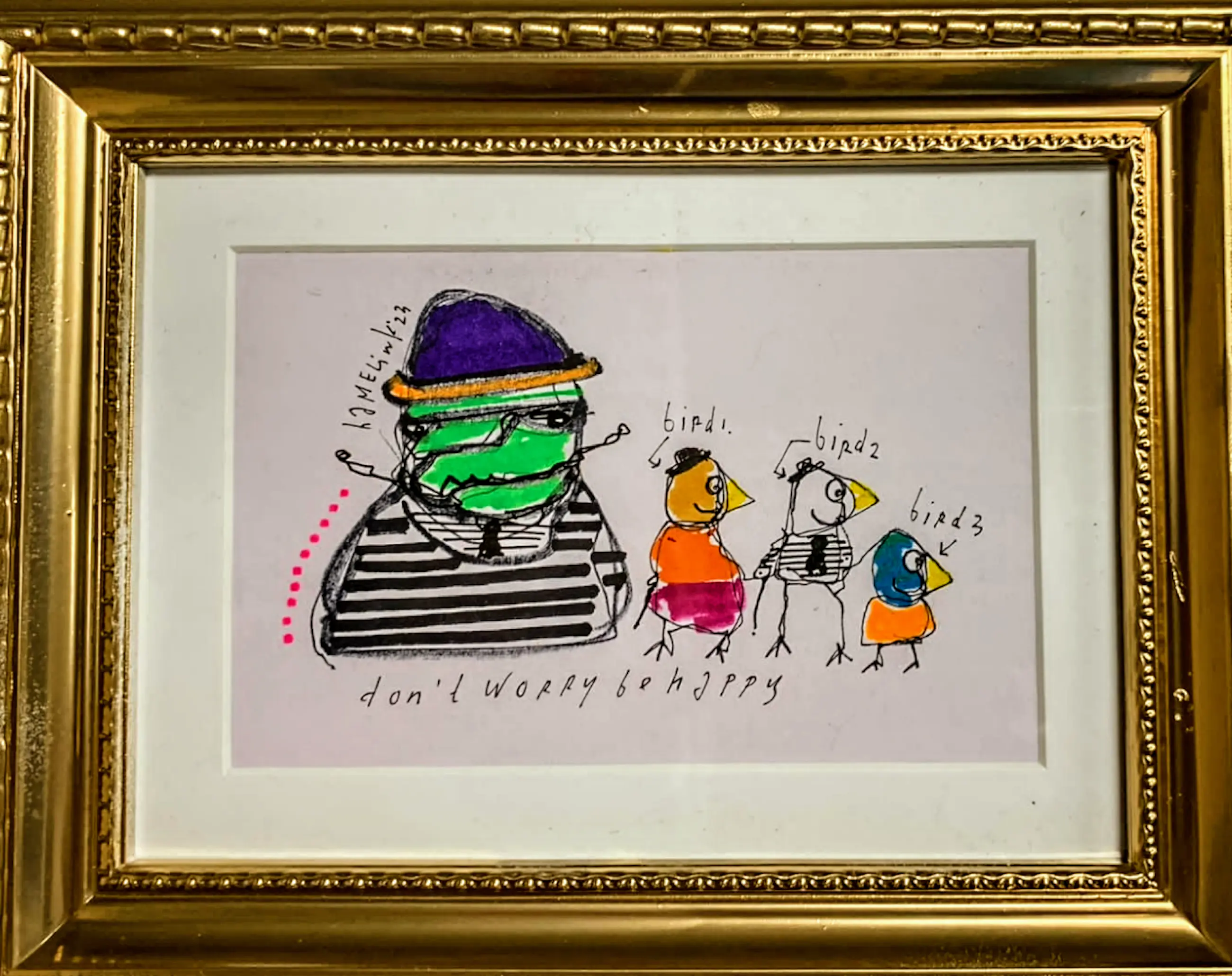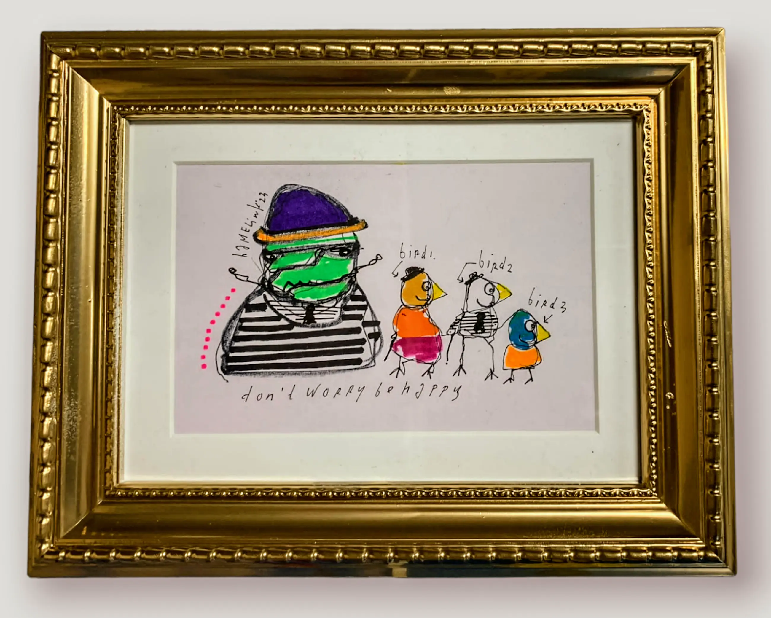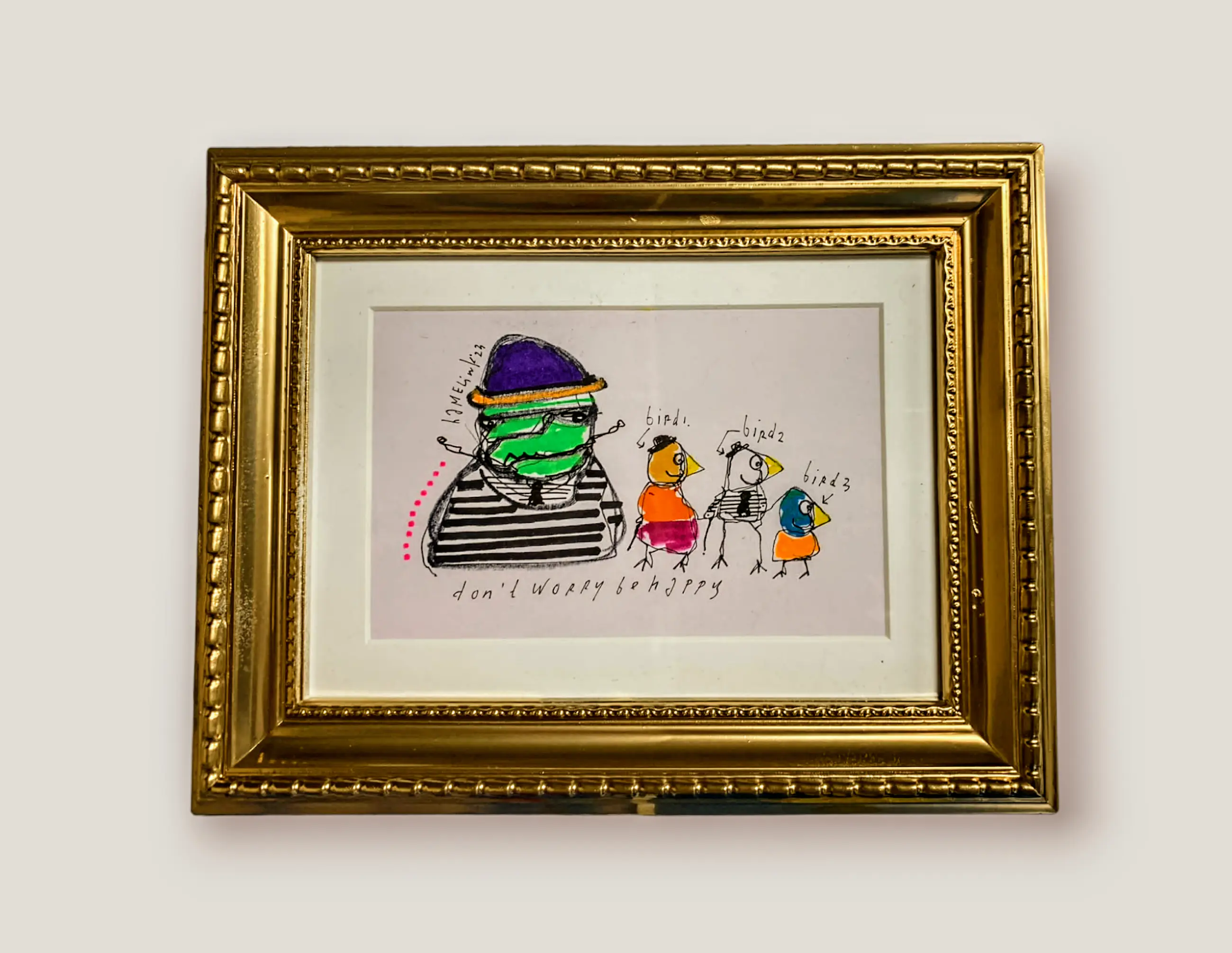 Orginele illustratie tekening van hamelink. Geïnspireerd op het liedje 3 little birds. Met de tekst er onder : don't worry be happy. Hand gemaakt met marker , acryl en inkt .