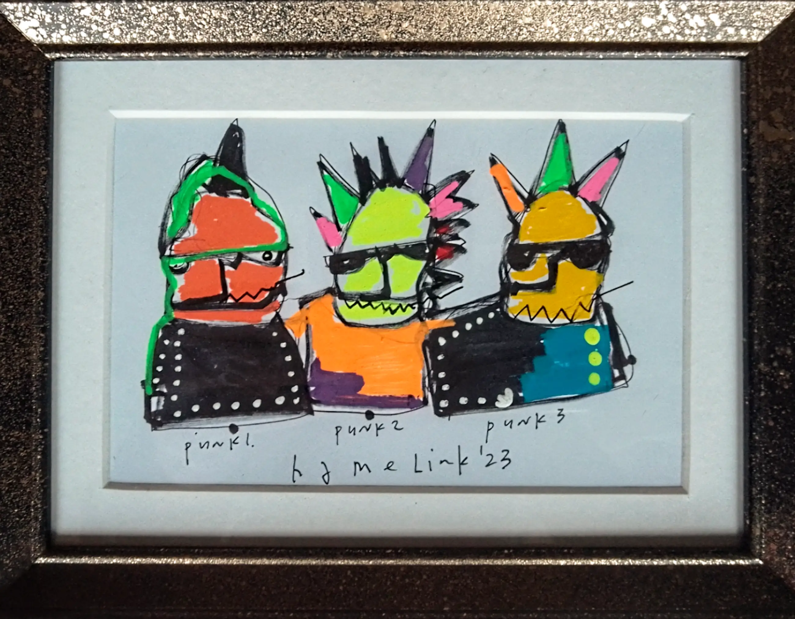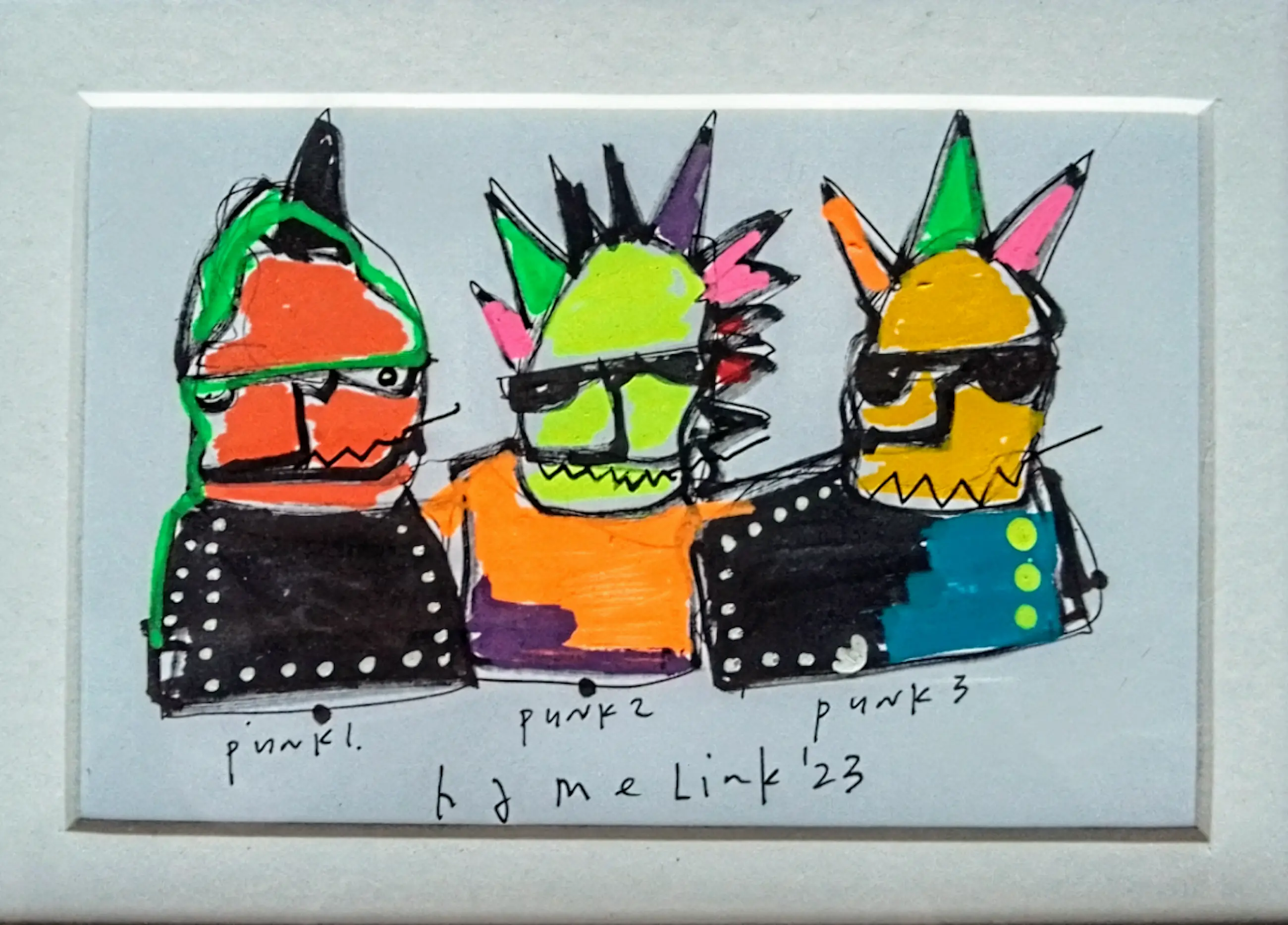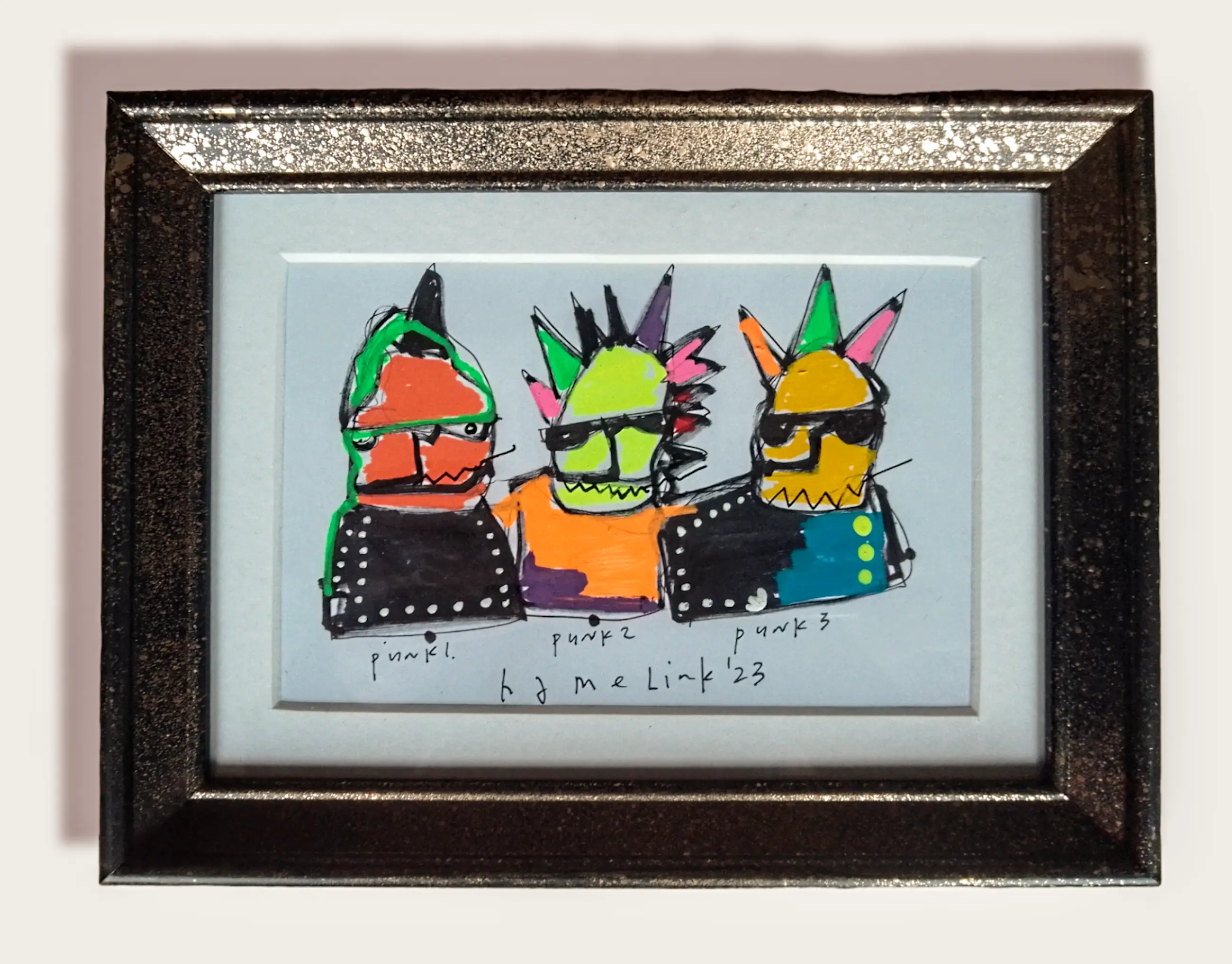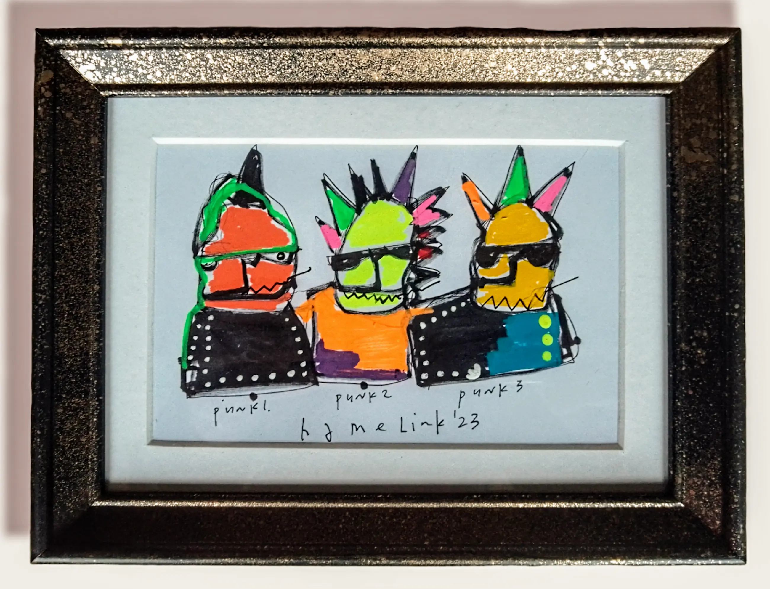 Leuke, coole illustratie tekening van 3 punkers, gemaakt met veel kleuren . Hand gemaakt in 2023 met marker, inkt, acryl.