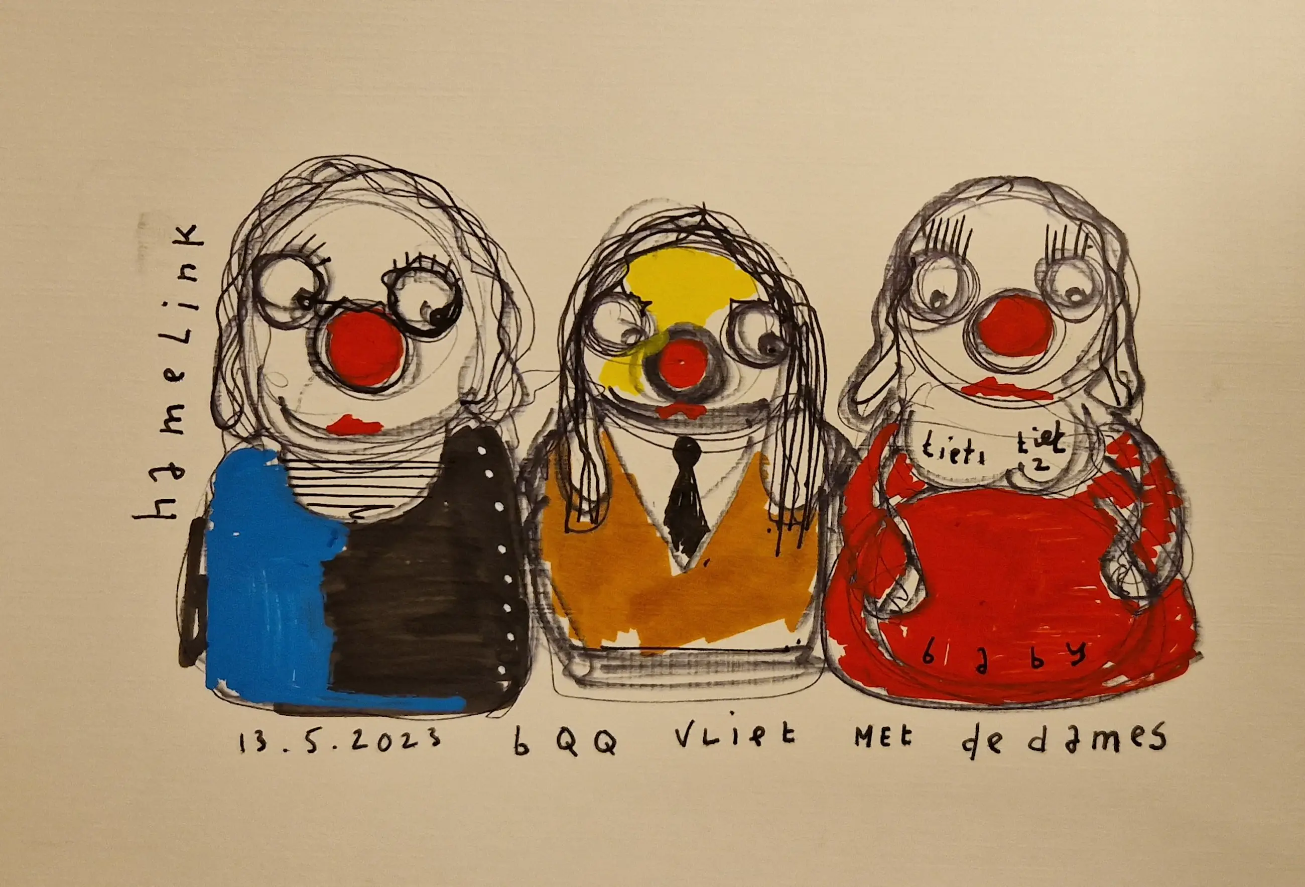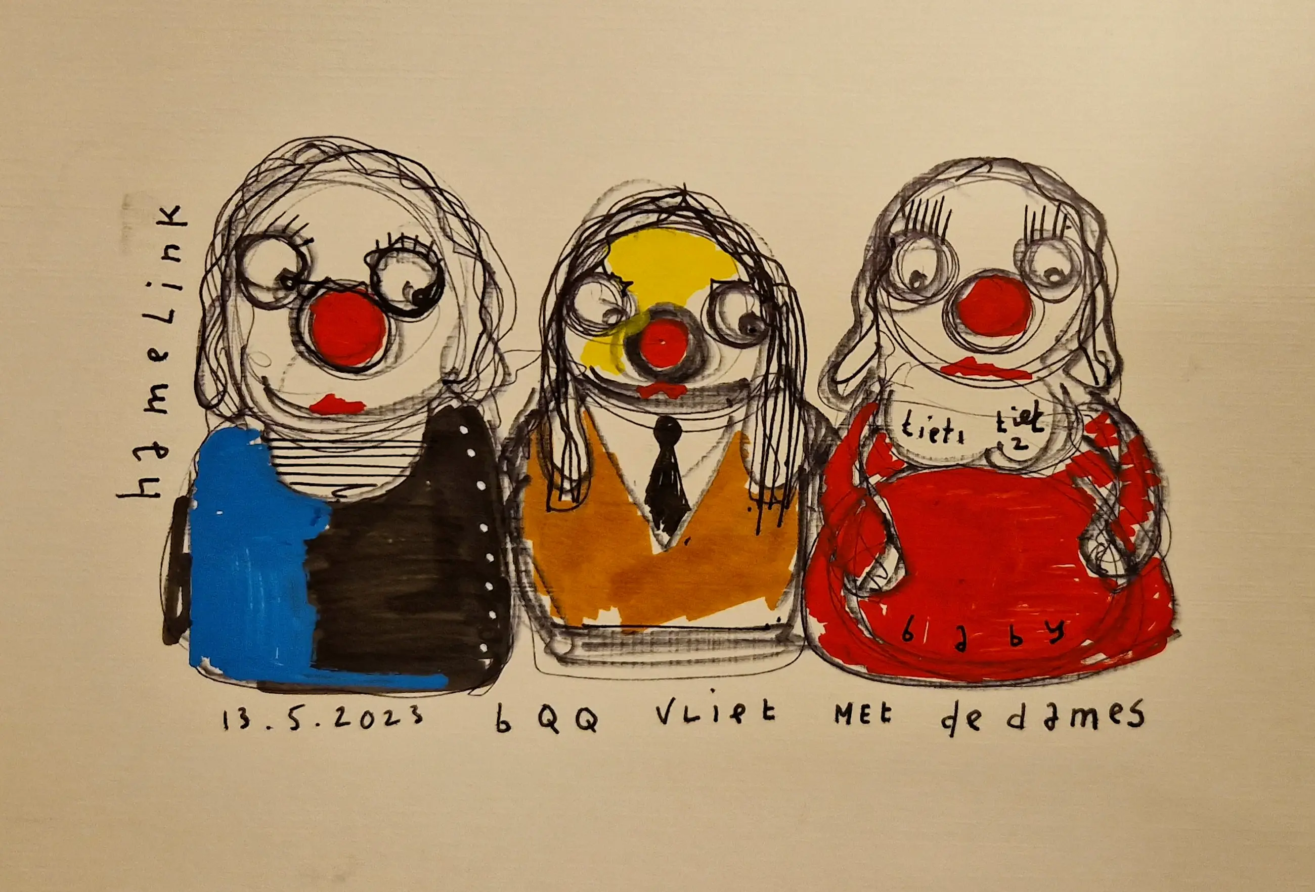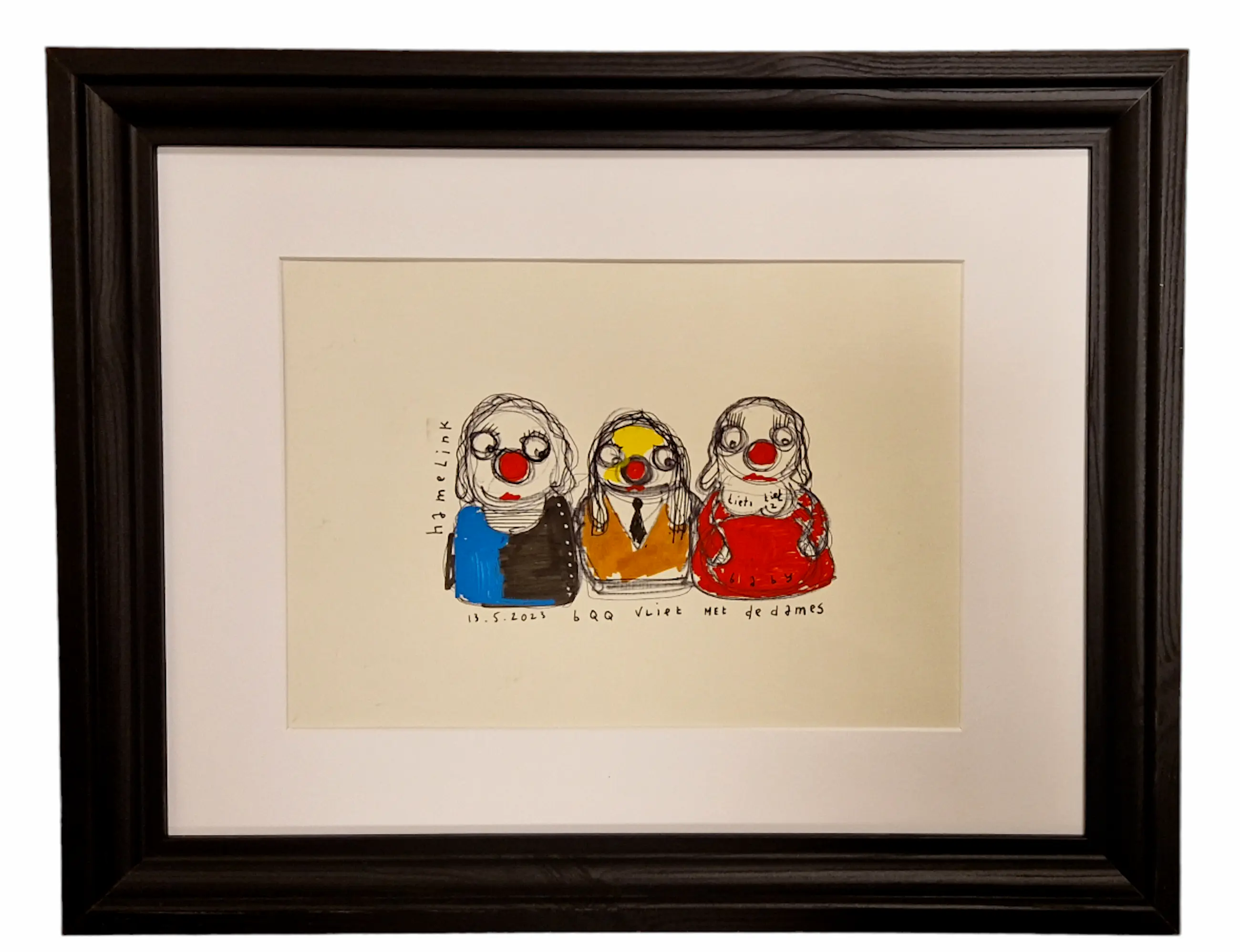 Orginele illustratie tekening van drie dames. Geïnspireerd door een bqq bij de vliet met drie dames. De tekening is gemaakt op 250 gram papier met acryl stiften , marker en inkt. Hert werk is inclusief de lijst ( 37 cm x 47 cm ) . In de tekening zijn nog verschillende teksten verwerkt. Verder is het werk ondertekend met hamelink en in perfecte staat.