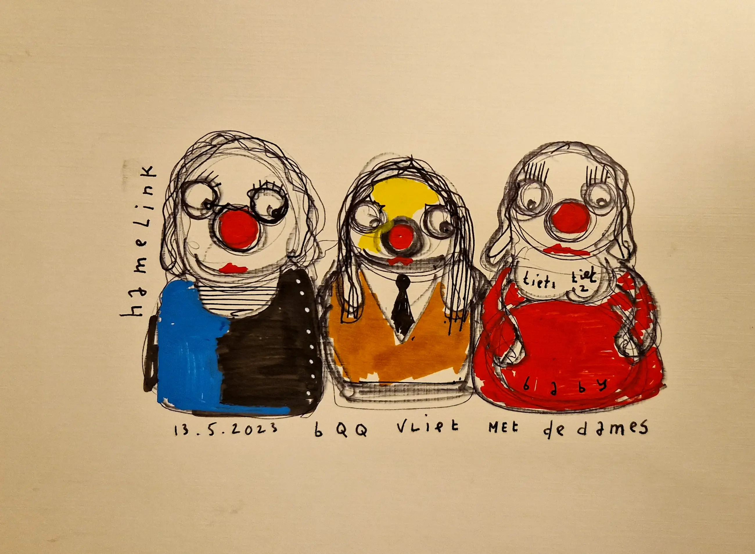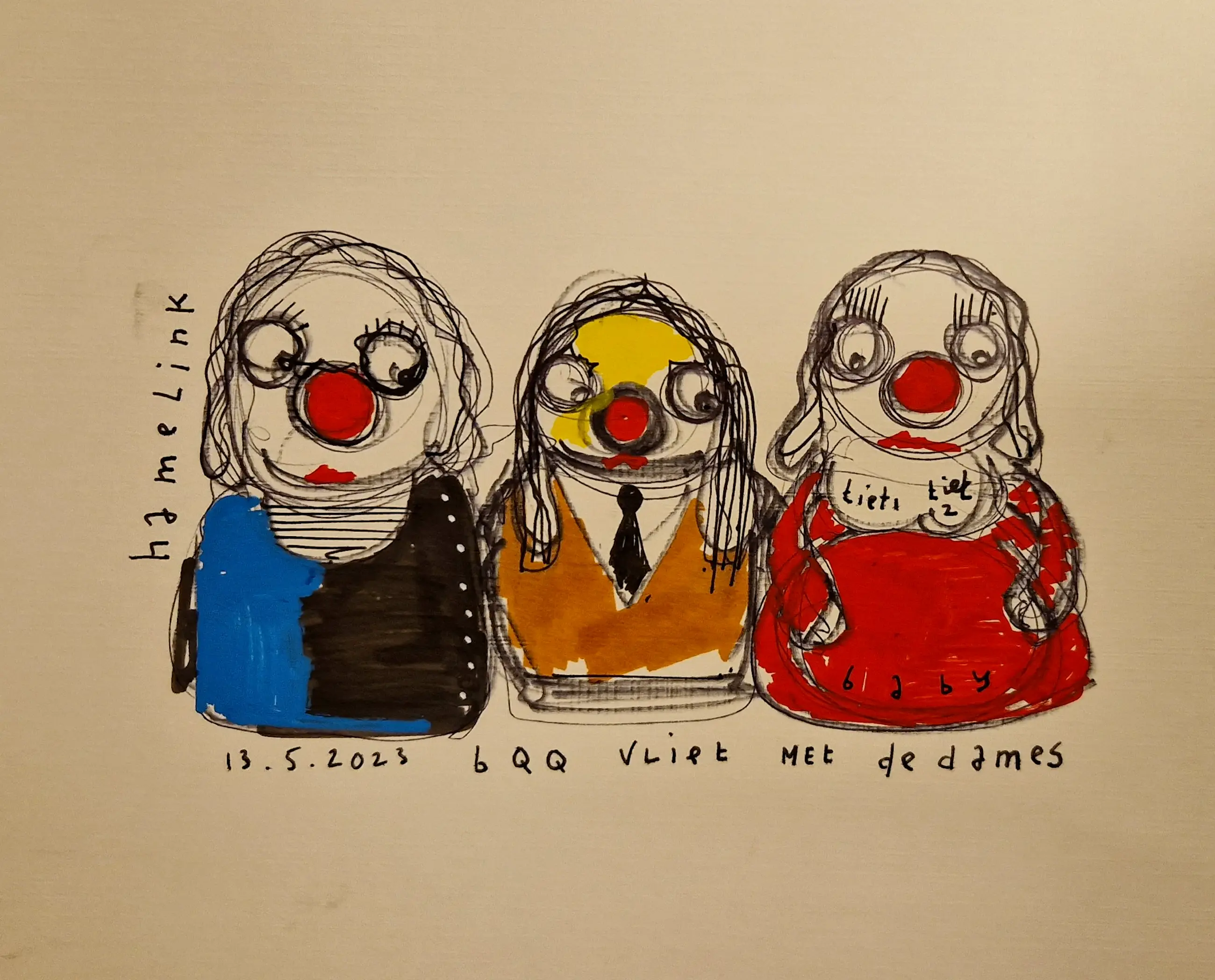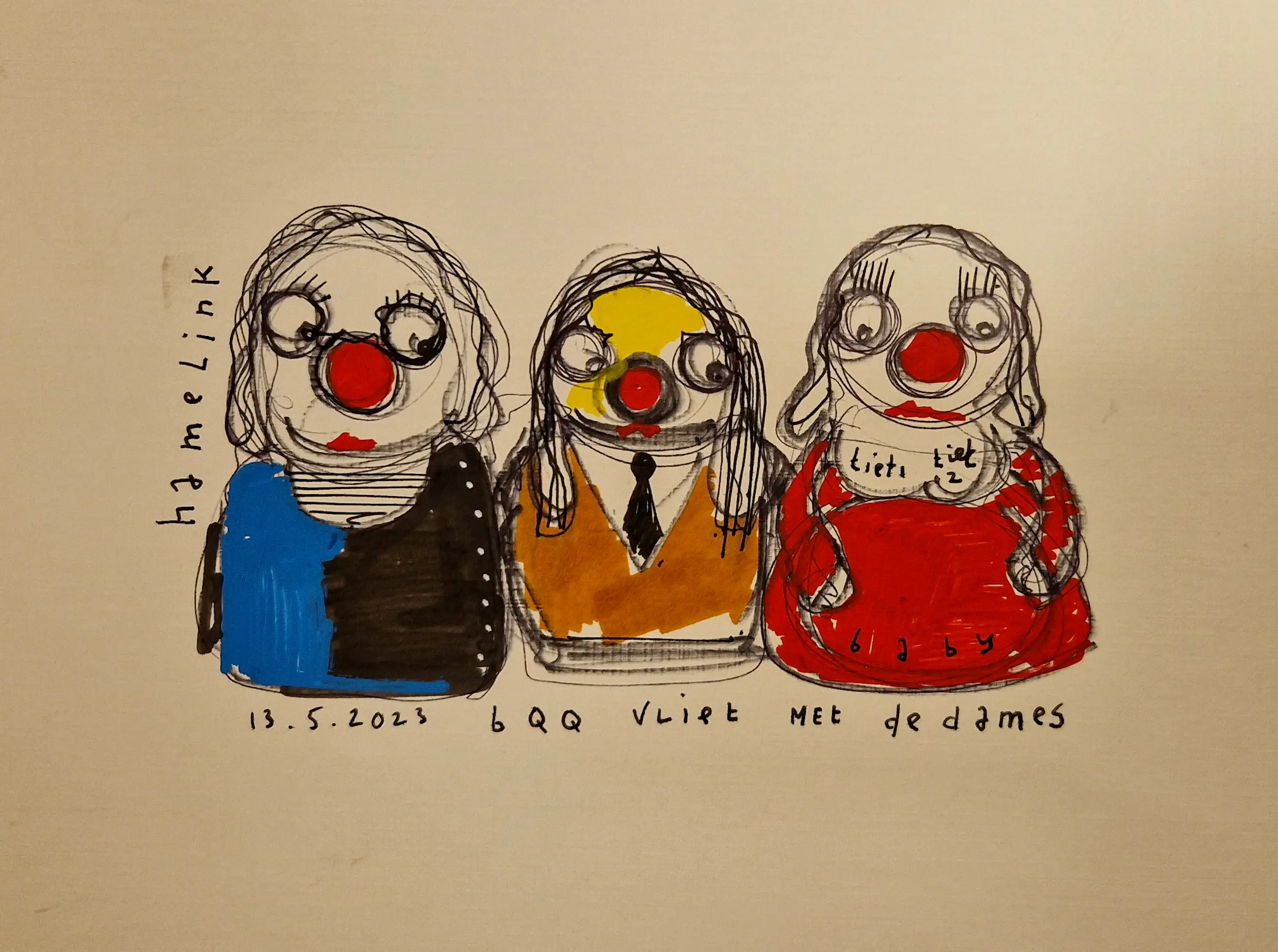 Orginele illustratie tekening van drie dames. Geïnspireerd door een bqq bij de vliet met drie dames. De tekening is gemaakt op 250 gram papier met acryl stiften , marker en inkt. Hert werk is inclusief de lijst ( 37 cm x 47 cm ) . In de tekening zijn nog verschillende teksten verwerkt. Verder is het werk ondertekend met hamelink en in perfecte staat.