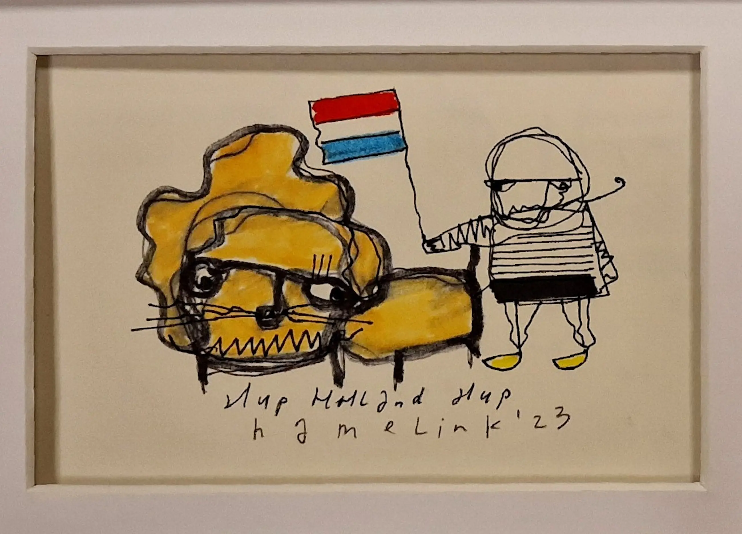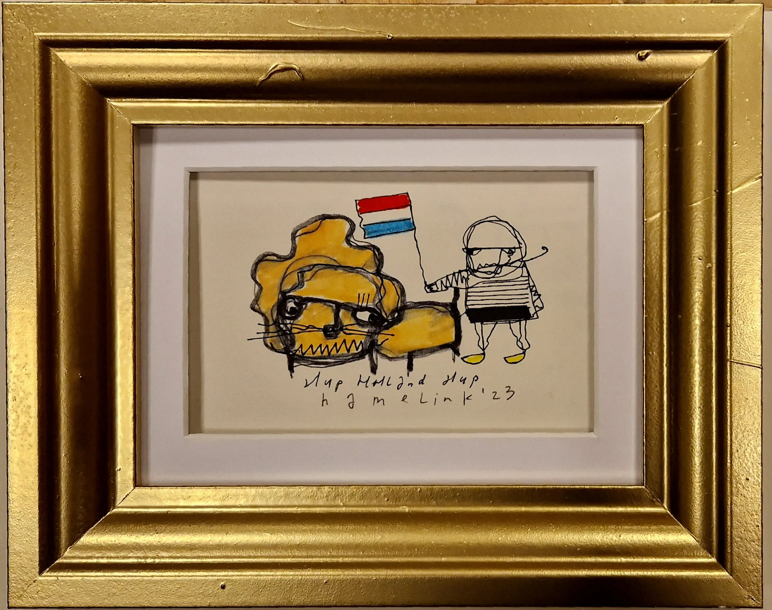 Orginele illustratie cartoon tekening van de Nederlandse kunstenaar Bart Hamelink. Een tekening van een leeuw met daar naast een poppetje. Onder de leeuw staat de tekst geschreven: hup Holland hup. Naast de leeuw staat een poppetje met de Nederlandse vlag en met gele klompjes aan. Het werk is getekend met acryl inkt en in perfecte staat.