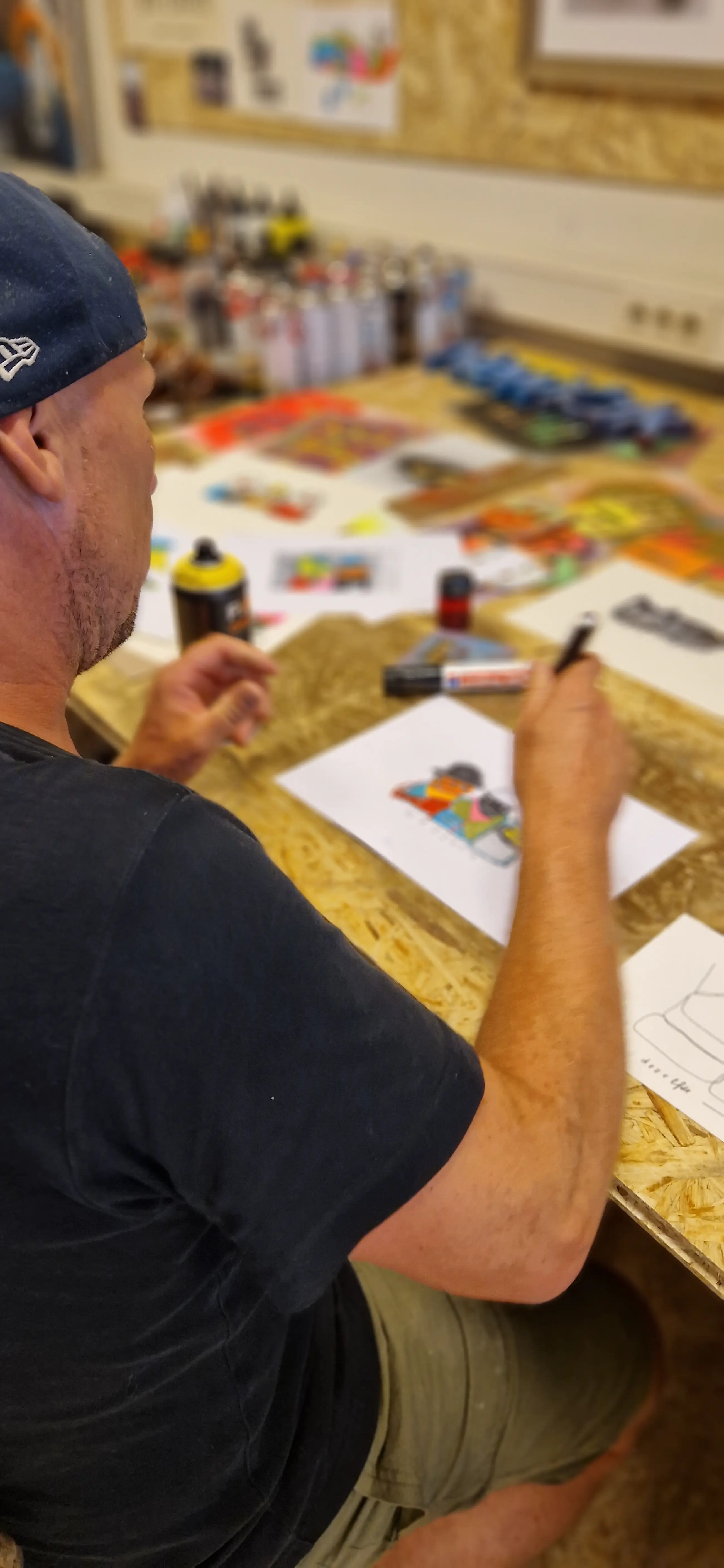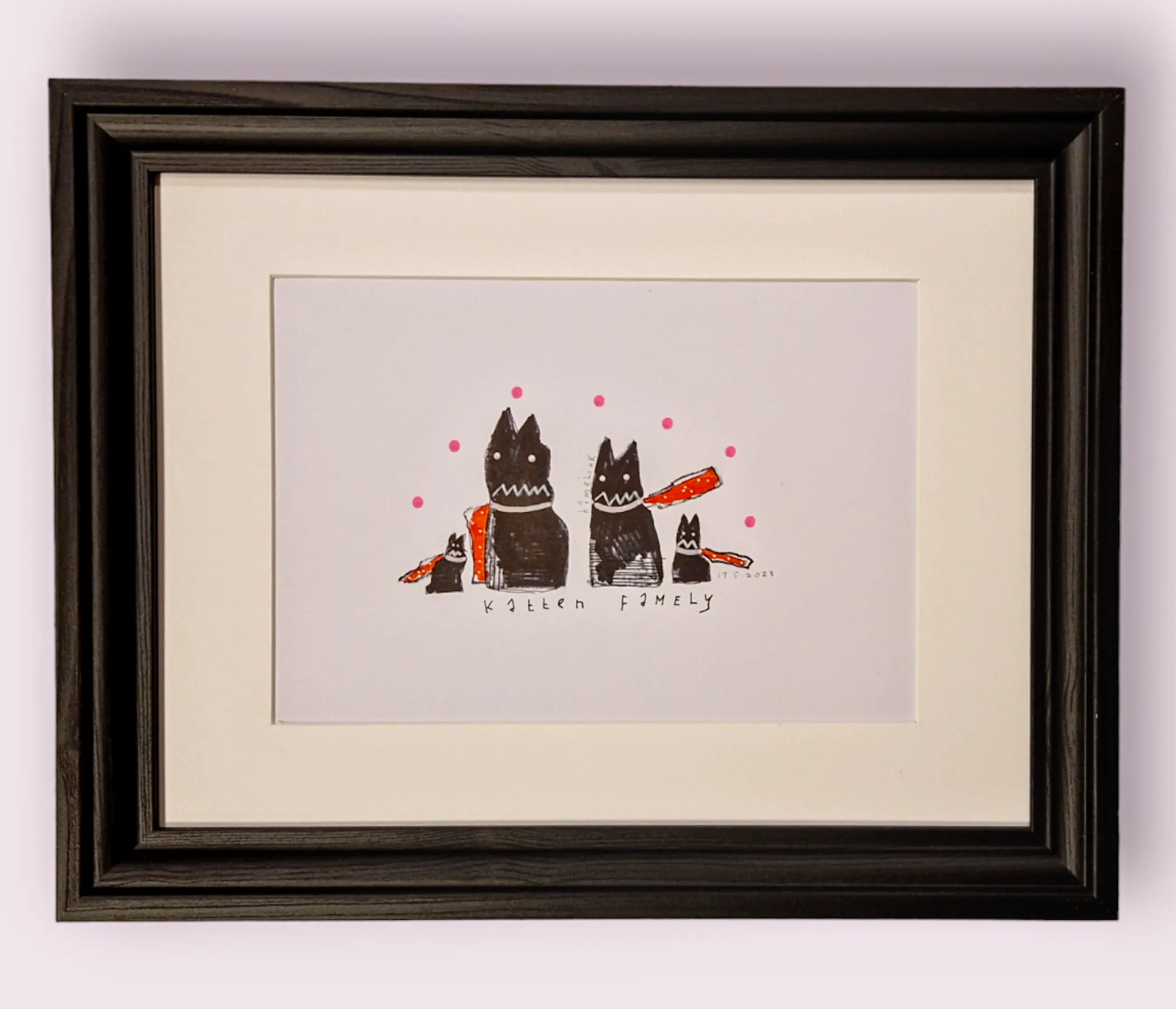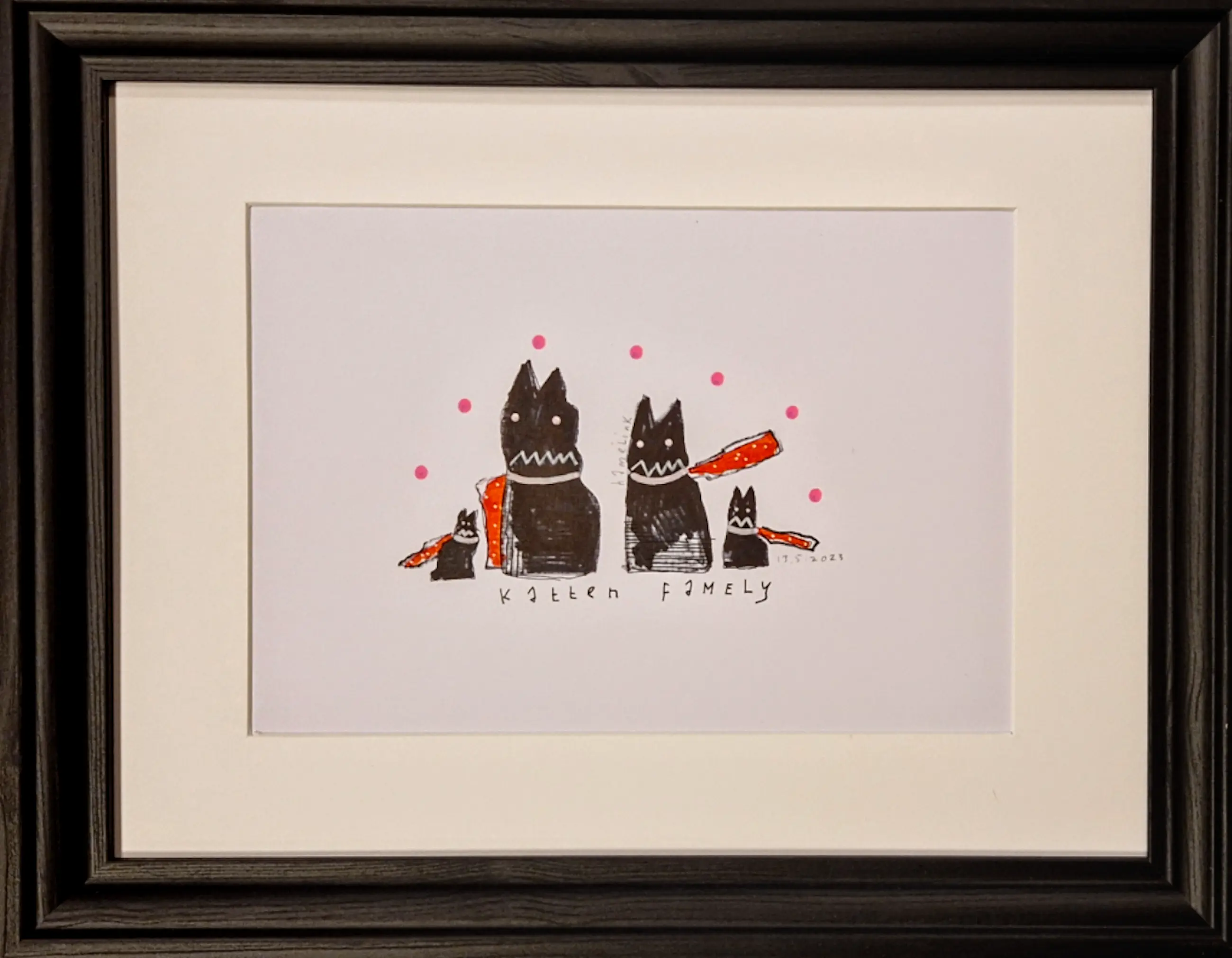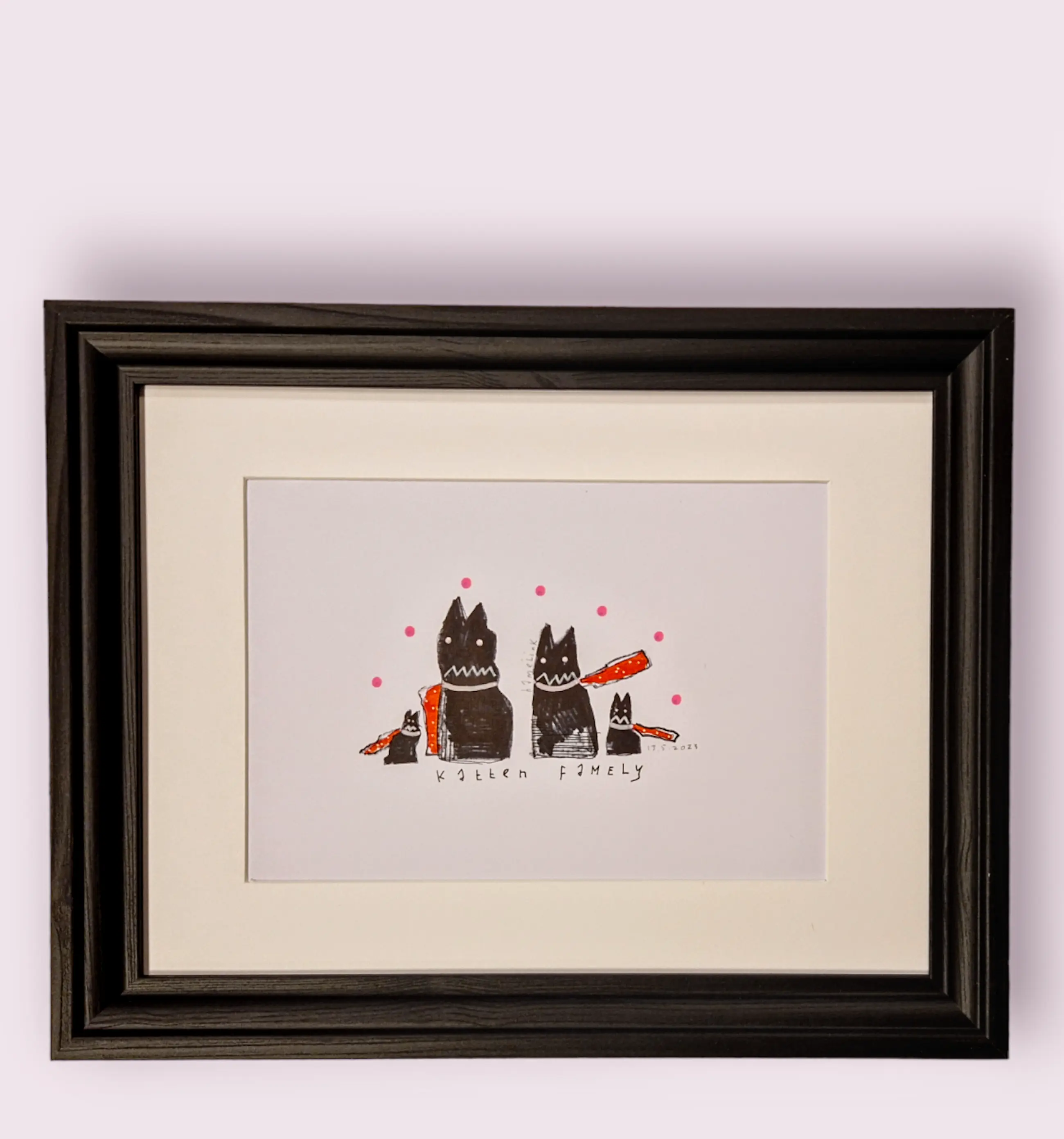 Orginele illustratie tekening van een katten familie. Getekend door de Nederlandse kunstschilder/illustrator Bart Hamelink. De kunstenaar werkt met verschillende technieken, waar onder . Air brush , marker, acrylverf, acrylinkt en graffiti. Op dit moment is hij meer bezig met het tekenen van mensen en dieren op een komische leuke manier. Daar door probeert hij de tekening een verhaal met te geven.