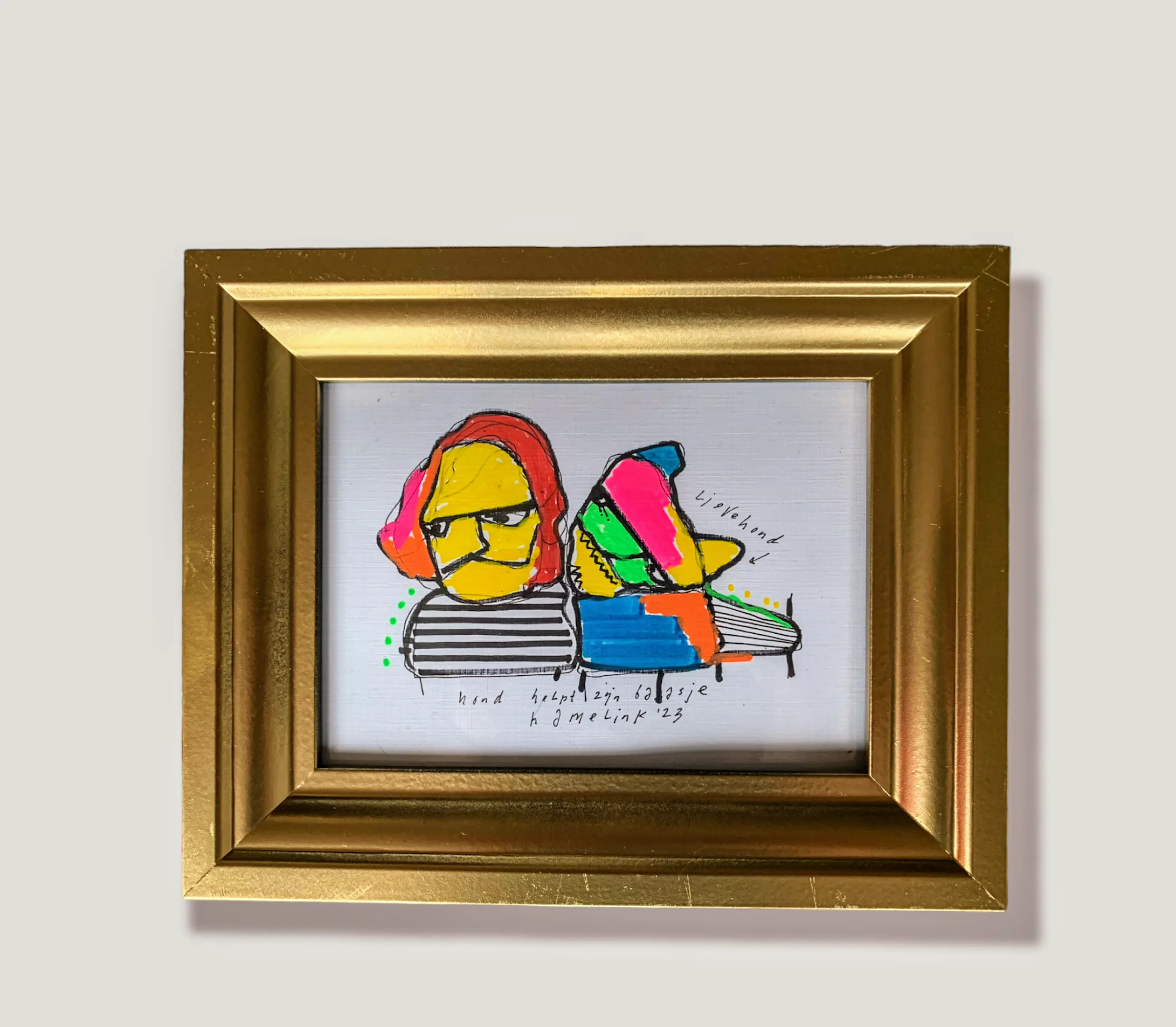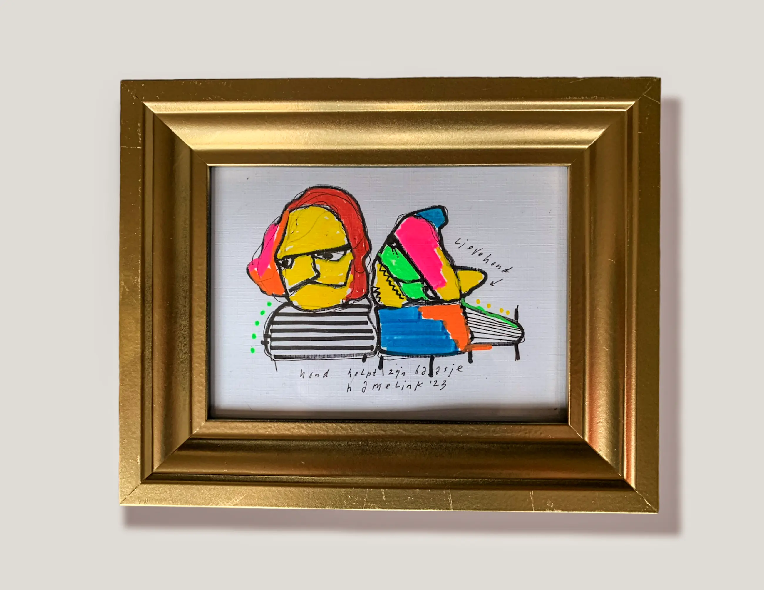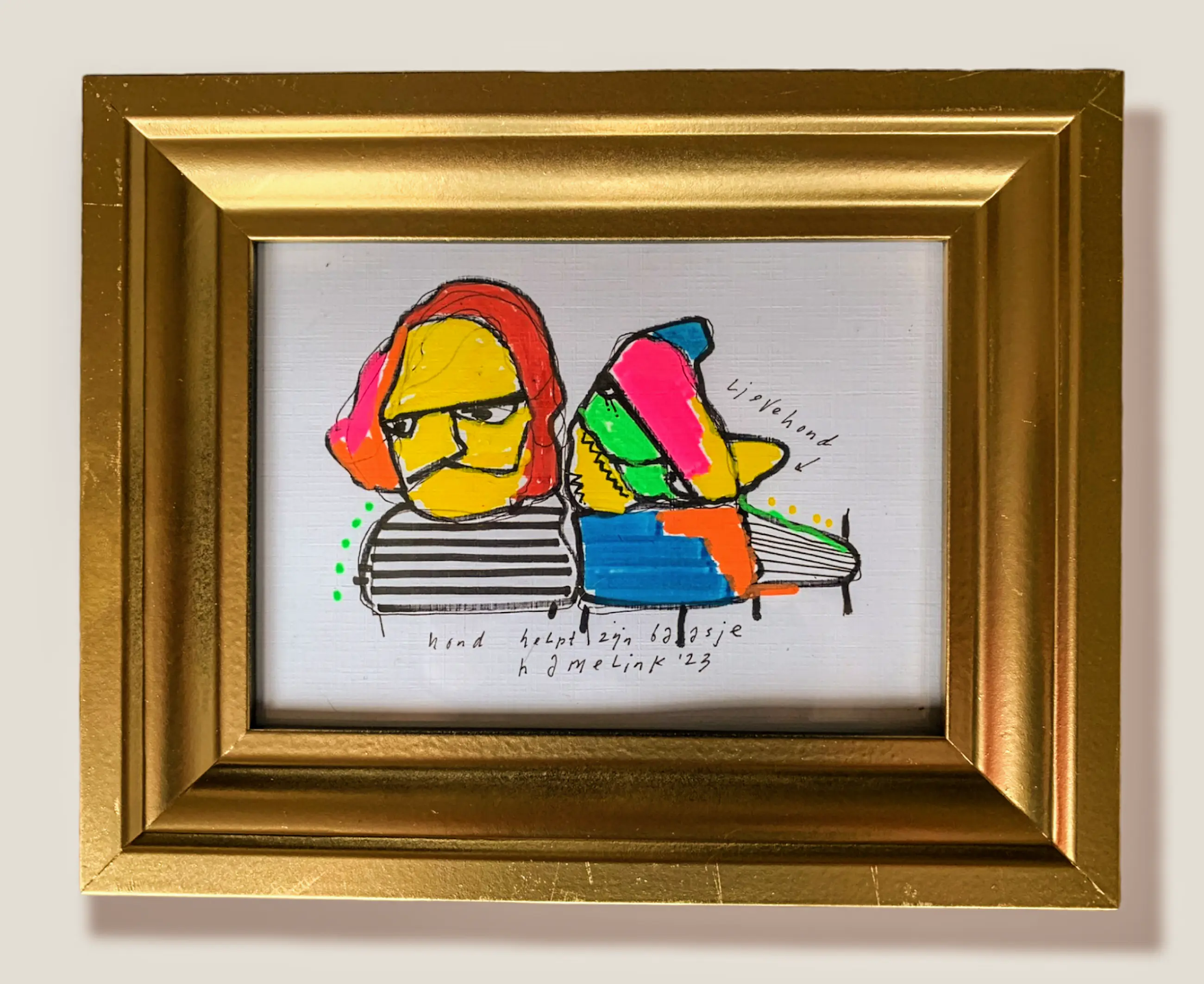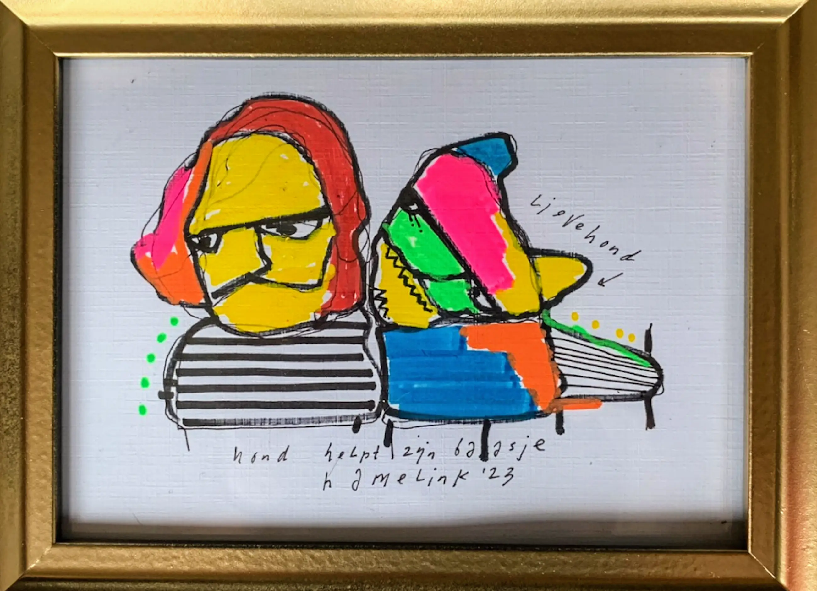 Leuke originele illustratie tekening van Hamelink. Hond die lief is voor zijn baasje. Handgemaakt met acryl, marker en inkt.