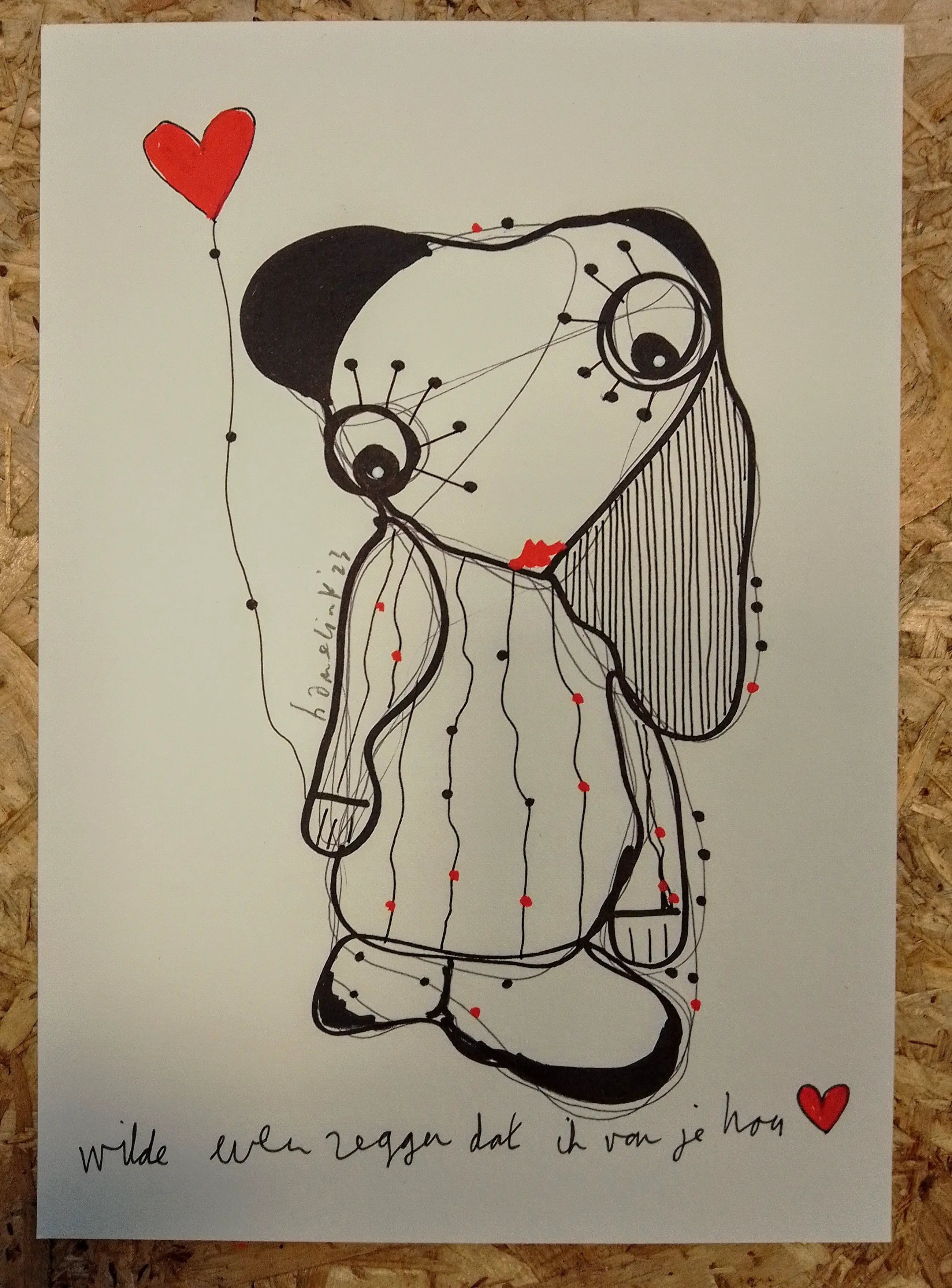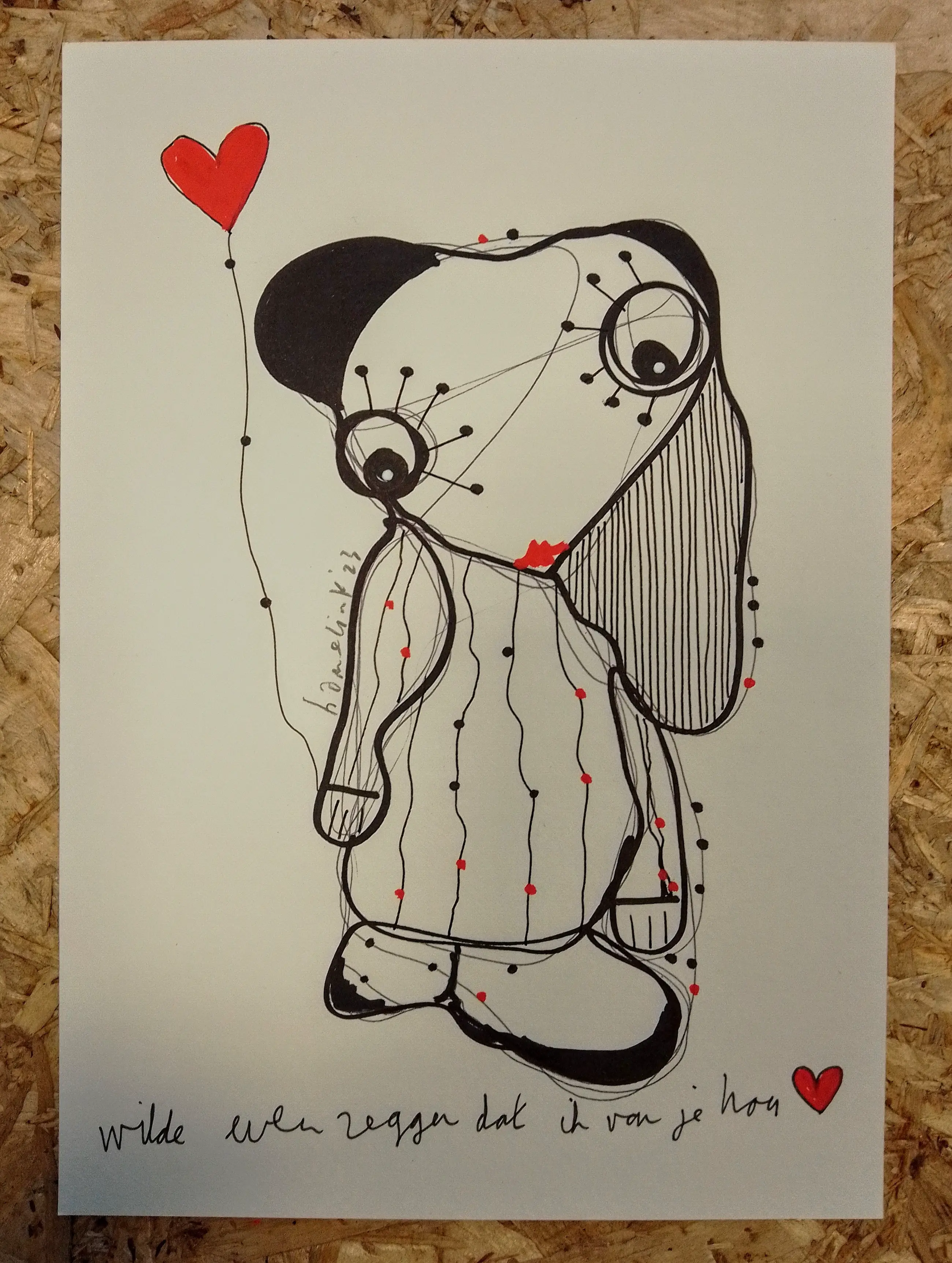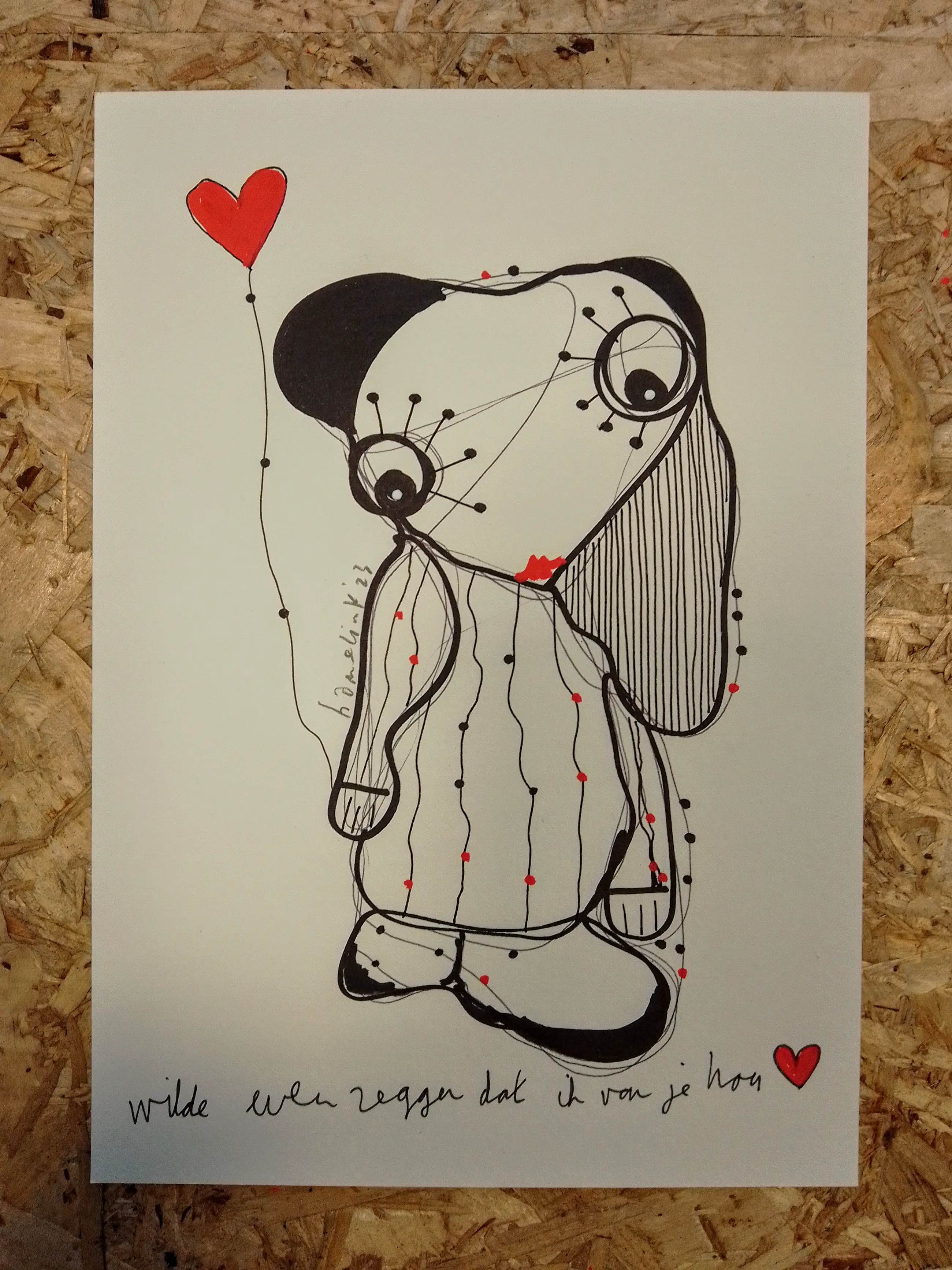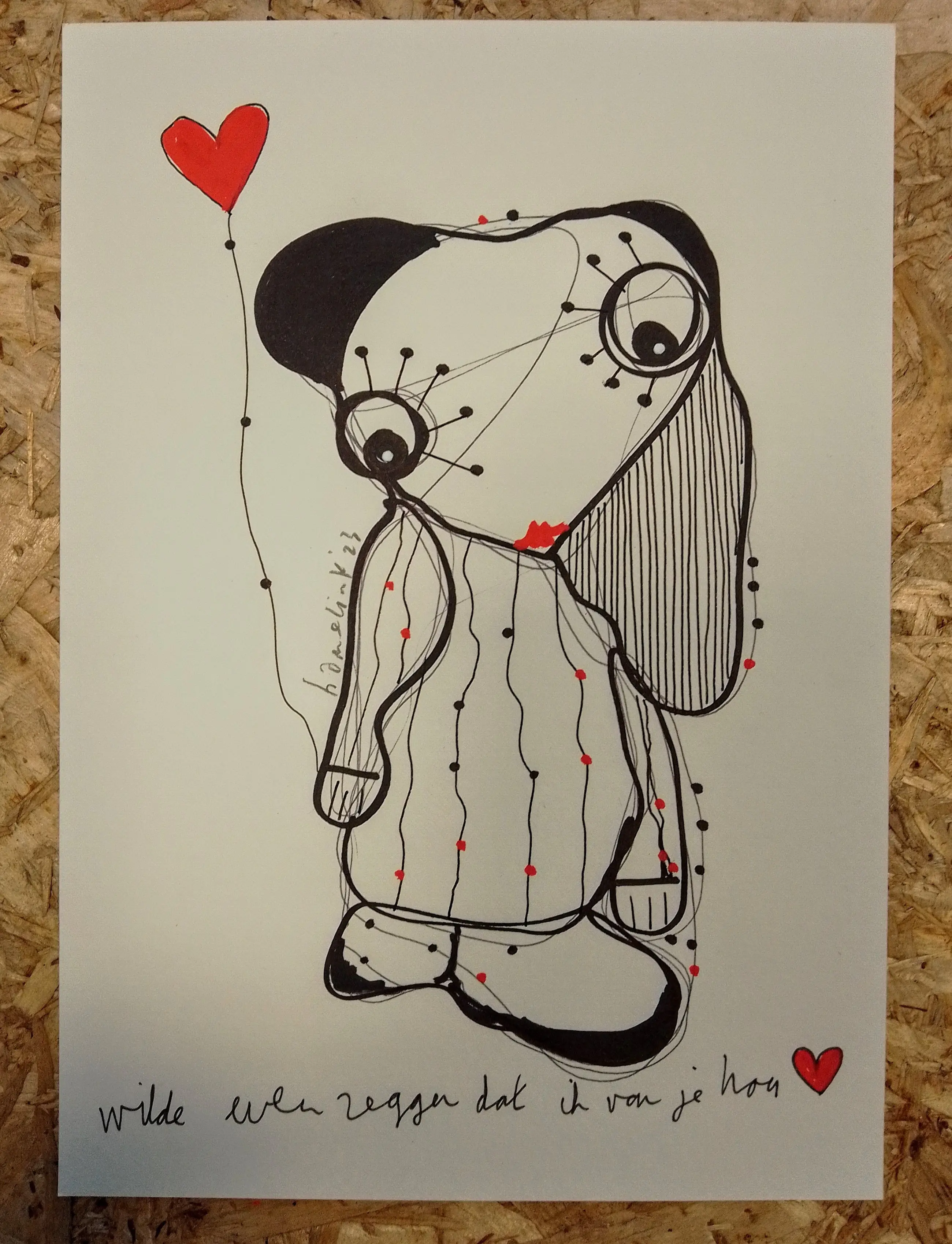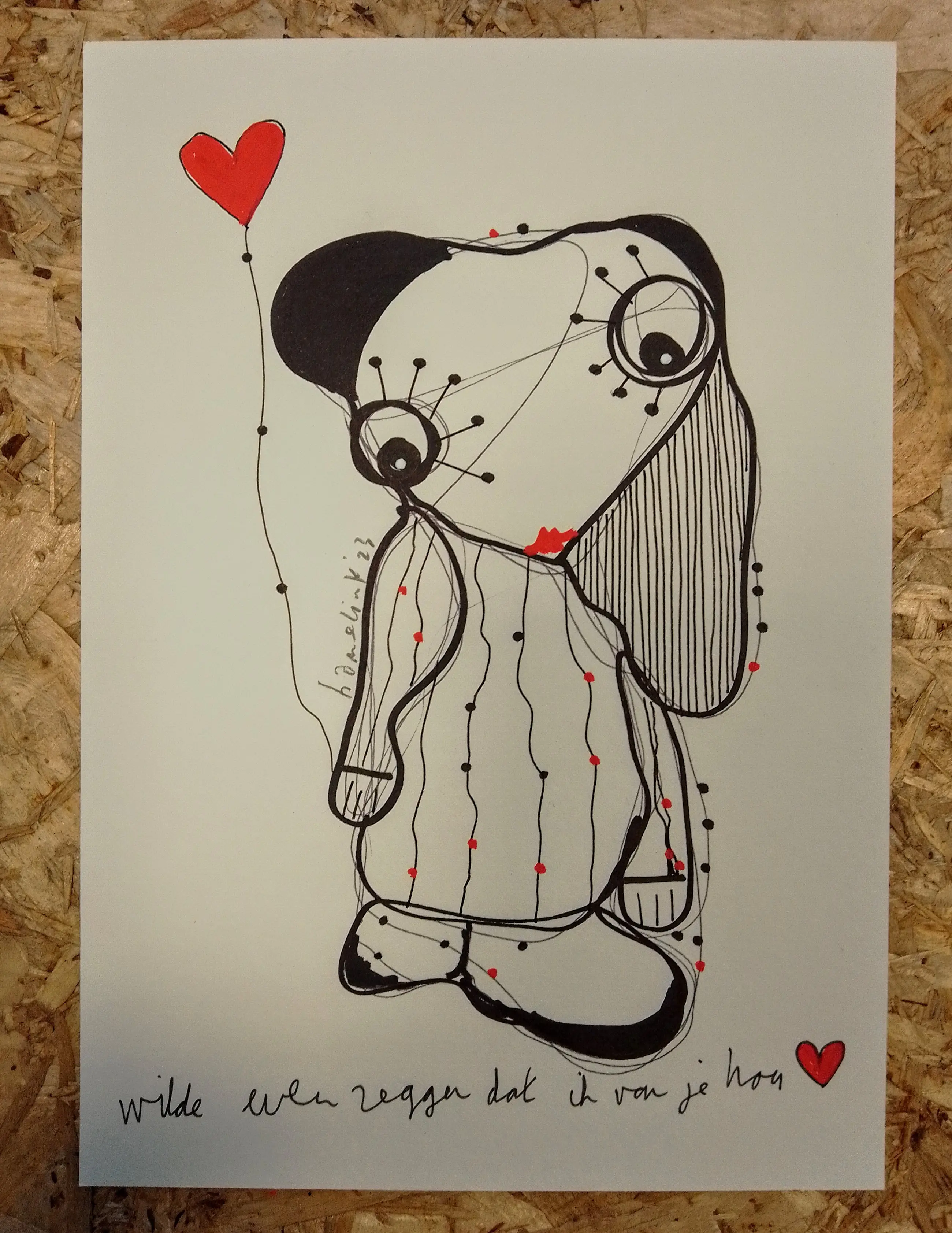 Leuke originele illustratie tekening gebaseerd op liefde. Schattig liefdevol poppetje getekend met een liefdesverhaal. Die die graag wilt delen. De tekening in gemaakt met acryl inkt en marker en in perfecte staat.