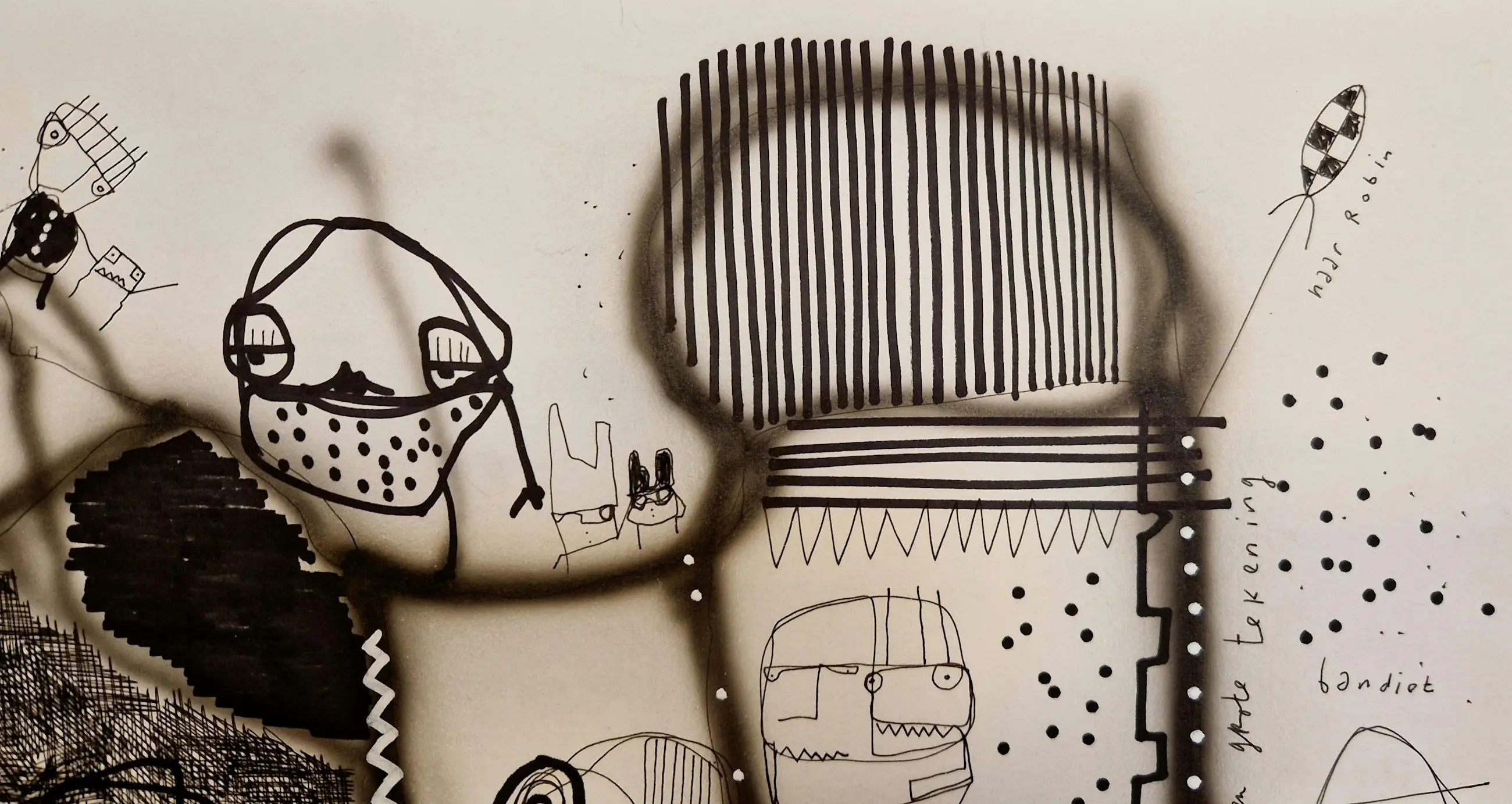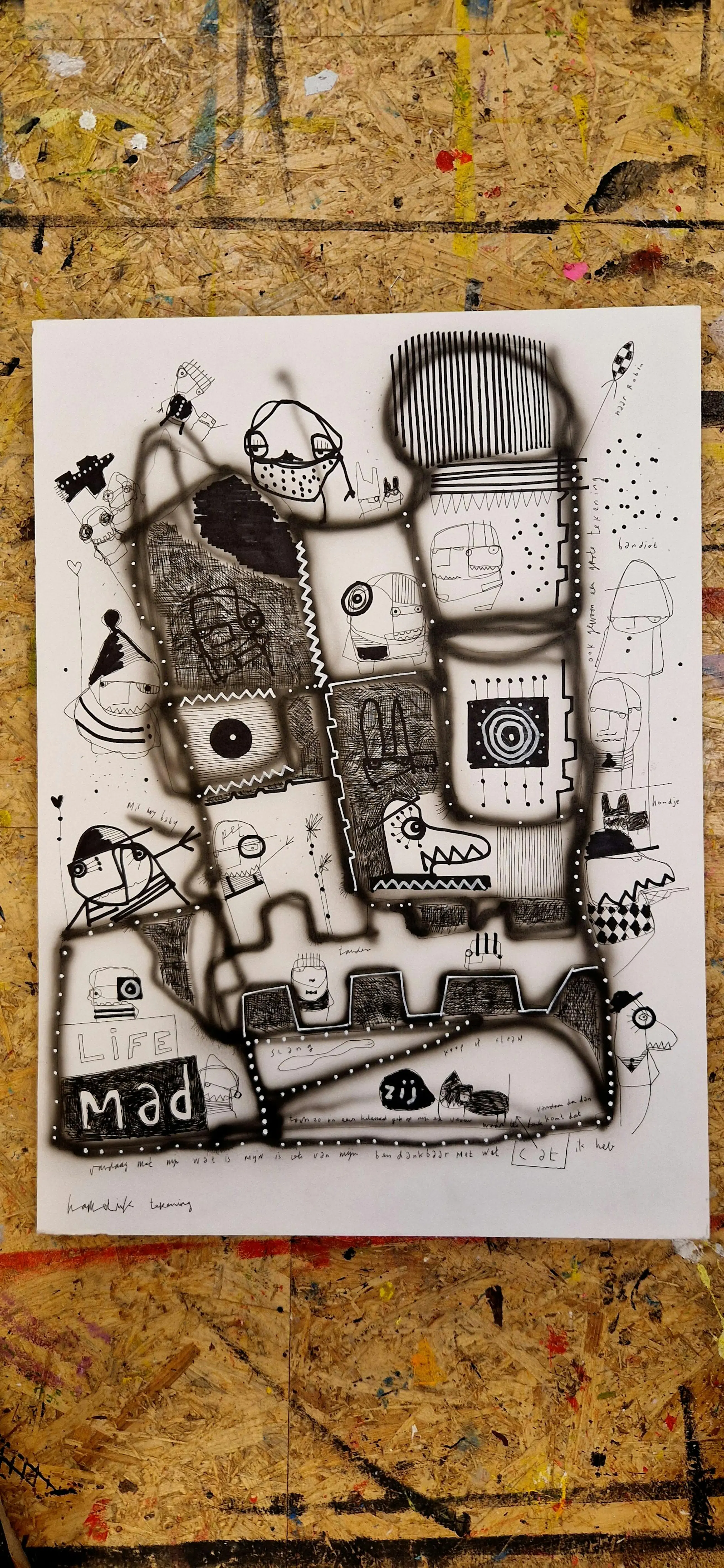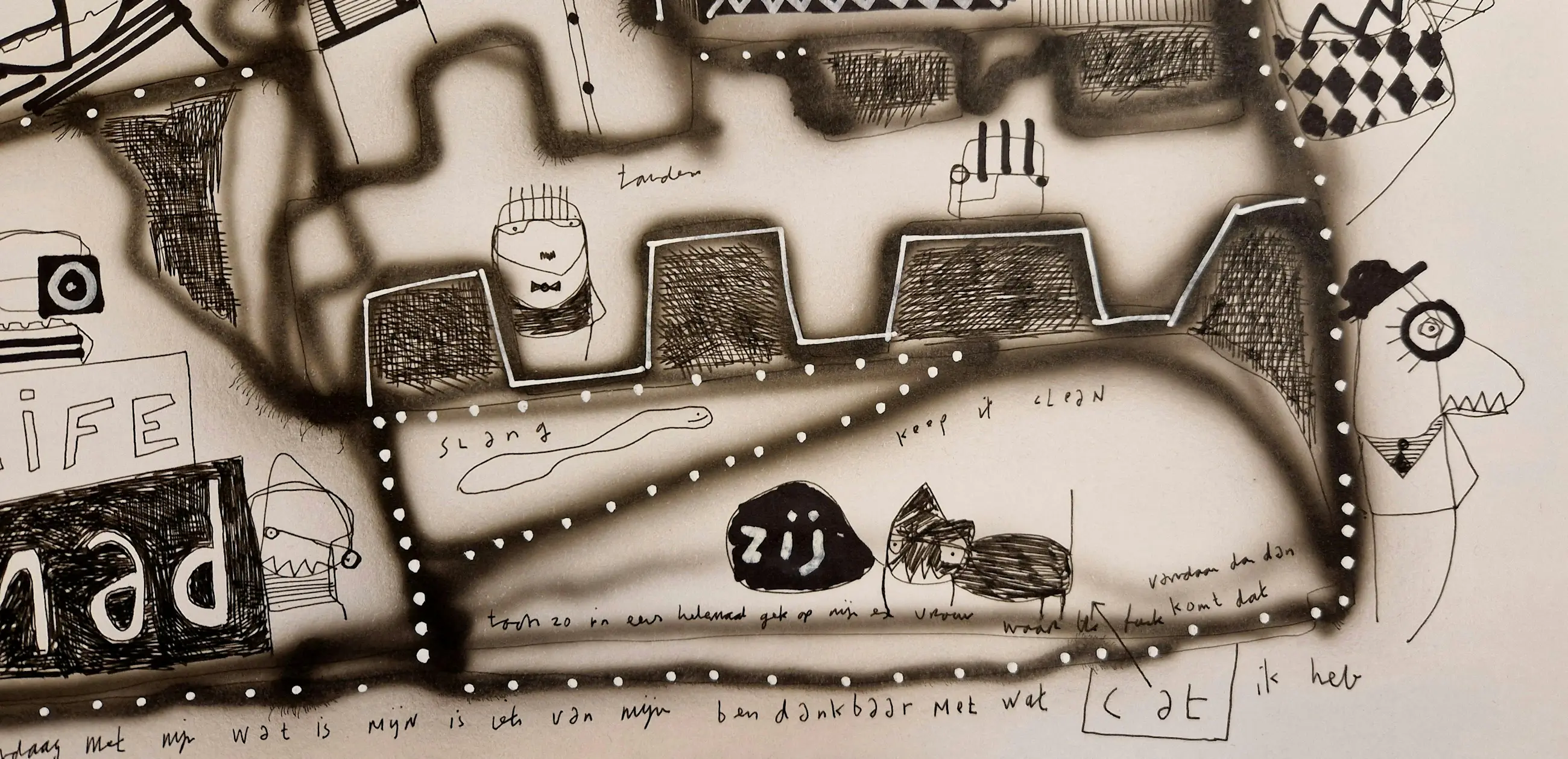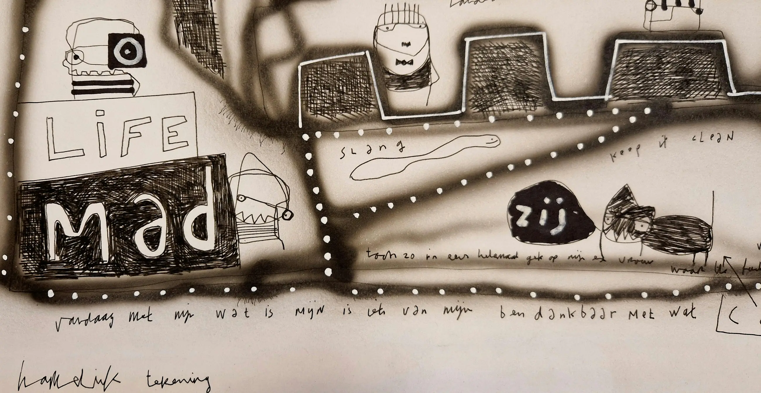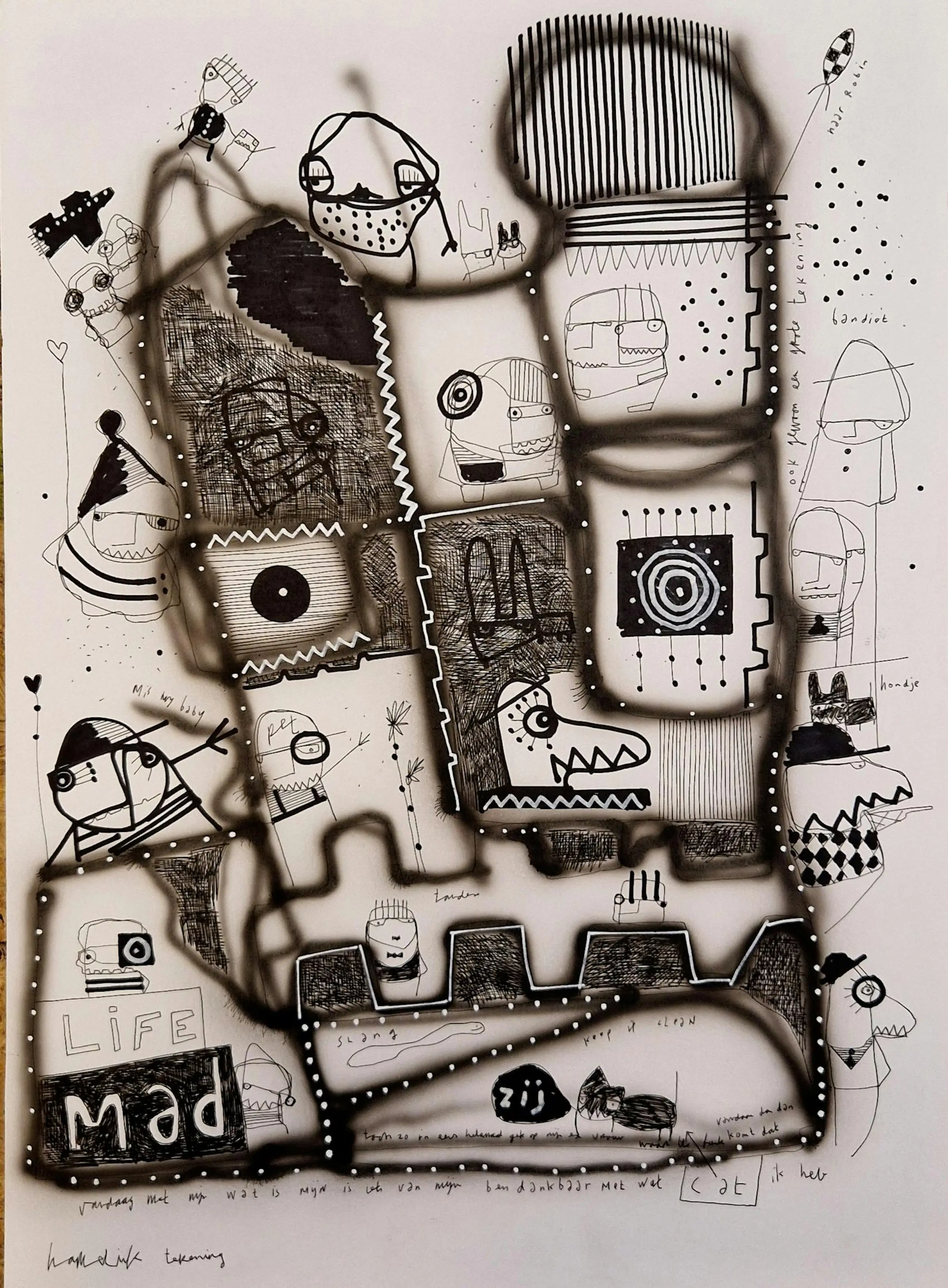 Deze tekening komt recht uit mijn buik. Gemaakt in een flow, zonder plan, zonder filter. Een visueel dagboek over hoe ik het ervaar: wild, lief, verwarrend en echt. De teksten in het werk zijn fragmenten van gedachten. Sommige hard, andere hoopvol.