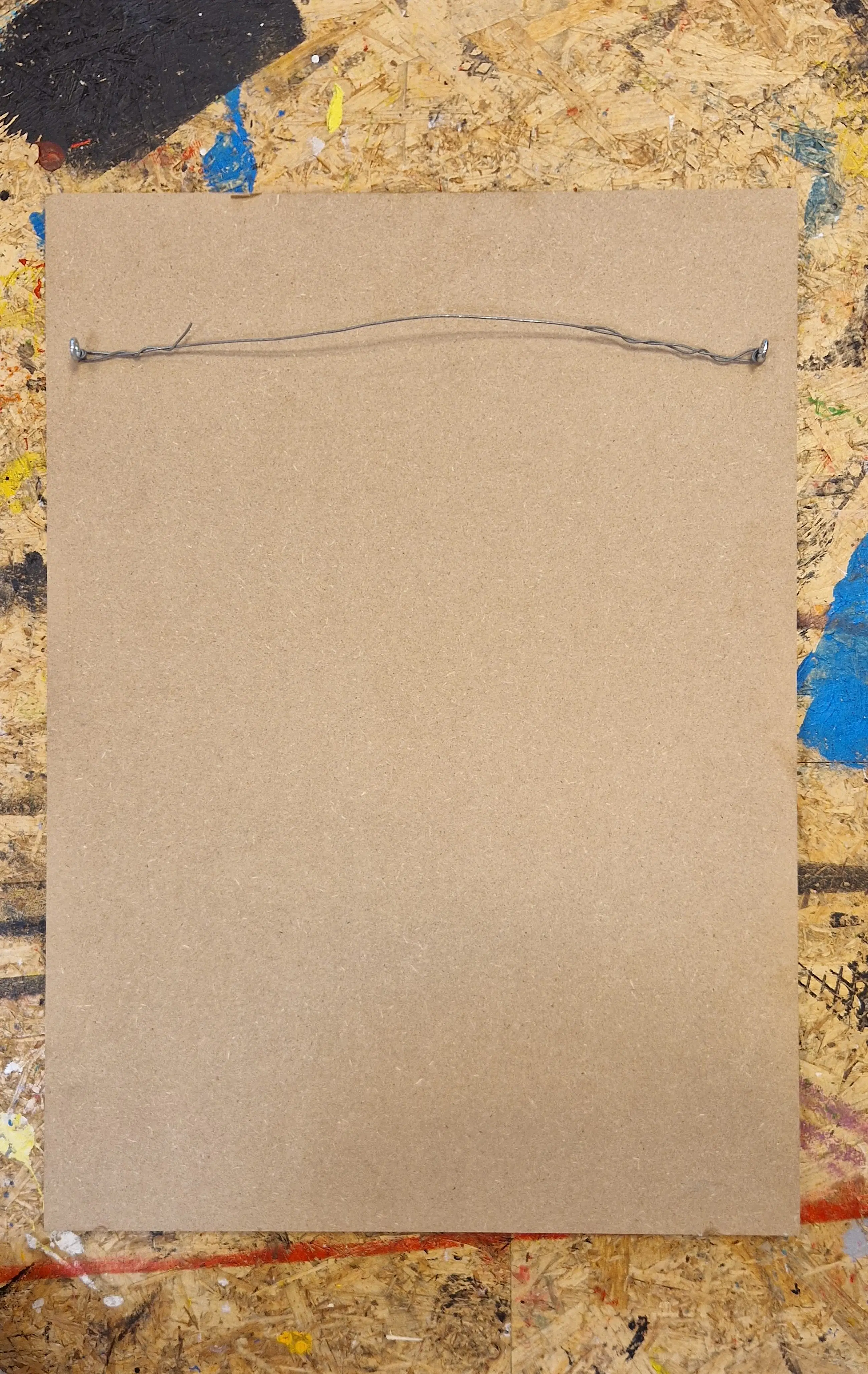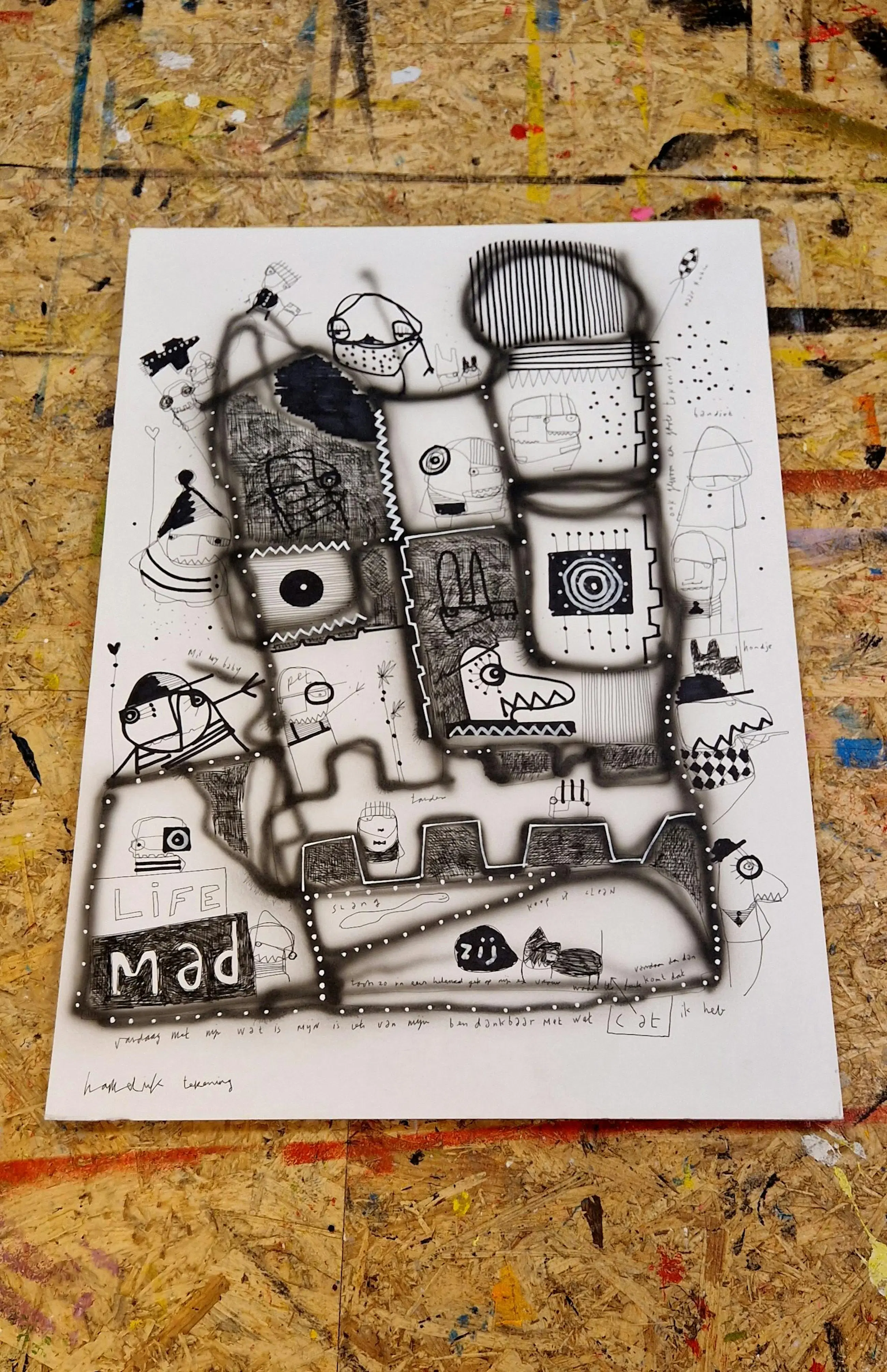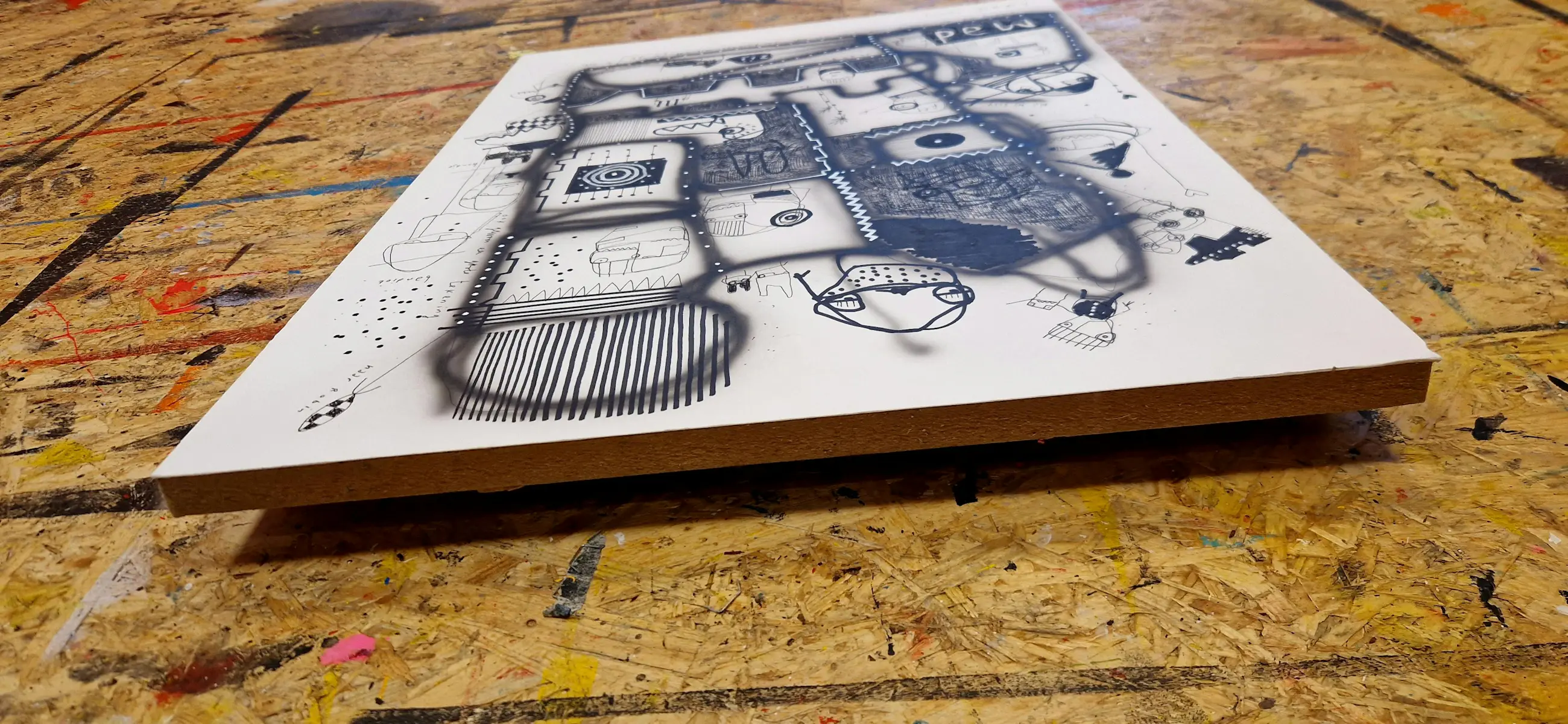 Techniek & afwerking: Zwart/wit inkttekening met stift, pen, markers en spuitbus op dik papier (300 g/m²). Het werk is strak verlijmd op een 1,8 cm dikke MDF-plaat — geen golvend papier dus. Achterop zit een stevig ophangsysteem, klaar om direct aan de muur te hangen. Eén origineel.