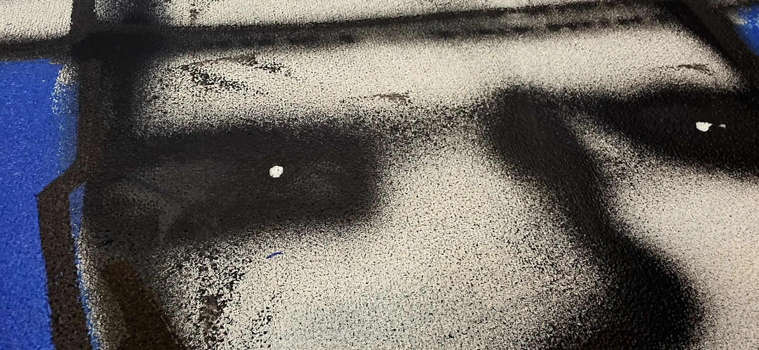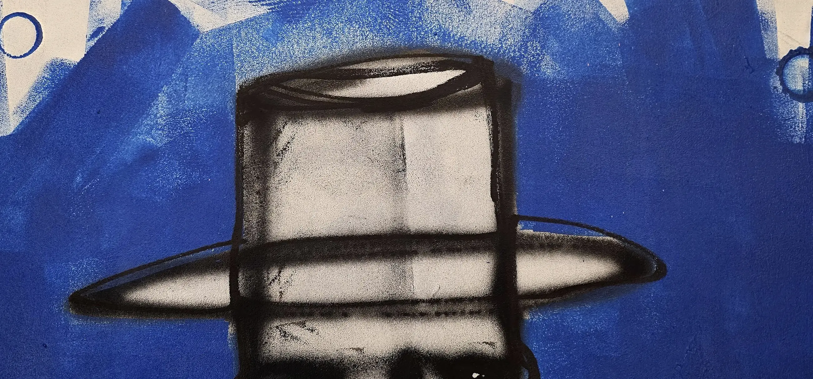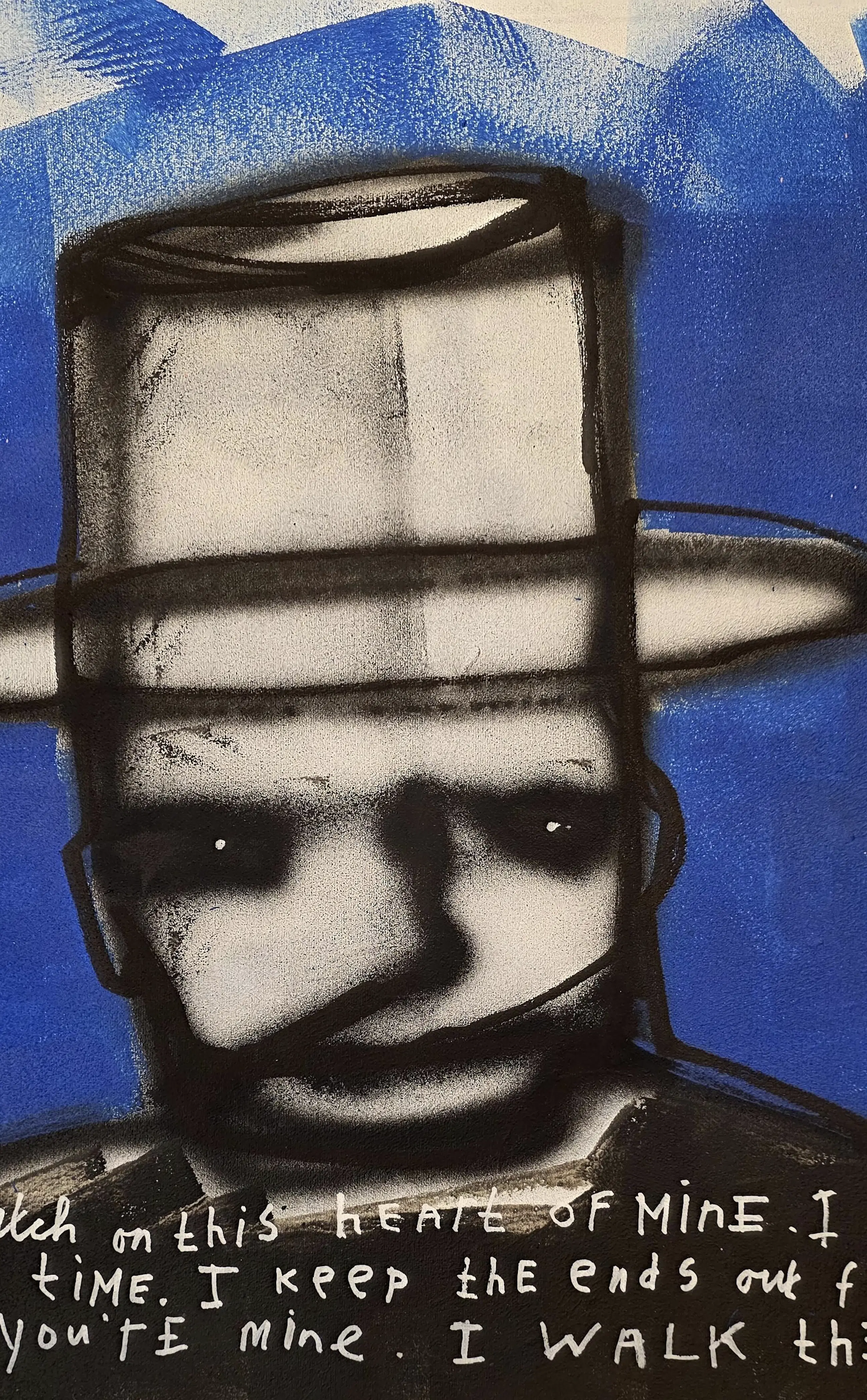 De figuur kijkt je recht aan. Hij is kwetsbaar, maar ook sterk. De blauwe achtergrond geeft rust en ruimte, terwijl de donkere lijnen de innerlijke strijd laten zien. Dit contrast tussen zachtheid en kracht komt vaak terug in mijn werk.