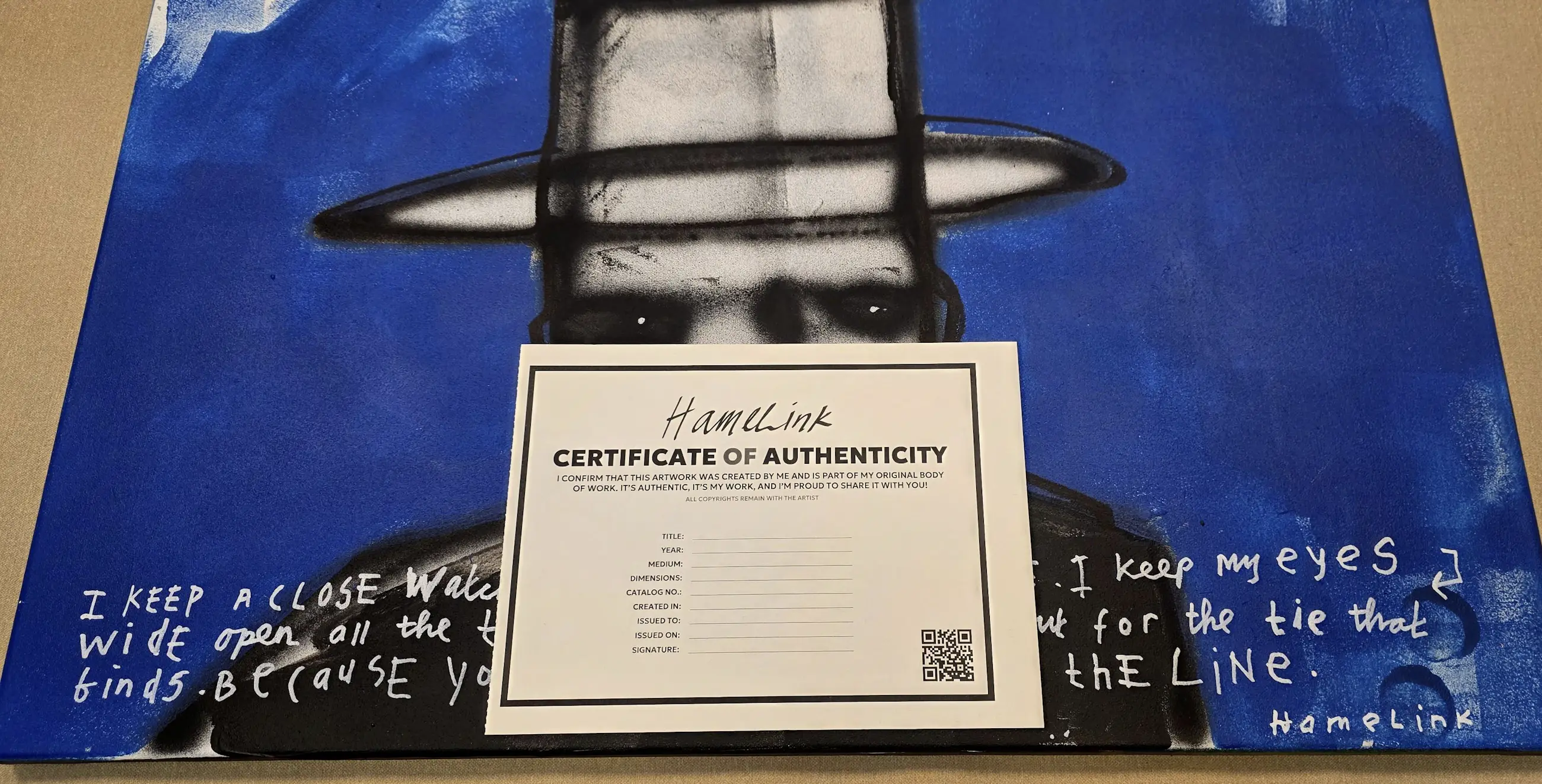 Het schilderij is gemaakt in mijn rauwe, directe en herkenbare stijl. Het gaat over loyaliteit, vertrouwen en het durven blijven staan.