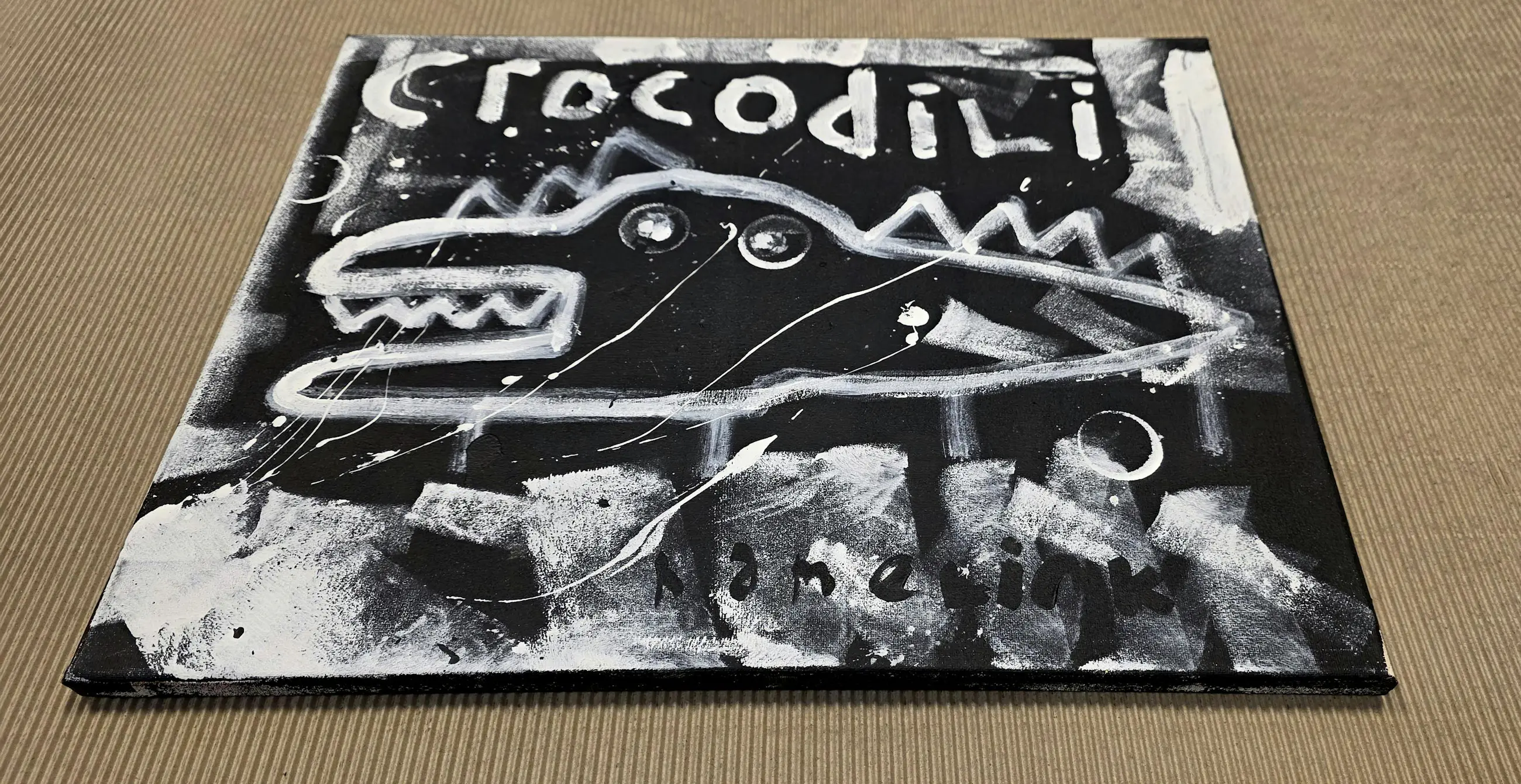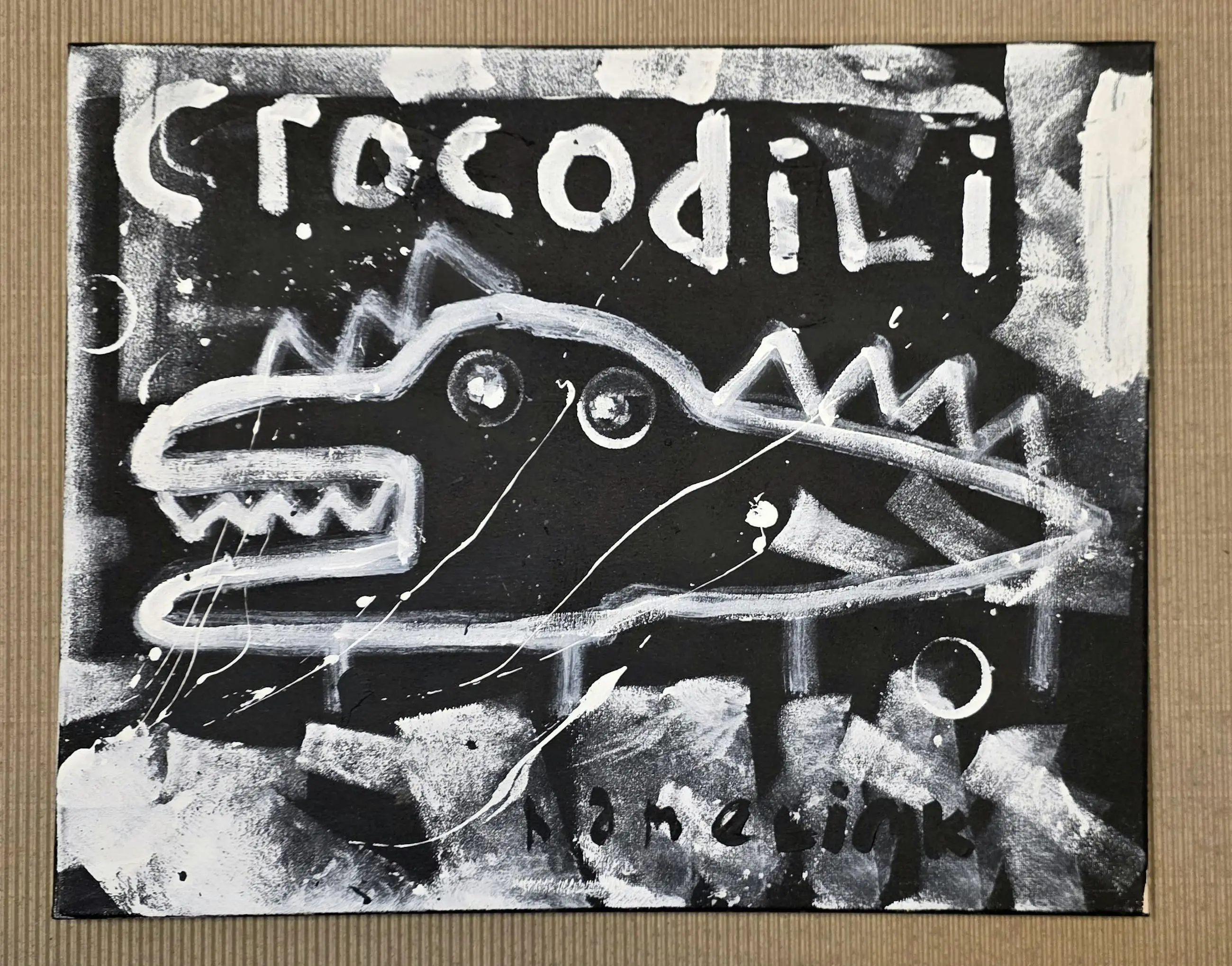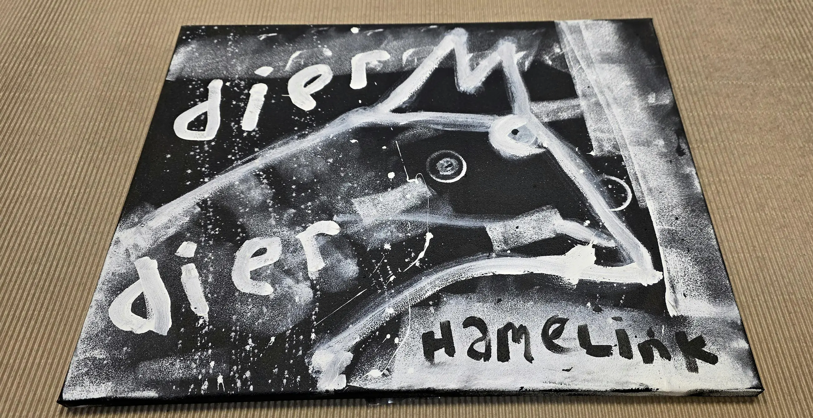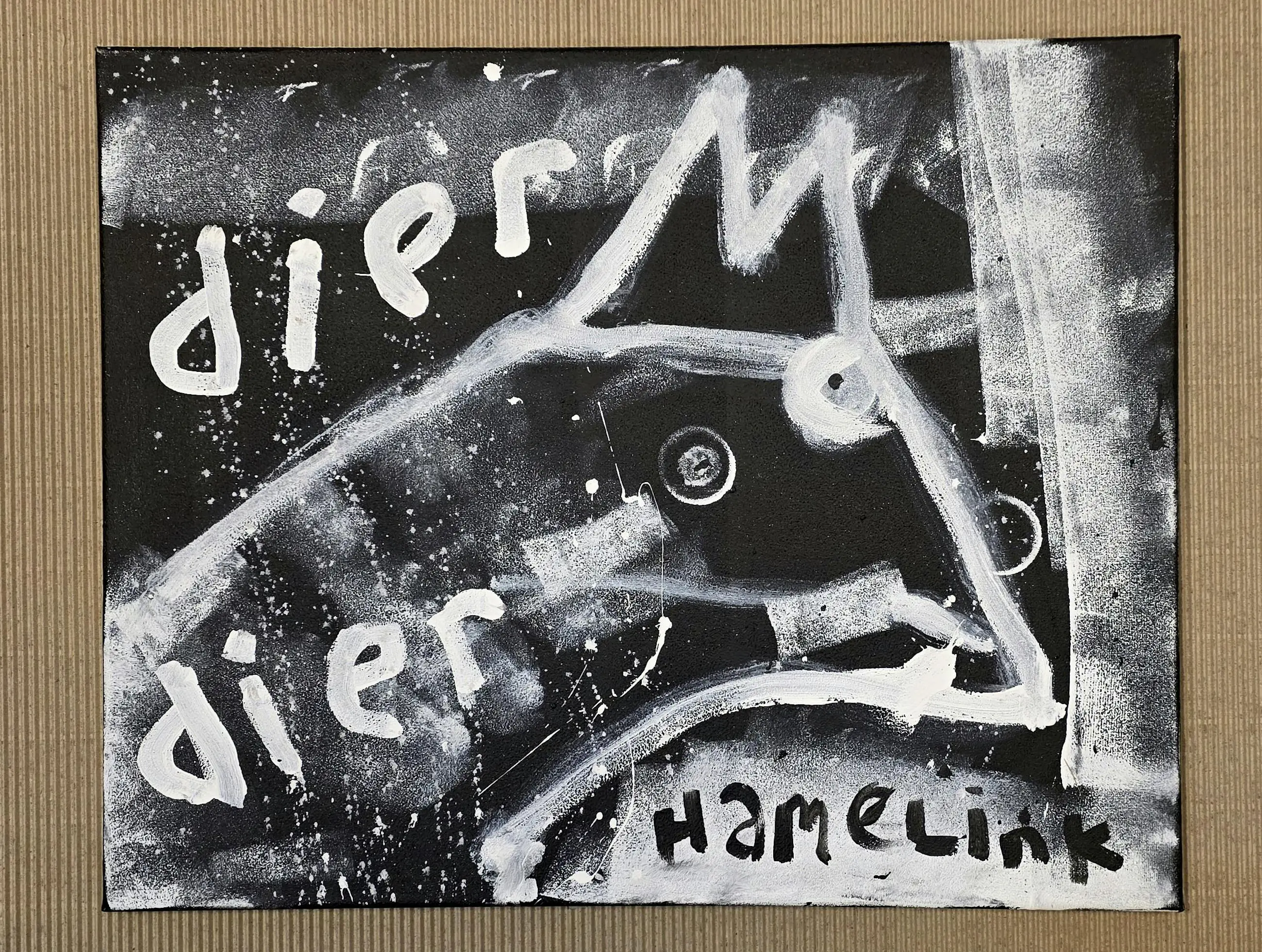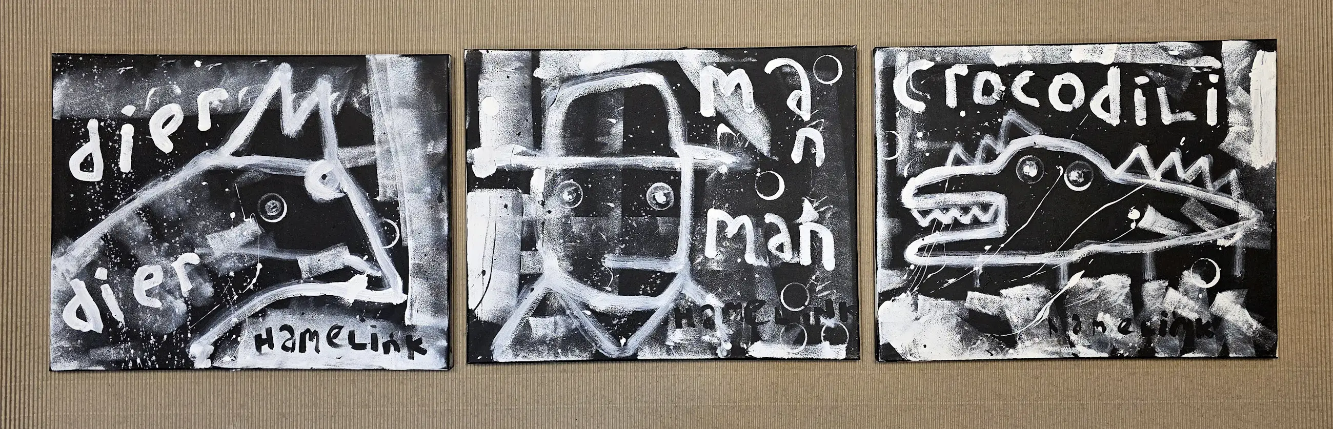Dit drieluik gaat over de relatie tussen mens en dier. Het bestaat uit drie losse werken van elk 50 x 40 cm, samen vormen ze één verhaal. Links zie je een dier, in het midden de mens en rechts opnieuw een dier. Het laat zien dat mens en dier dichter bij elkaar staan dan we vaak denken. We zijn verschillend, maar ook hetzelfde. De woorden en beelden zijn rauw en direct. De zwart-witte kleuren en grove lijnen geven het werk een krachtige en tijdloze uitstraling. Het voelt eerlijk en puur. Het gaat over instinct, over gevoel en over de balans tussen natuur en mens. Dit drieluik herinnert ons eraan dat we onderdeel zijn van de natuur. Niet erboven, maar er middenin. Het werk nodigt uit om te kijken naar wie we werkelijk zijn. Door het compacte formaat kunnen de werken dicht bij elkaar hangen, maar ook los in een ruimte. Samen vormen ze een sterk statement, maar ieder doek heeft ook zijn eigen kracht. Details Drieluik – 3 originele werken Formaat per doek: 50 x 40 cm Acryl en marker op canvas Handgeschilderd en uniek Op spieraam Gesigneerd Inclusief certificaat van echtheid Sfeerbeelden dienen ter illustratie Meer werk: www.barthamelink.com Instagram: @hamelink.art.bart