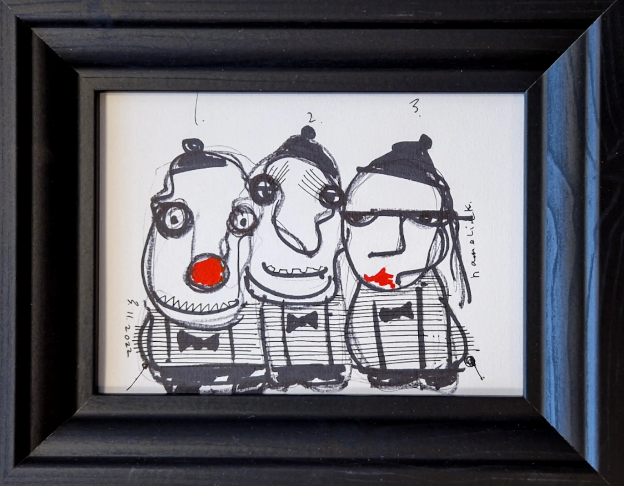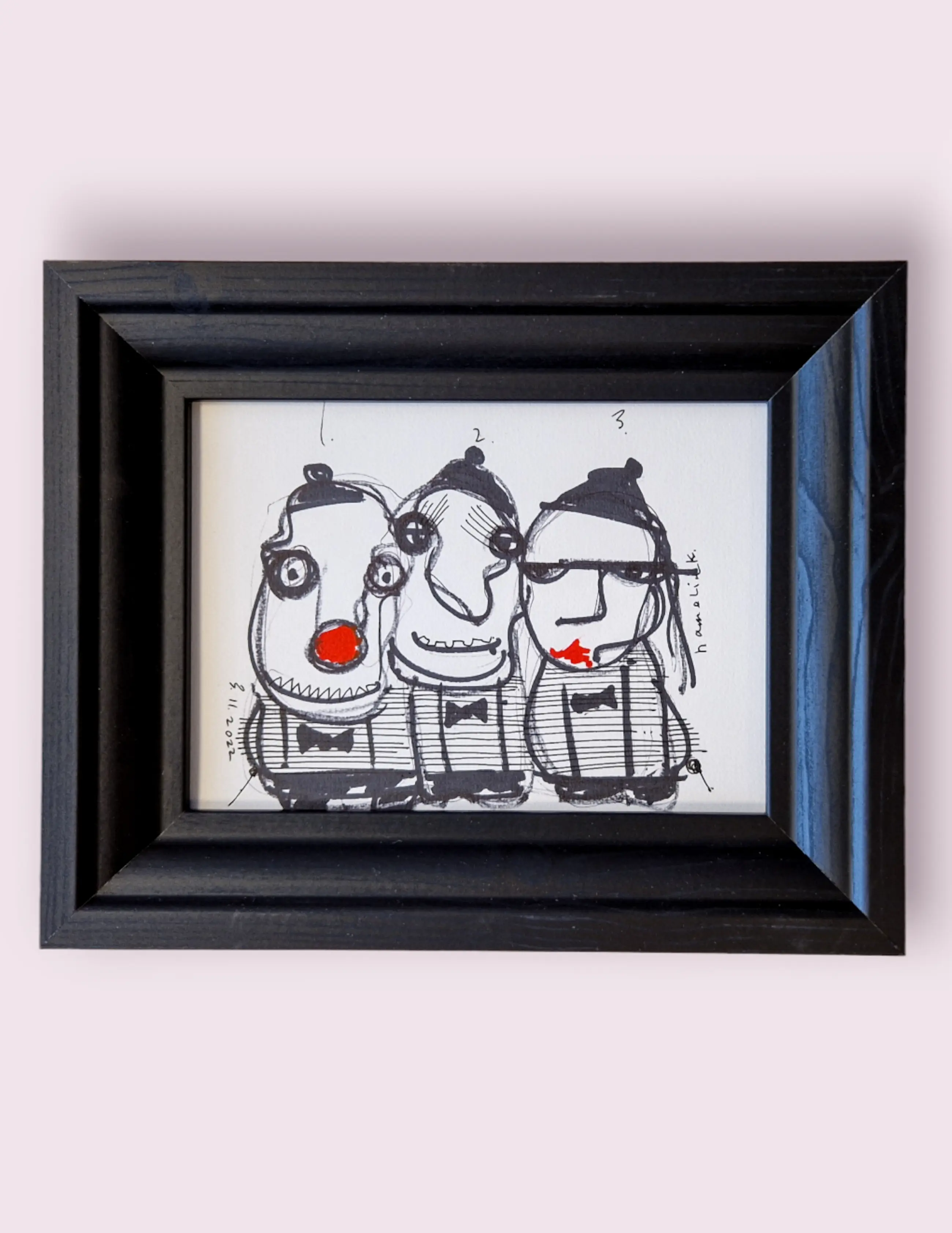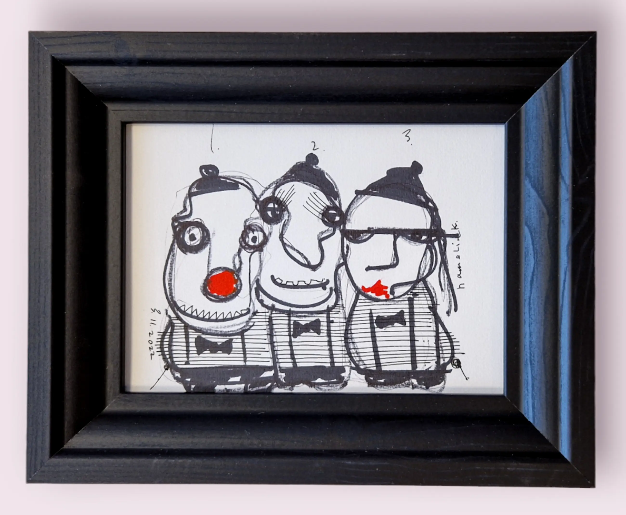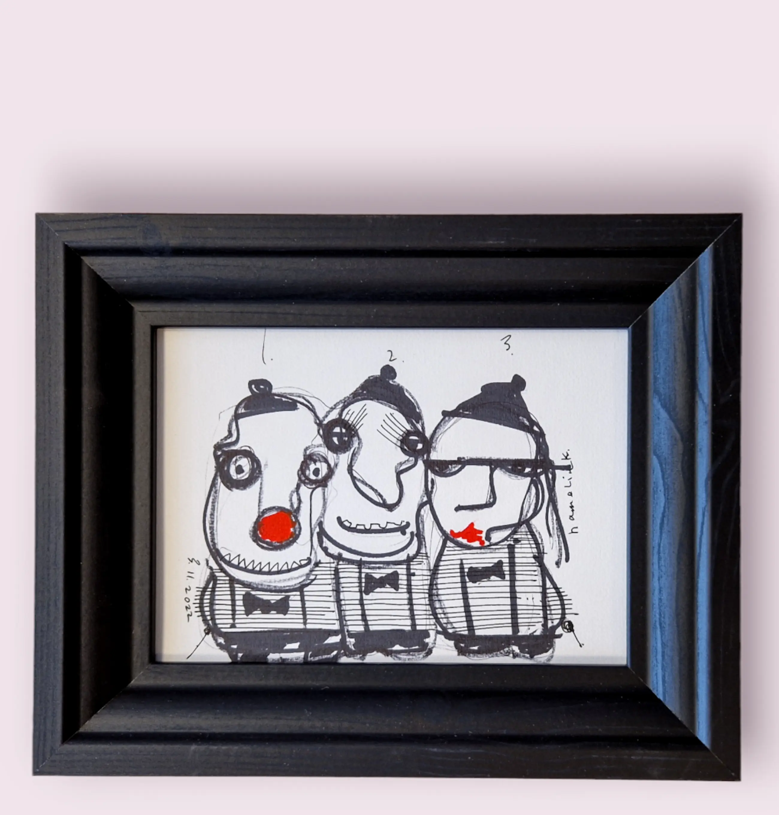 Originele illustratie tekening van de Nederlandse kunstschilder/ illustrator. Een tekening van 3 figuren . Bart Hamelink werkt met verschillende technieken waar onder acrylverf, inkt , marker, airbrush en graffiti. Hij heeft zijn kunstenaars opleiding afgerond in Delft ( Nederland ) . Zijn thema's zijn vaak mensen en dieren.