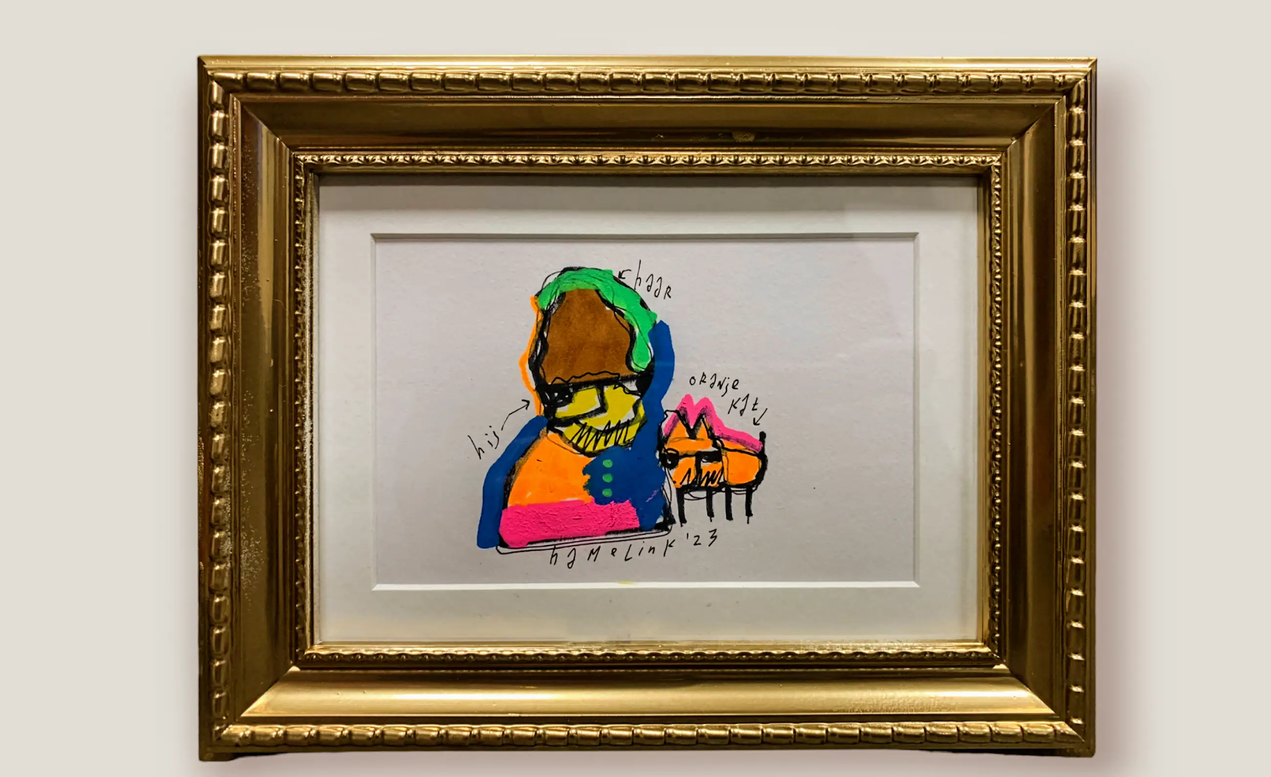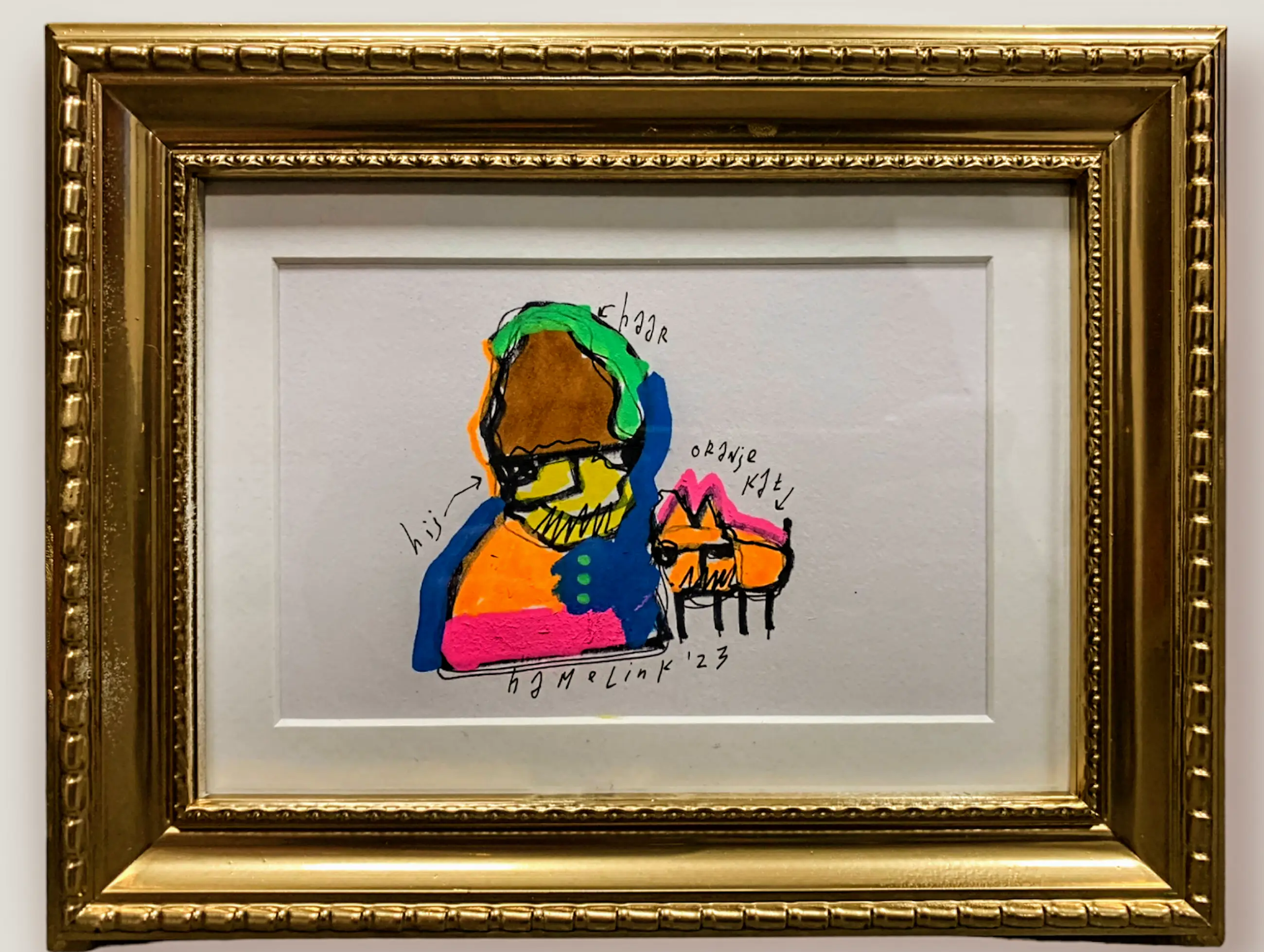 Leuke , kleurrijke orginele illustratie tekening van de Nederlandse kunstenaar Hamelink. Handgemaakt in 2023 met acryl, marker, ink. Illustratie tekening van een kat met een mens.