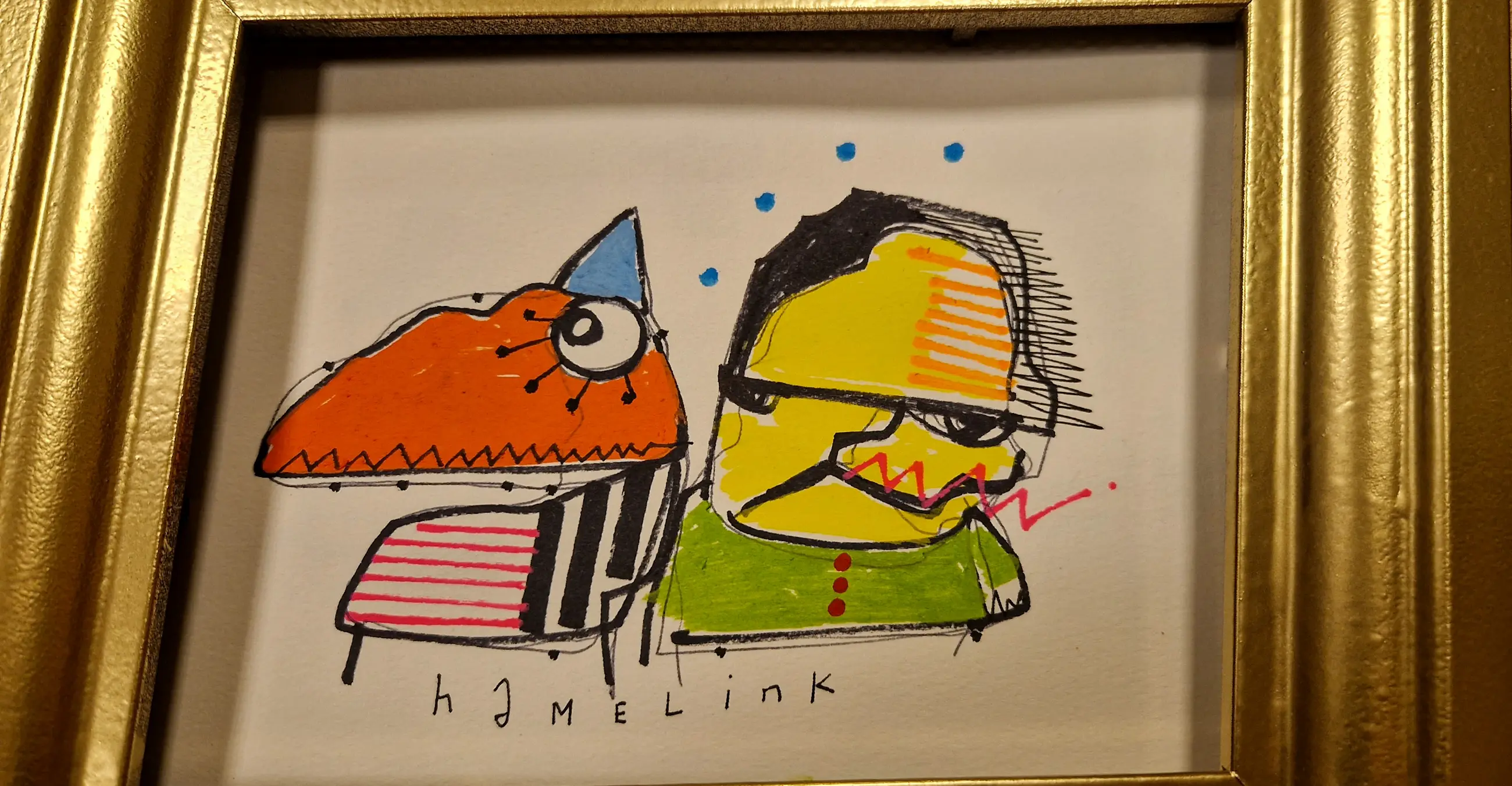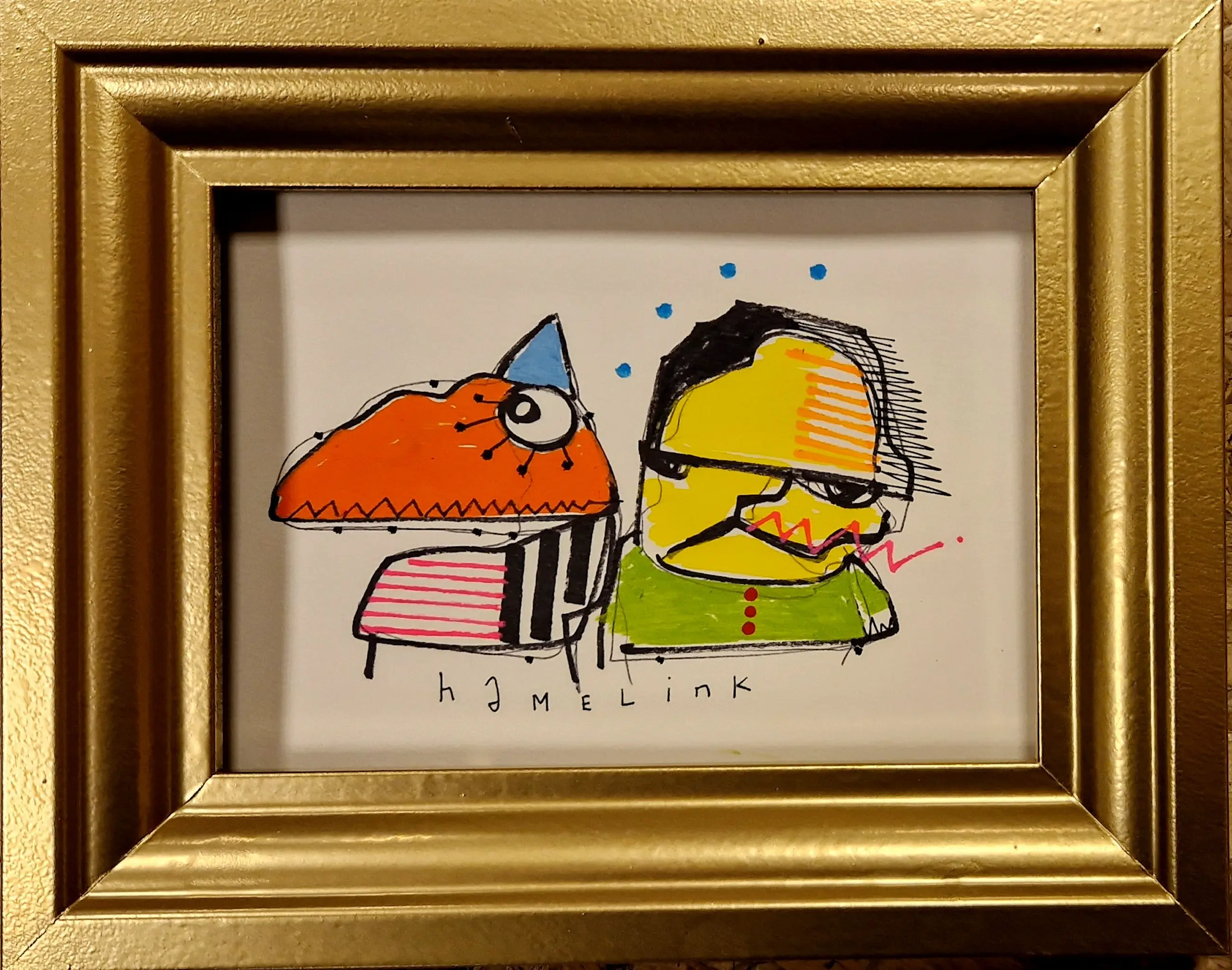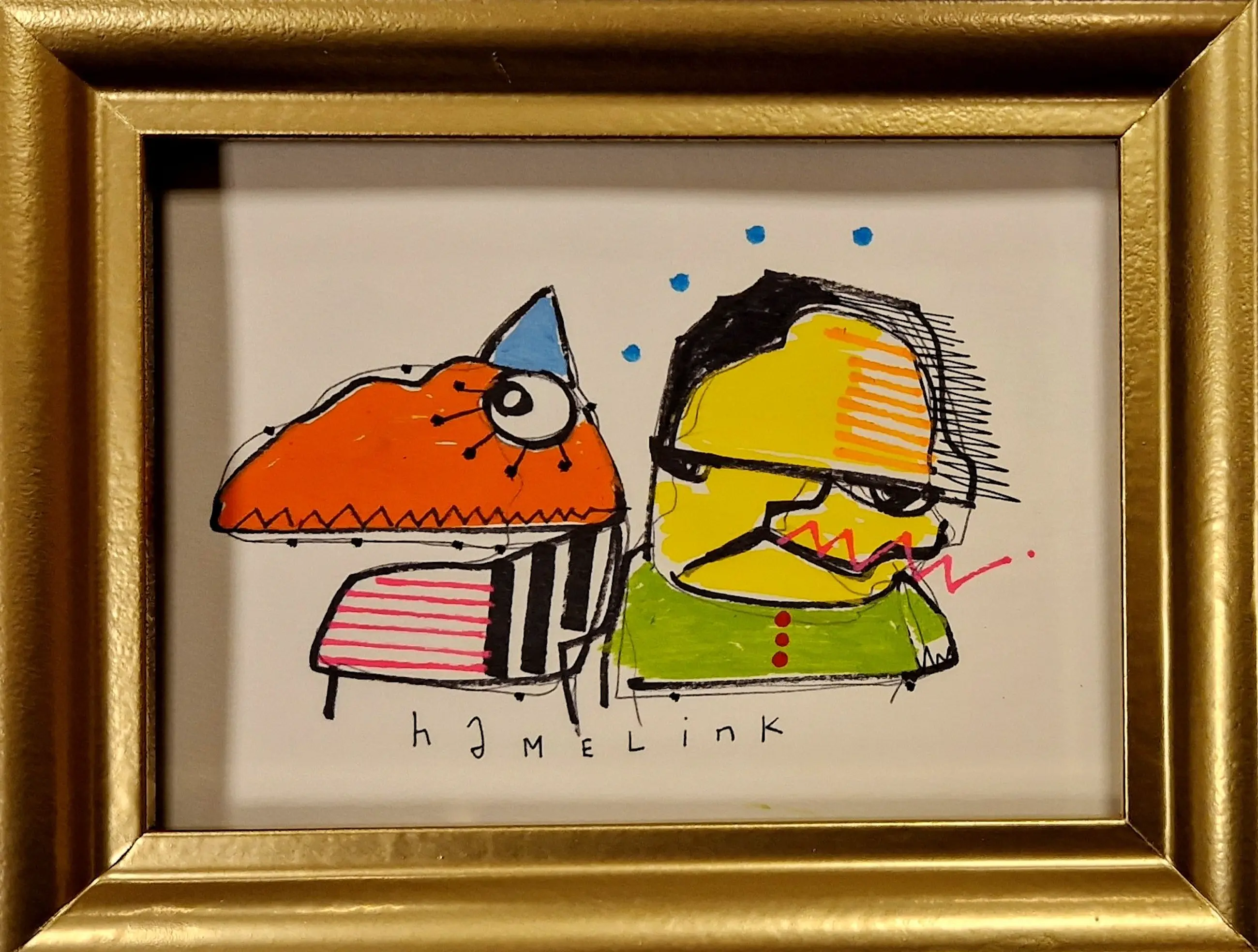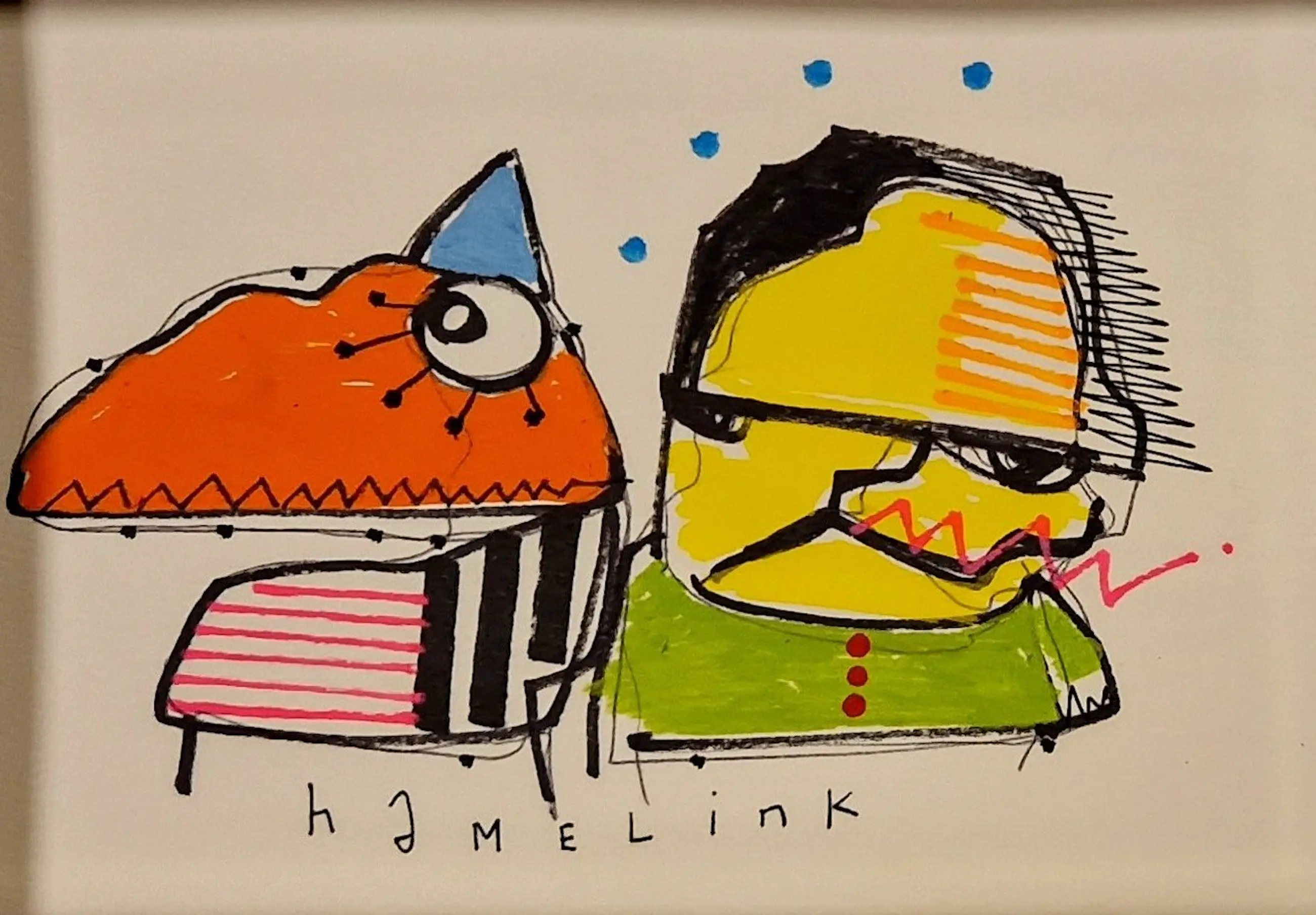 Orginele illustratie tekening van Hamelink. Getekend een poppetje met zijn hondje . Gemaakt op 250 gram papier met acryl verf en inkt . Het werk is inclusief lijst en ondertekend met hamelink en in perfecte staat.