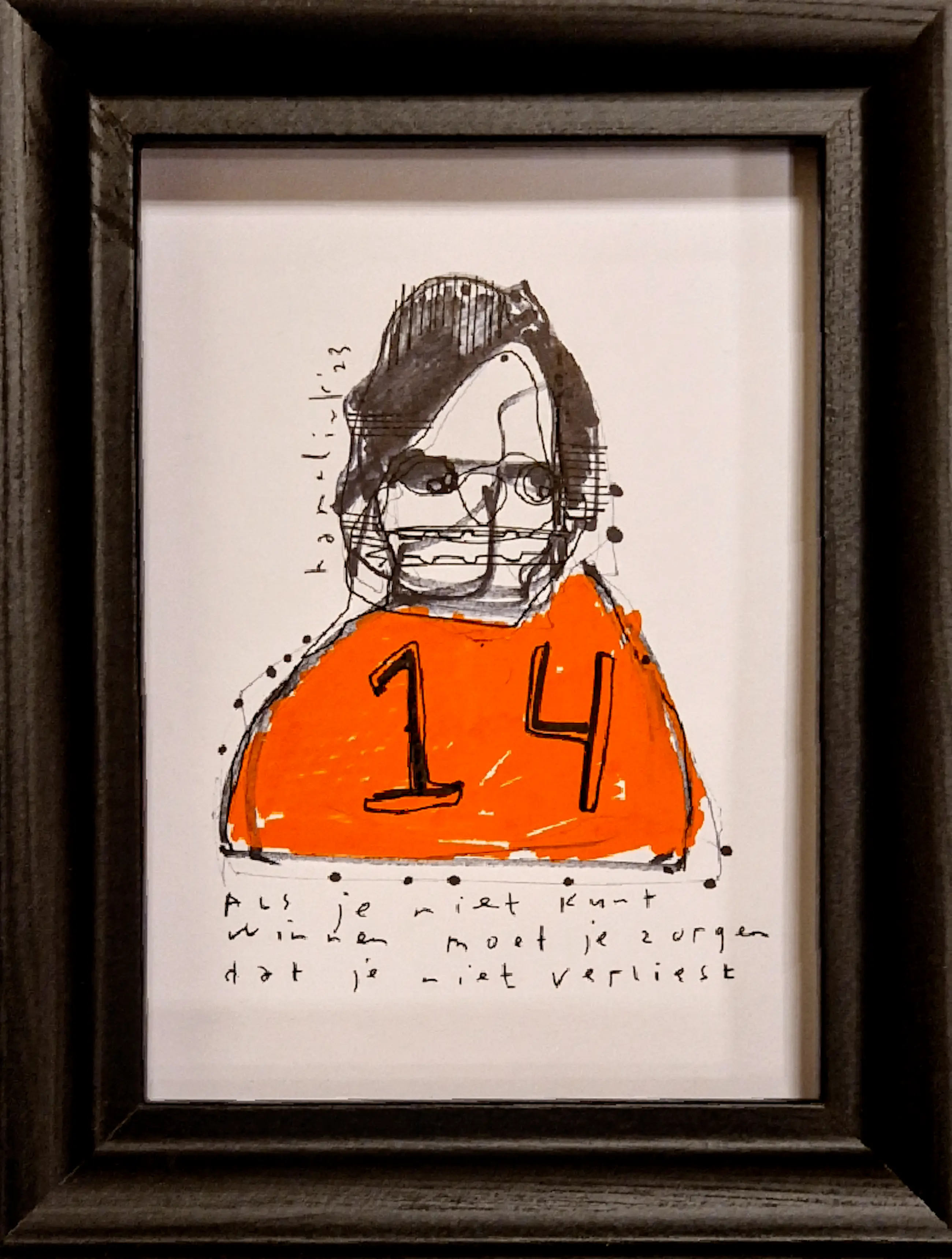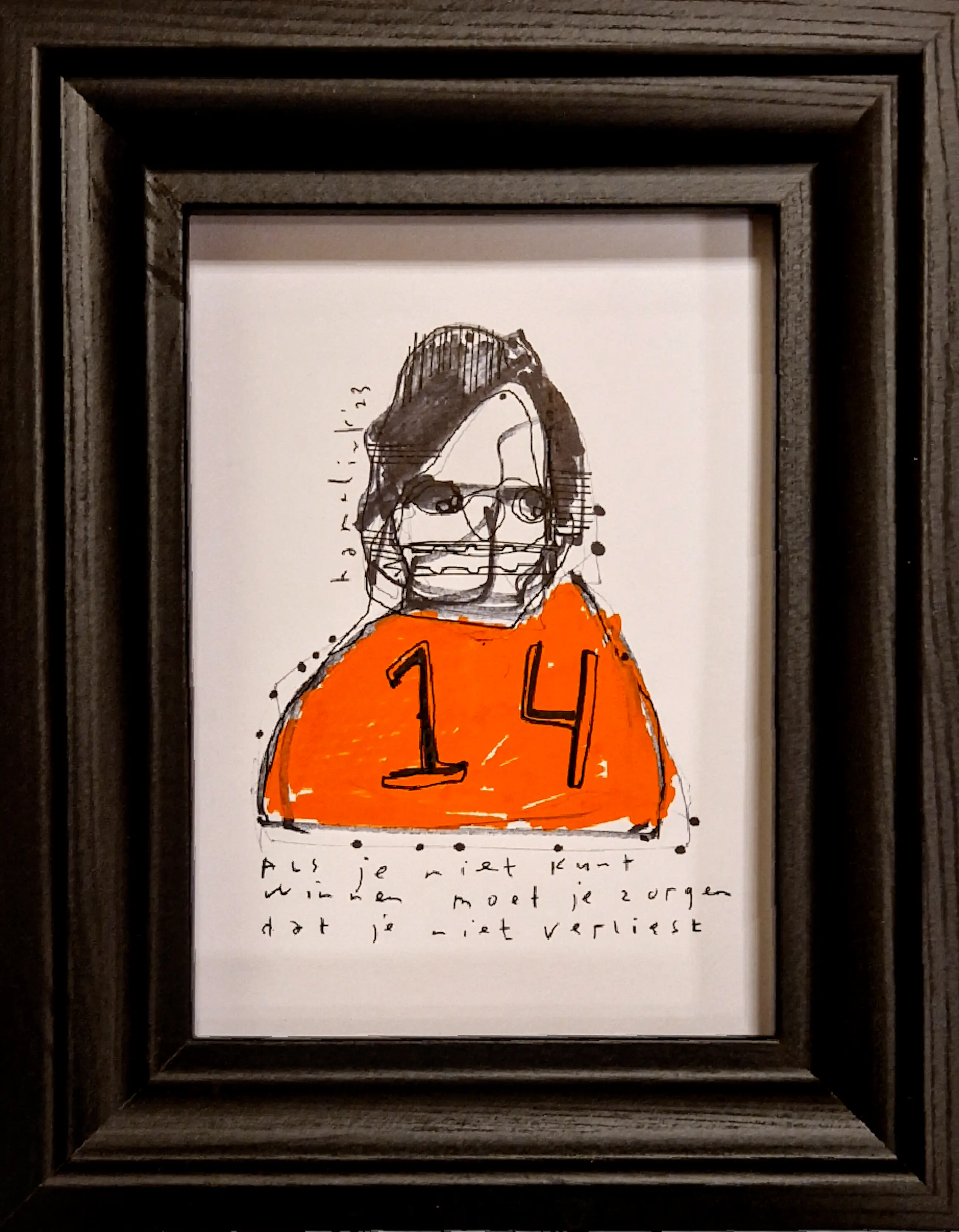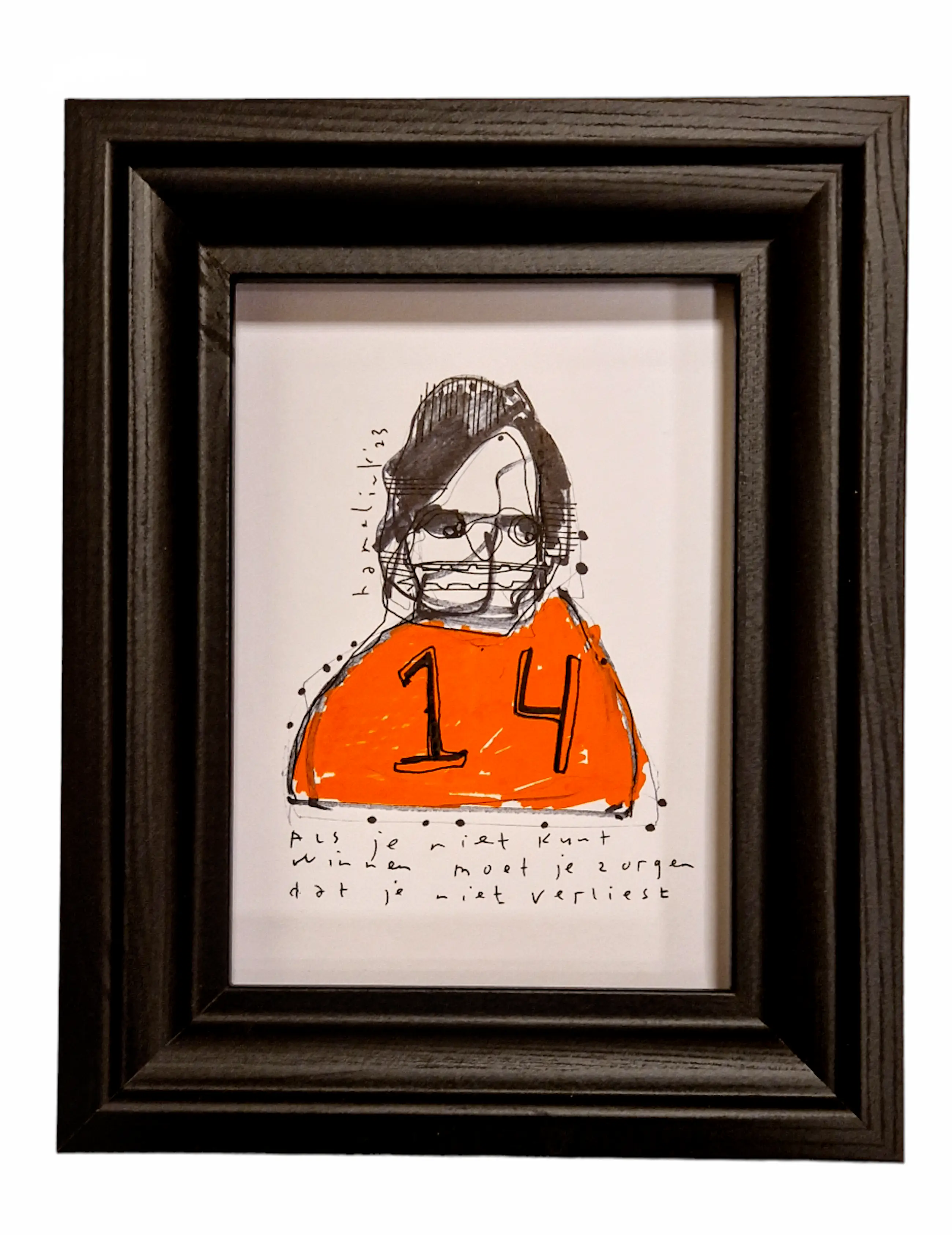Orginele illustratie tekening van de Nederlandse kunstenaar , cartoonist Bart Hamelink. Een illustratie tekening van een Nederlandse voetballer. Geïnspireerd door nr 14 Johan Cruyff. Met onder de tekening hand geschreven 1 van zijn citaten. Als je niet kunt winnen moet je zorgen dat je niet verliest. De tekening is gemaakt met acryl verf op 250 gram papier.