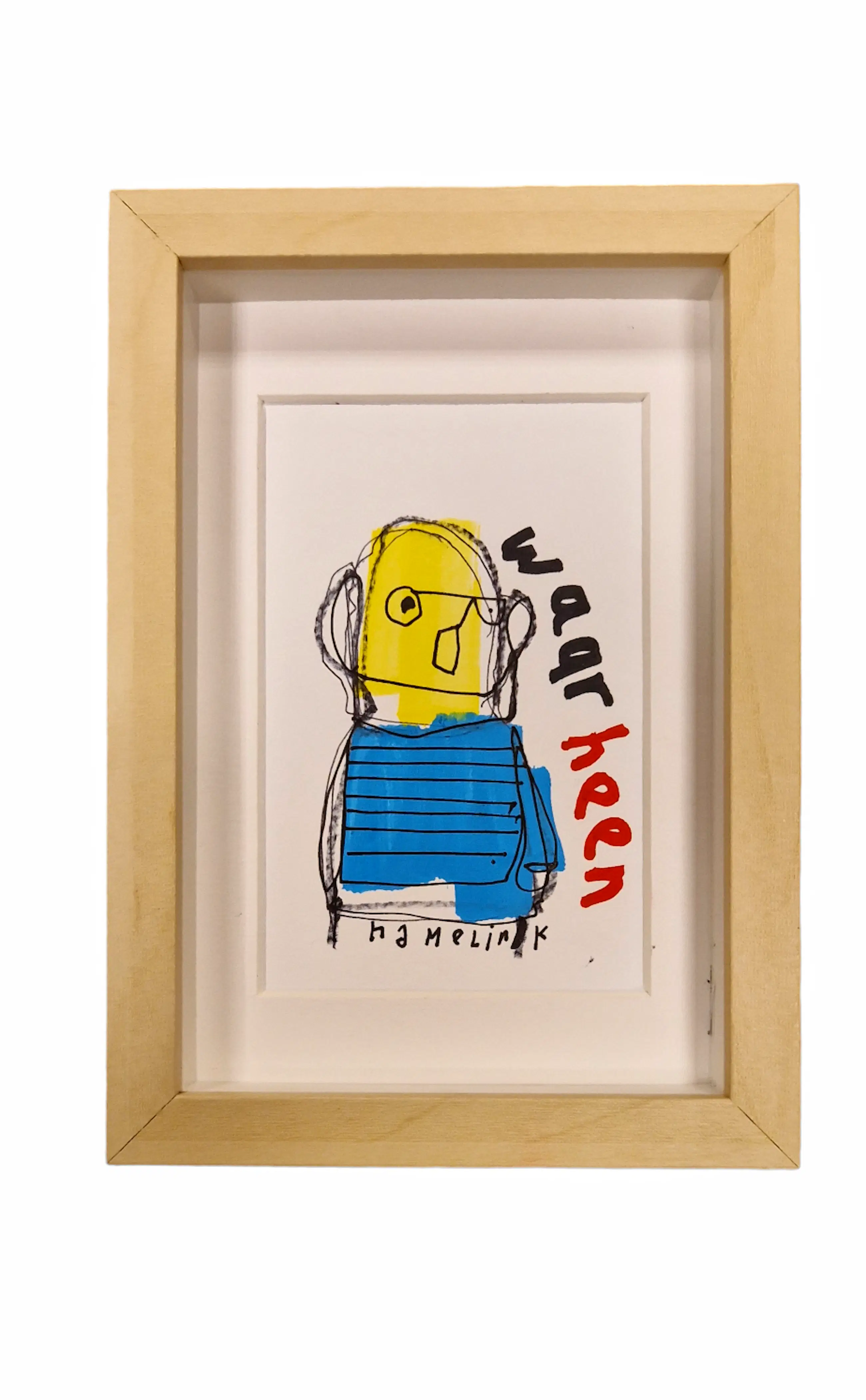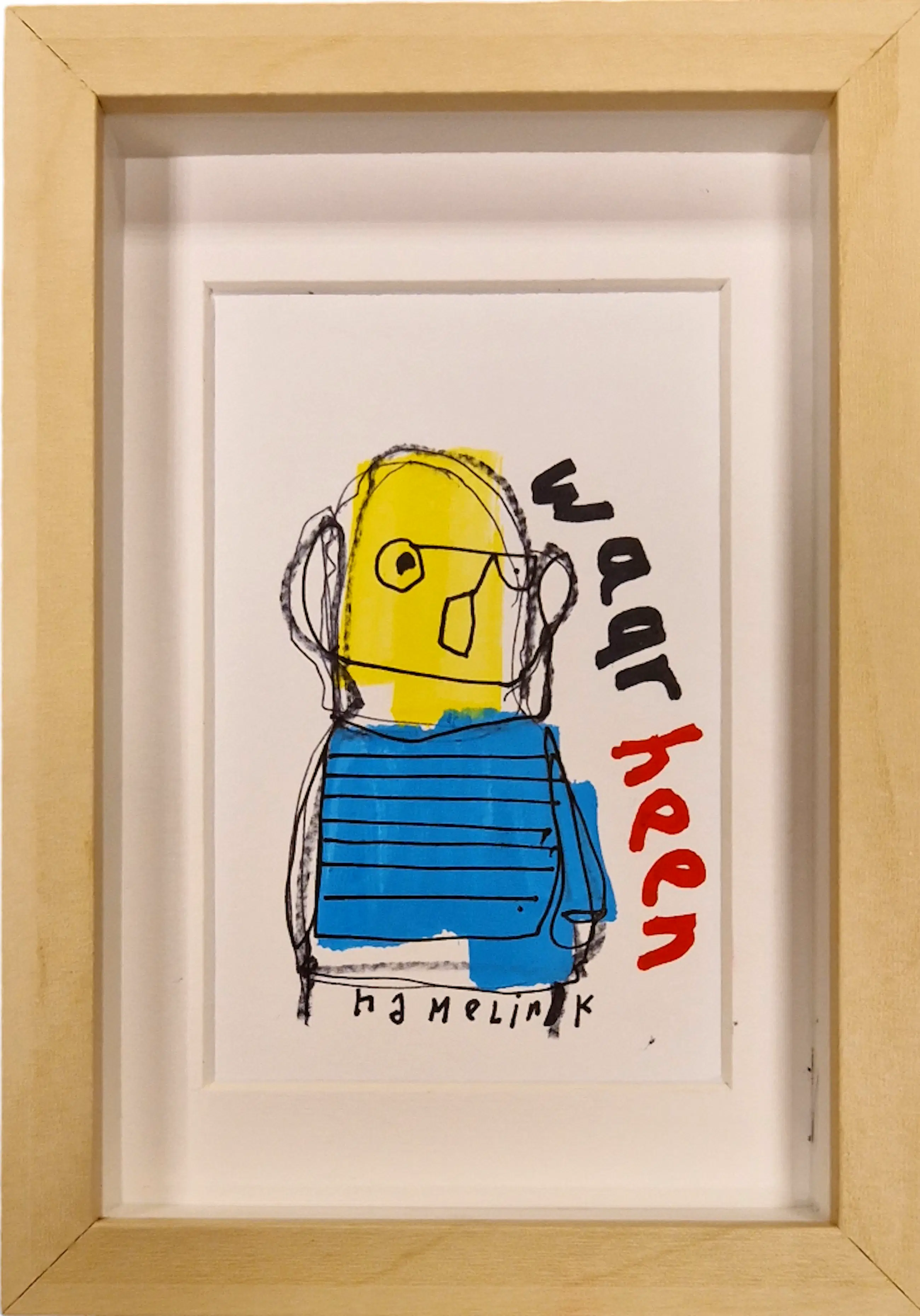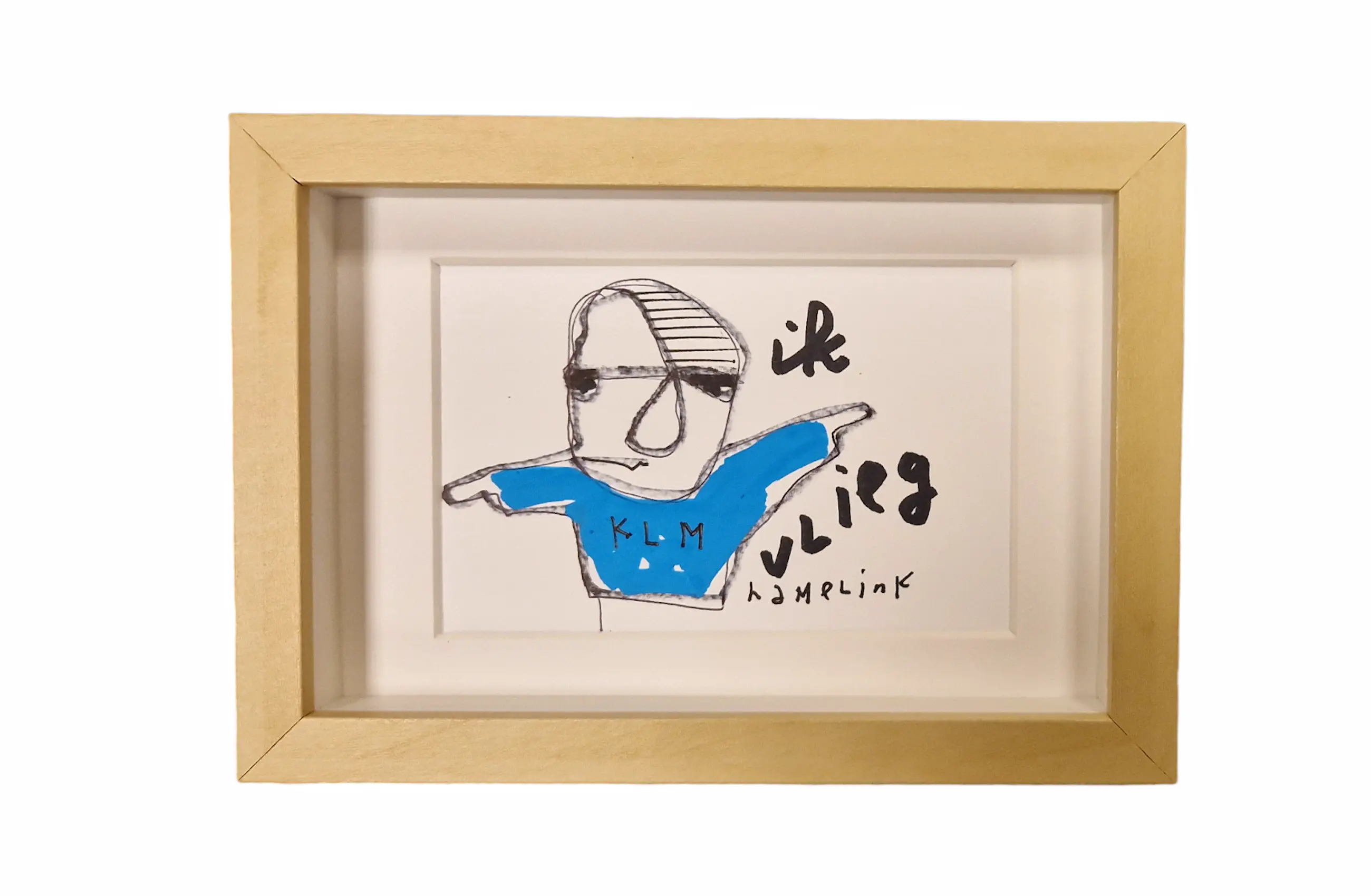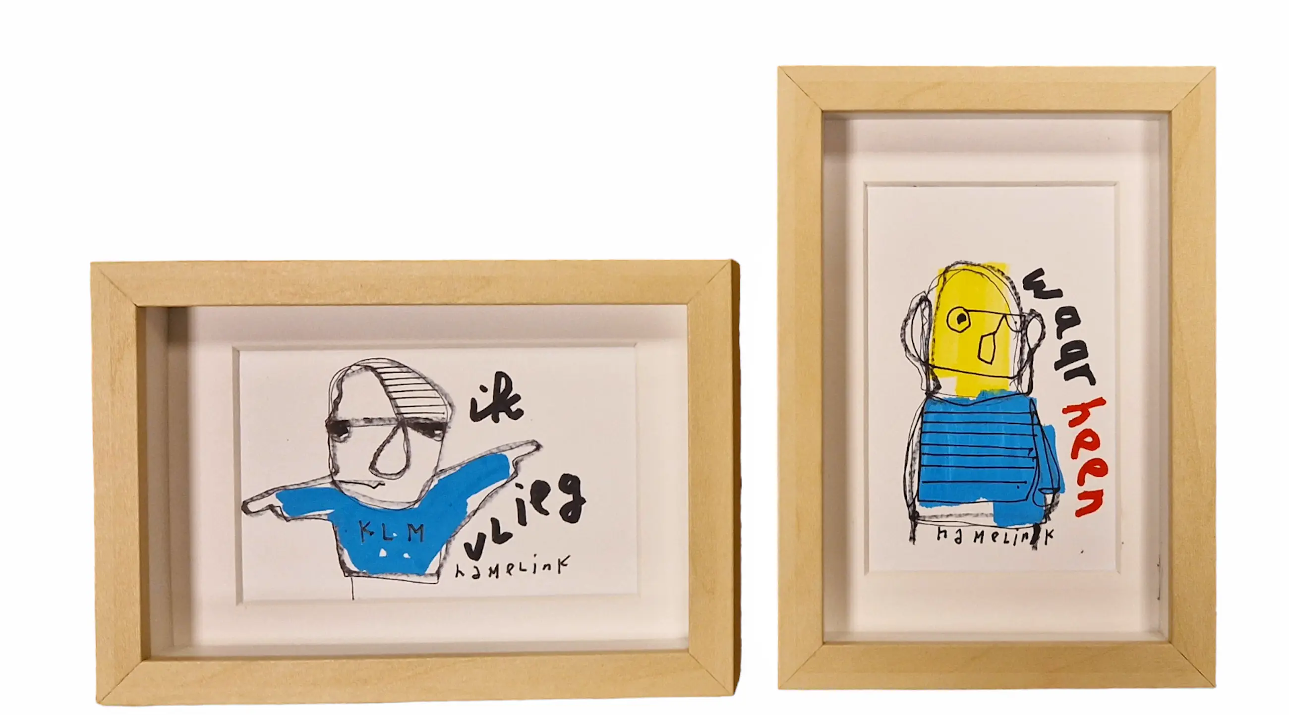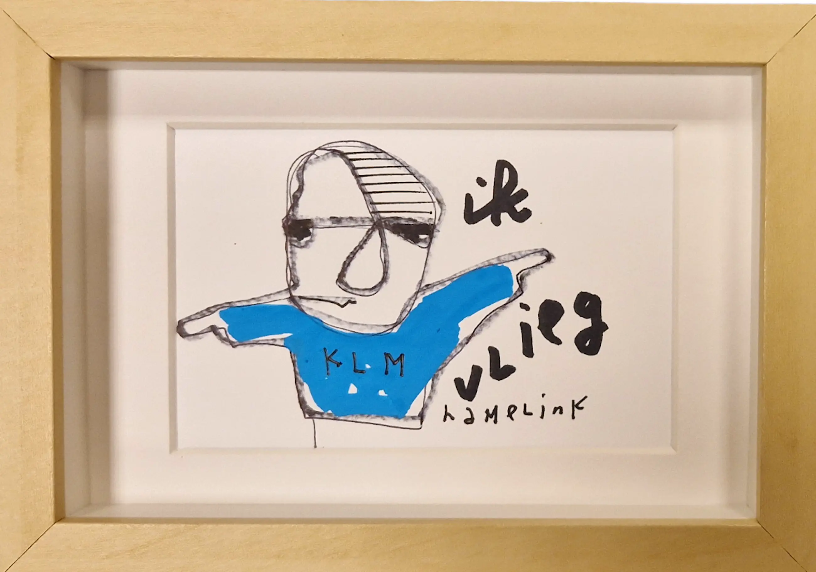 Een 2 luik illustratie tekening geïnspireerd door de Nederlandse kunstenaar Herman Brood. Geïllustreerd door de Nederlandse kunstenaar Bart Hamelink. In de eerste tekening een figuur met de tekst KLM op zijn shirt. En daar onder de tekst : Ik vlieg. In de 2e tekening een tekening van een figuur met daarbij de tekst : waarheen. De werken zijn ondertekend met Hamelink en in perfecte staat.