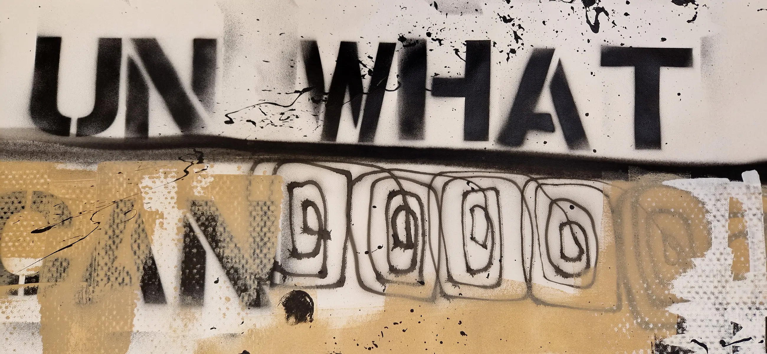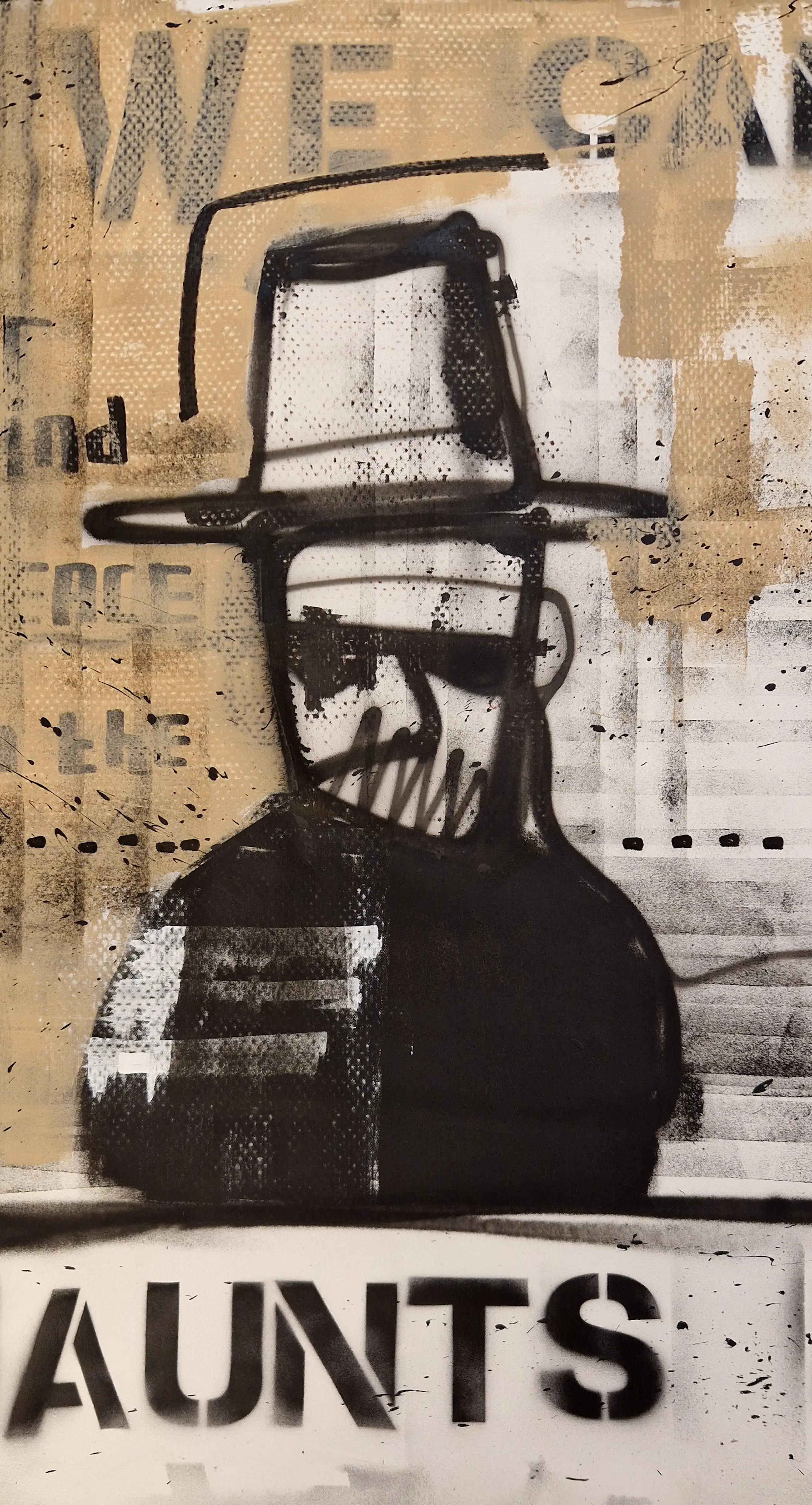 De zwart-witte figuren met hoge hoeden vormen een duistere, haast filmische scène. De gelaagde achtergrond, gecombineerd met grove lijnen en stenciling, geeft het werk een intense, rauwe uitstraling. Een diep menselijk thema, verpakt in een iconisch beeld.