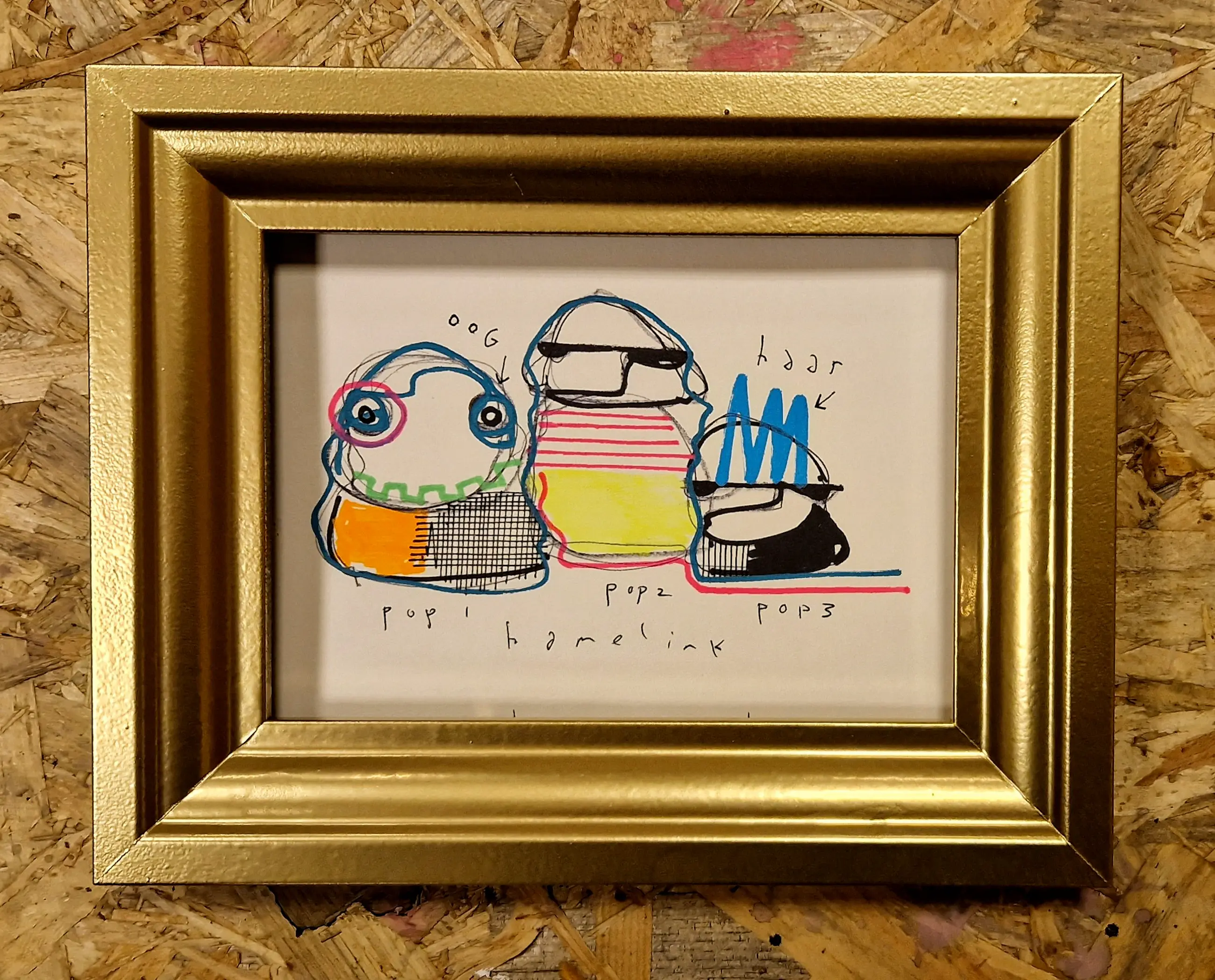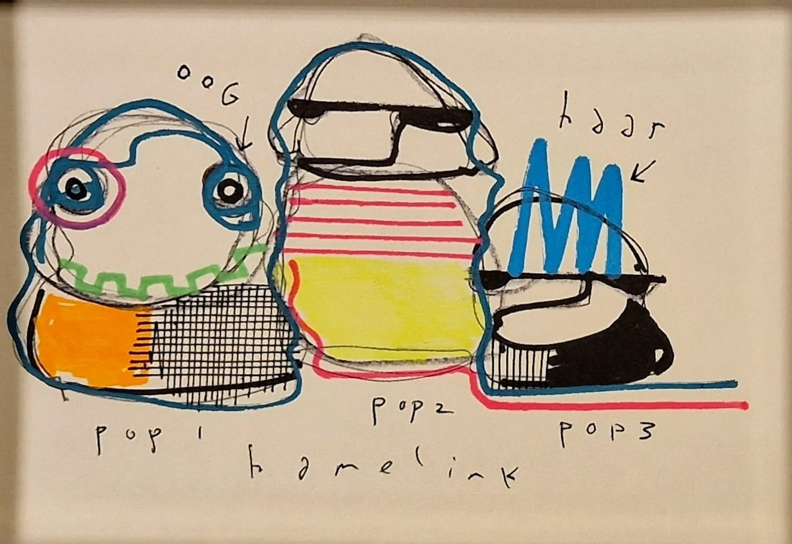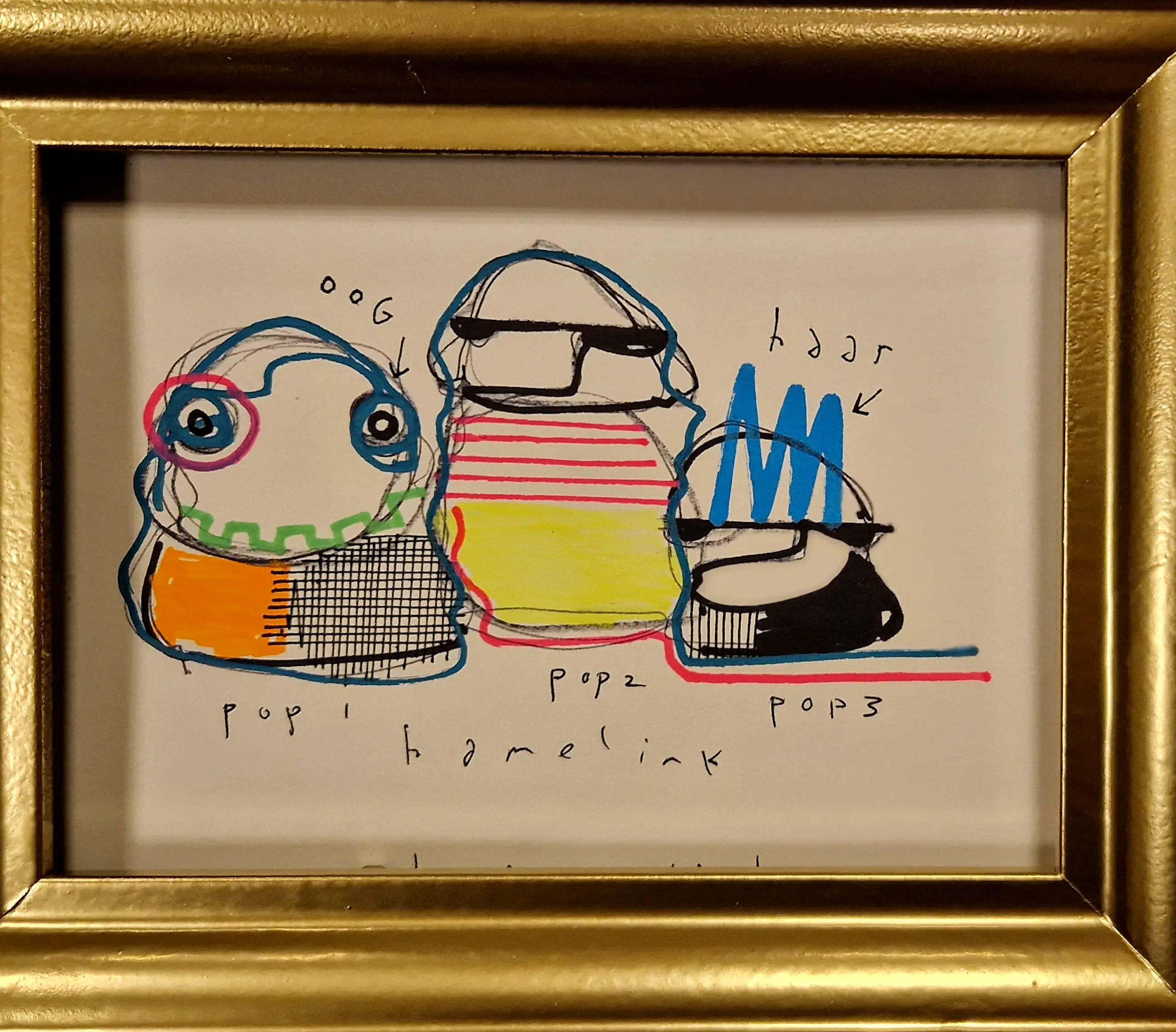 Orginel illustratie cartoon tekening van 3 poppetje. Met de tekst erbij 1 pop , 2 pop , 3 pop. En met de tekst oog, haar. De tekening is genaakt op 250 gram papier met acrylverf en inkt. Het werk is in perfecte staat.