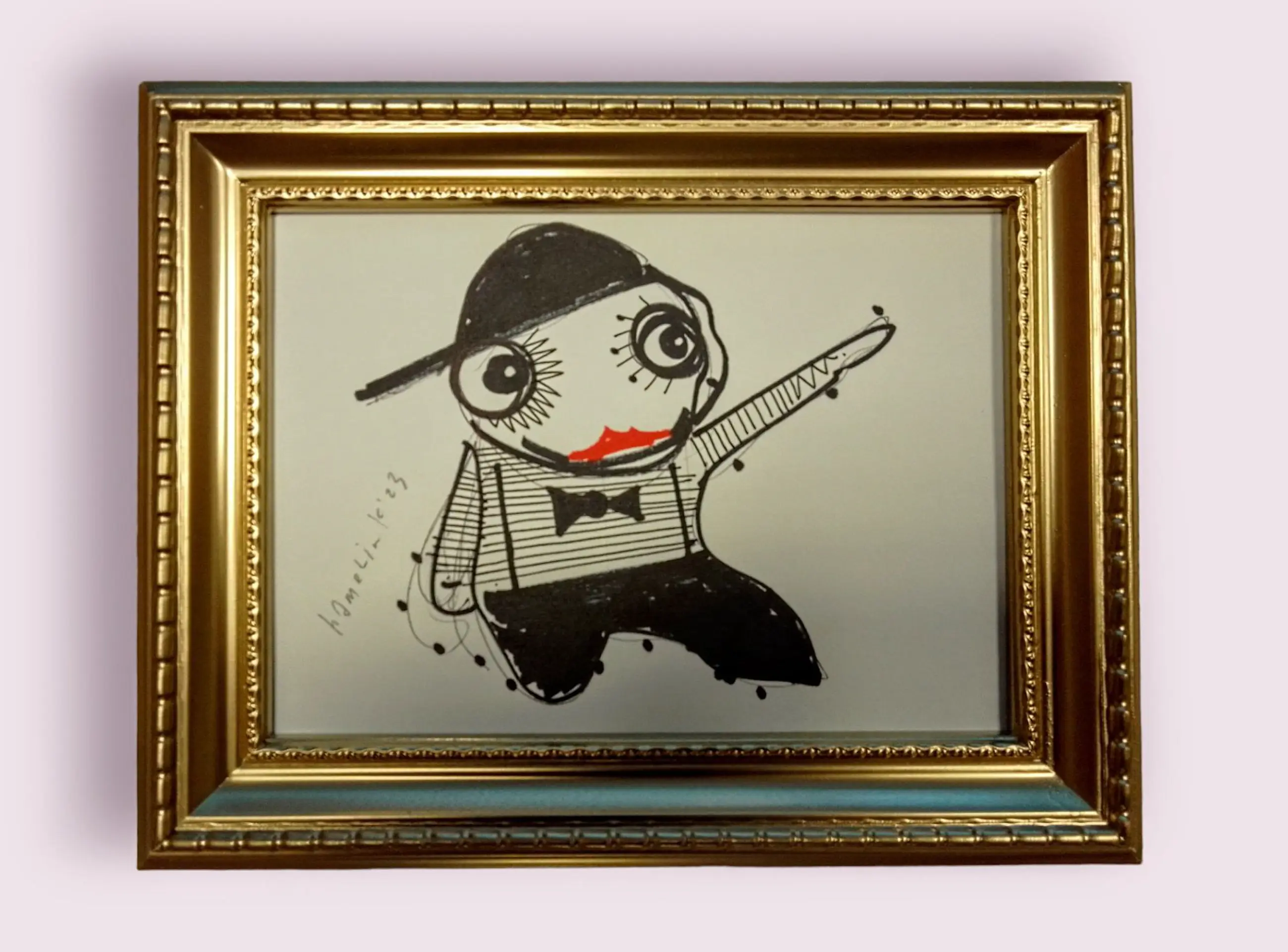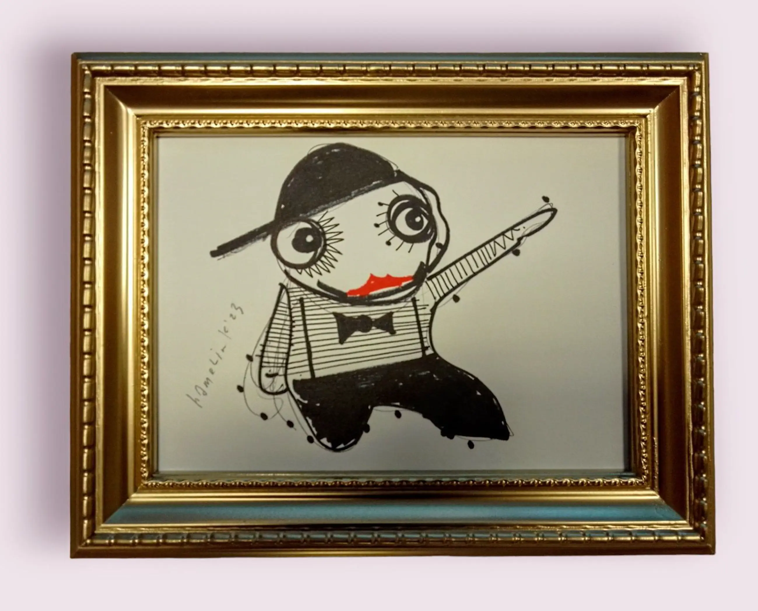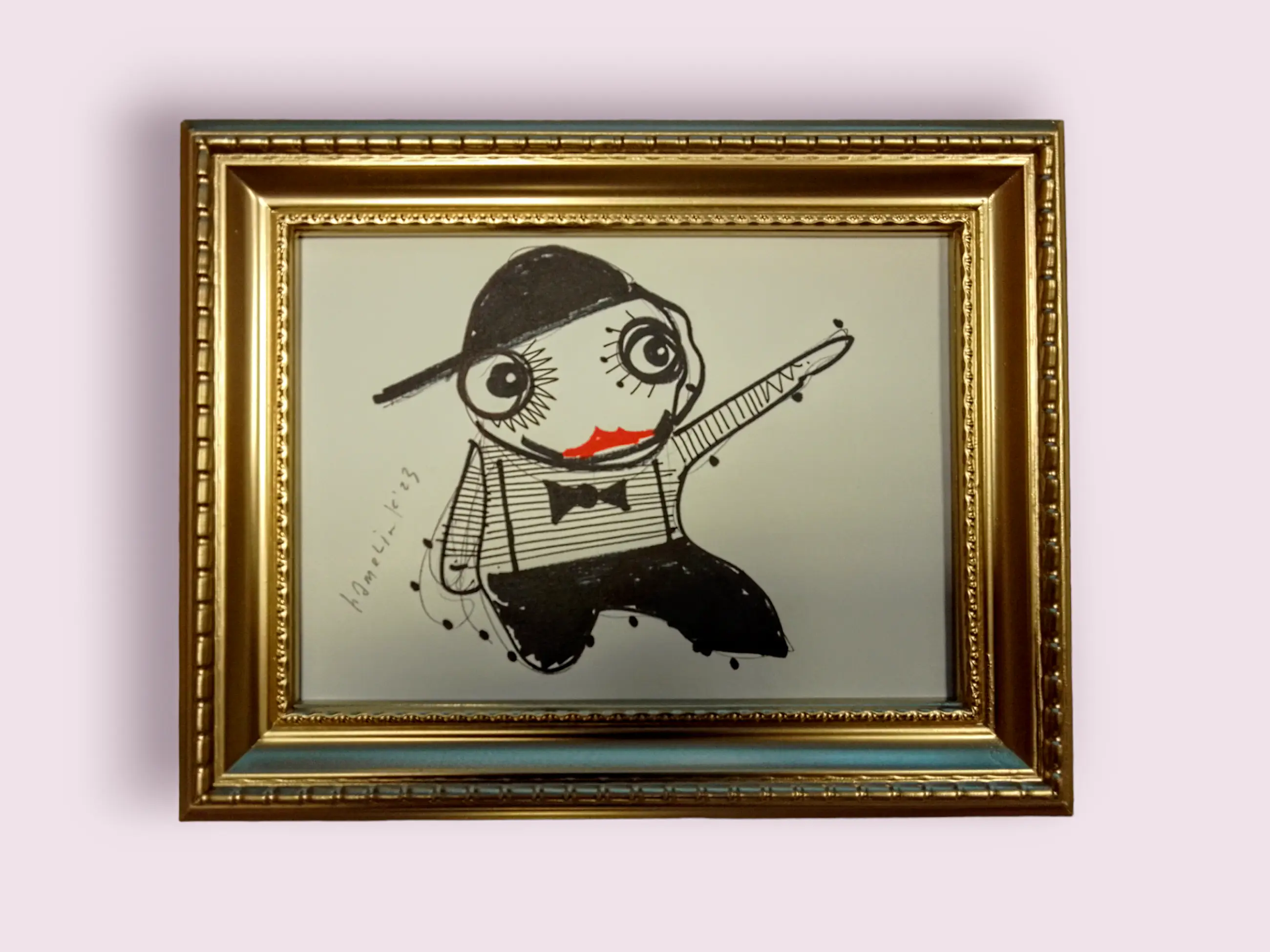 Tekening van een private Dancer. Gemaakt op papier en ingelijst. De lijst is gespoten met blad glans goud. Het werkje is gemaakt met acryl marker en inkt. Verder is het werk in perfecte staat .