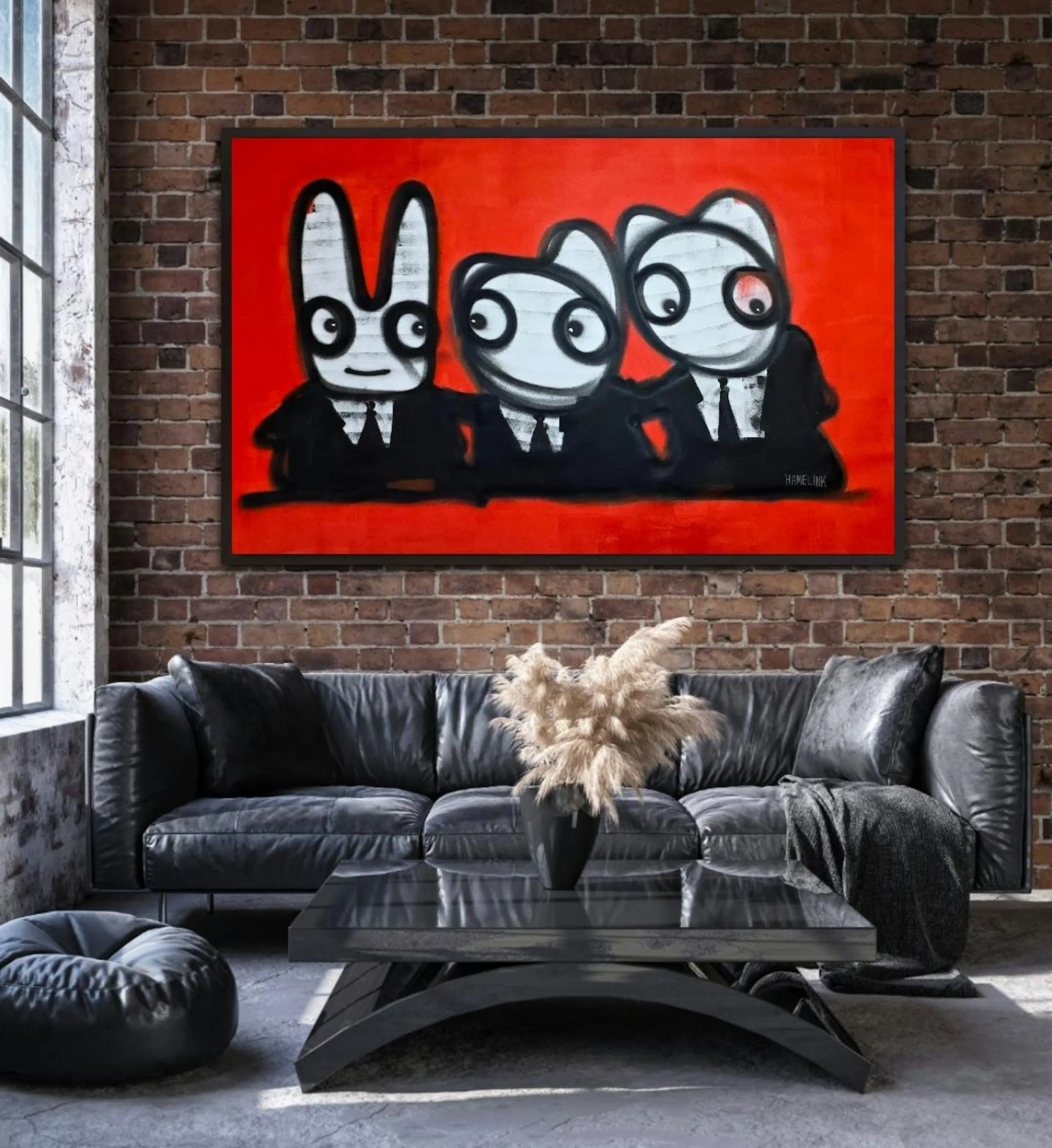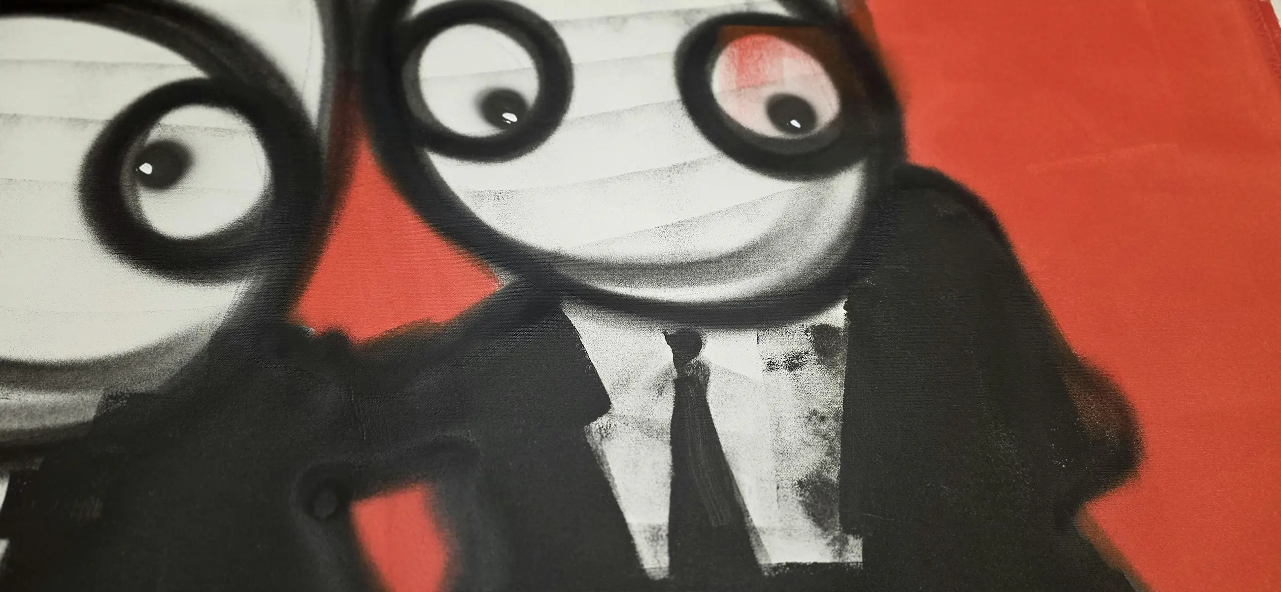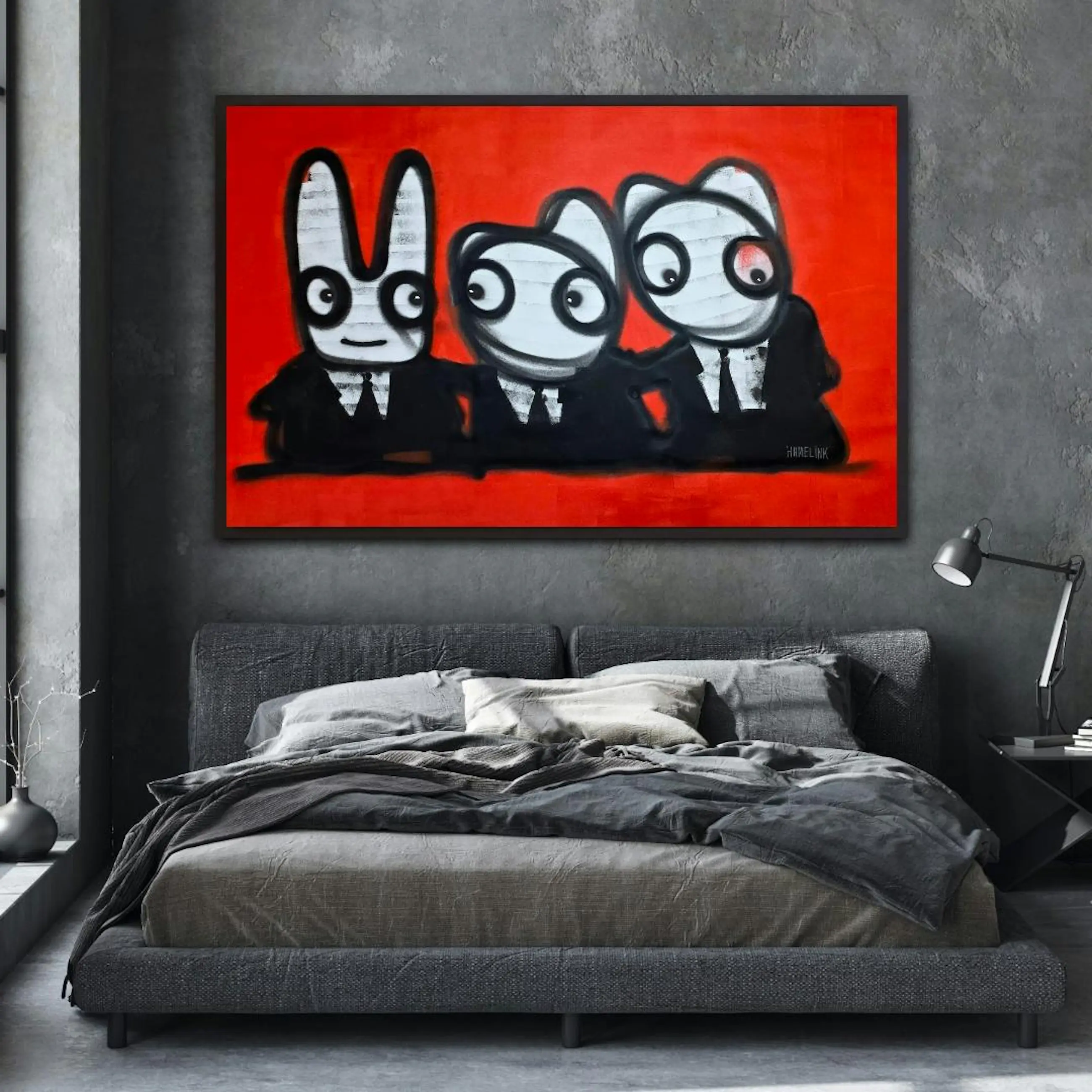 Drie figuren zitten naast elkaar aan dezelfde tafel, tegen een krachtige rode achtergrond. Ze kijken niet allemaal dezelfde kant op, maar horen wel bij elkaar. Het werk speelt met onderlinge dynamiek: samen zijn, maar ieder met zijn eigen blik, houding en gedachte. De rode achtergrond geeft het werk energie en spanning, terwijl de herkenbare Hamelink-figuren zorgen voor humor en lichtheid. Het voelt als een gesprek zonder woorden — iedereen zit erbij, niemand neemt echt de leiding. Typisch neo-expressionistisch werk van Bart Hamelink: rauwe lijnen, eenvoudige vormen, sterke contrasten en een scène die blijft hangen zonder uitleg nodig te hebben. Het werk past zowel in een modern als industrieel interieur en trekt direct de aandacht. Extra informatie Uniek origineel kunstwerk Handgeschilderd door Bart Hamelink Acrylverf op doek Gesigneerd door de kunstenaar Wordt geleverd zonder spieraam (vanwege hoge transportkosten en kleinere kans op beschadiging) Inclusief certificaat van echtheid De getoonde afbeeldingen zijn sfeerfoto’s waarin het werk ingelijst en opgespannen aan de muur hangt Meer werk en achtergrond van de kunstenaar: Website: www.barthamelink.com Instagram: @hamelink.art.bart