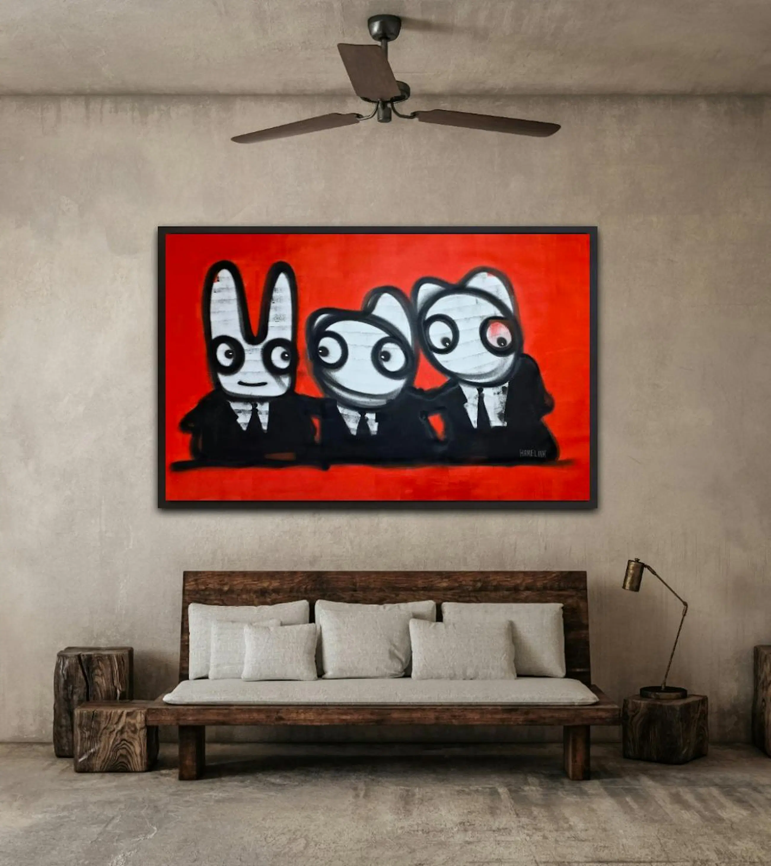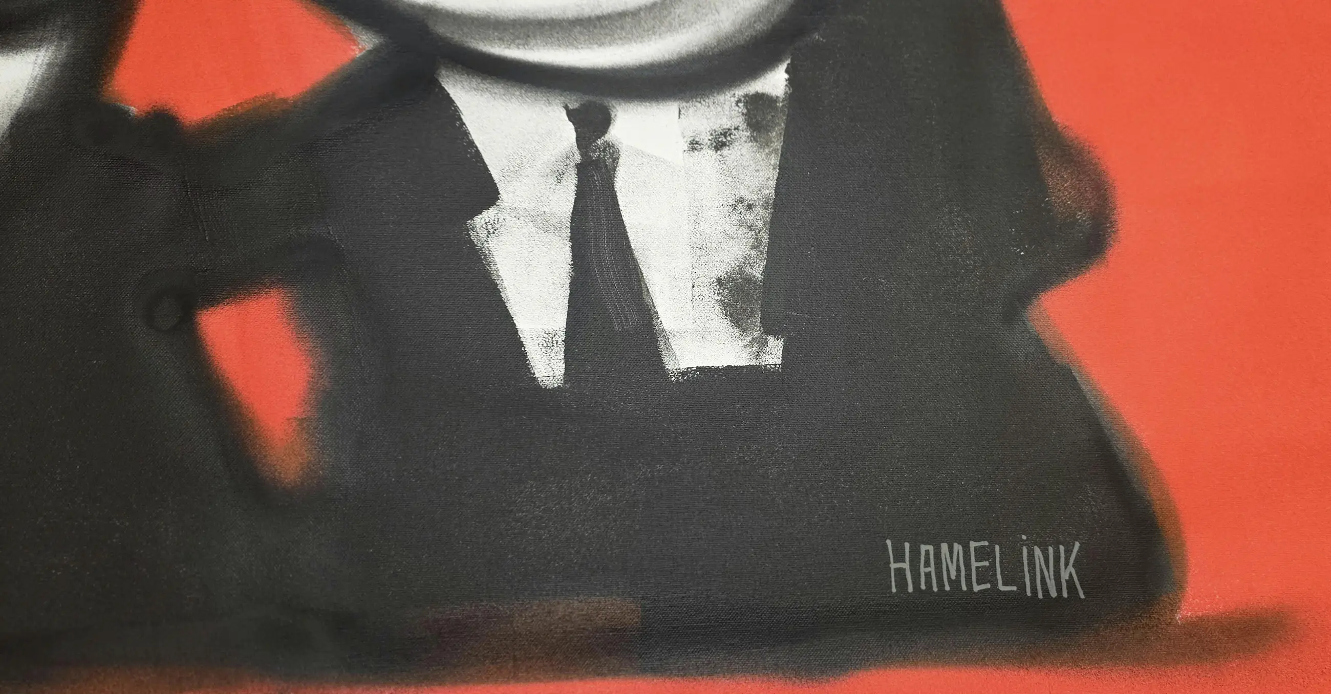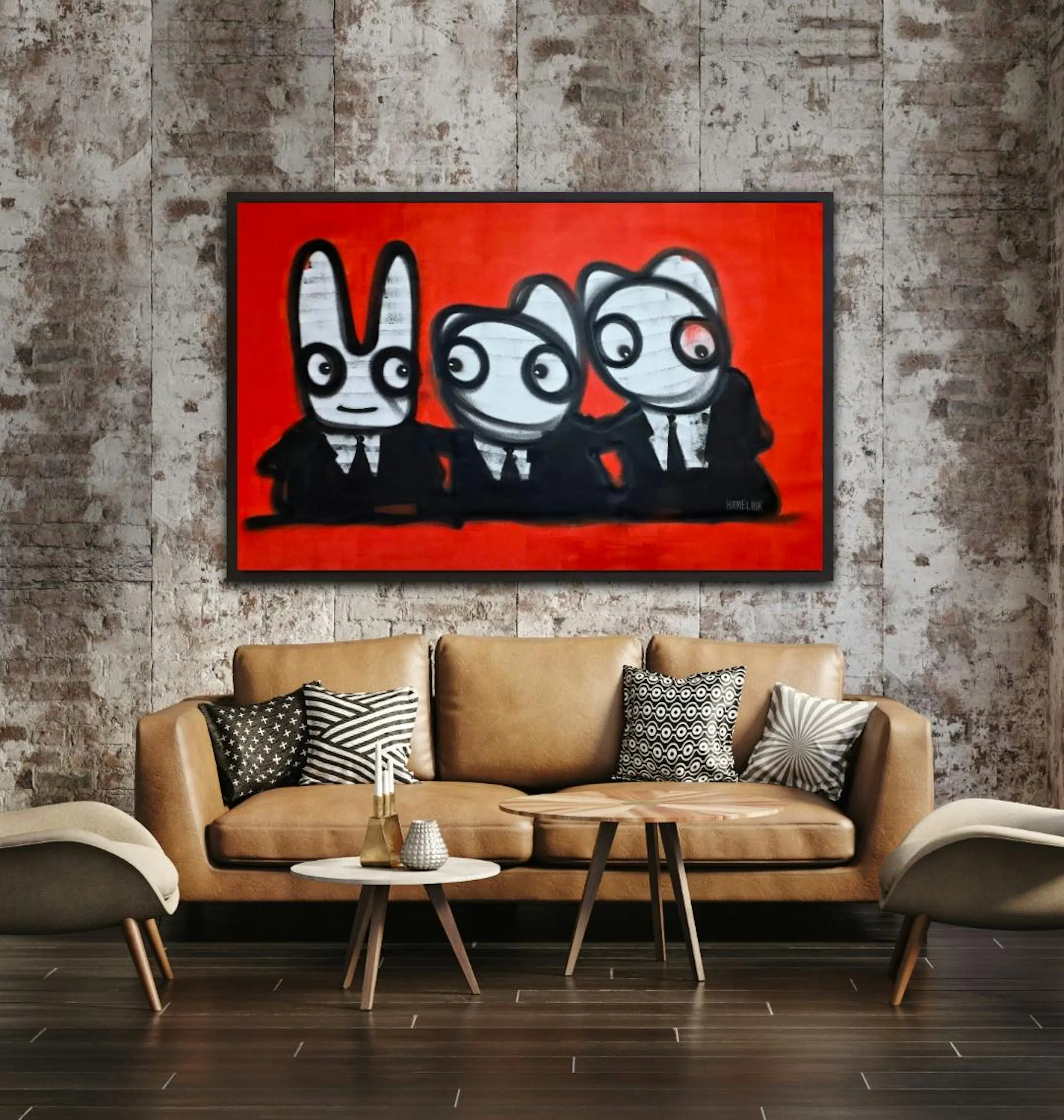 Drie figuren zitten naast elkaar aan dezelfde tafel, tegen een krachtige rode achtergrond. Ze kijken niet allemaal dezelfde kant op, maar horen wel bij elkaar. Het werk speelt met onderlinge dynamiek: samen zijn, maar ieder met zijn eigen blik, houding en gedachte. De rode achtergrond geeft het werk energie en spanning, terwijl de herkenbare Hamelink-figuren zorgen voor humor en lichtheid. Het voelt als een gesprek zonder woorden — iedereen zit erbij, niemand neemt echt de leiding. Typisch neo-expressionistisch werk van Bart Hamelink: rauwe lijnen, eenvoudige vormen, sterke contrasten en een scène die blijft hangen zonder uitleg nodig te hebben. Het werk past zowel in een modern als industrieel interieur en trekt direct de aandacht. Extra informatie Uniek origineel kunstwerk Handgeschilderd door Bart Hamelink Acrylverf op doek Gesigneerd door de kunstenaar Wordt geleverd zonder spieraam (vanwege hoge transportkosten en kleinere kans op beschadiging) Inclusief certificaat van echtheid De getoonde afbeeldingen zijn sfeerfoto’s waarin het werk ingelijst en opgespannen aan de muur hangt Meer werk en achtergrond van de kunstenaar: Website: www.barthamelink.com Instagram: @hamelink.art.bart