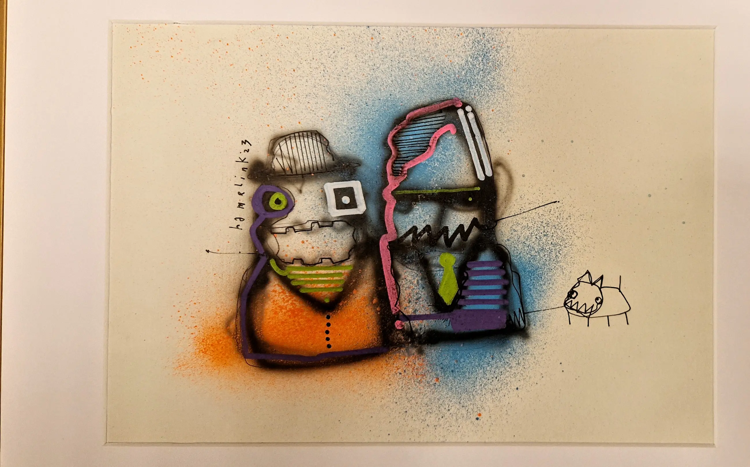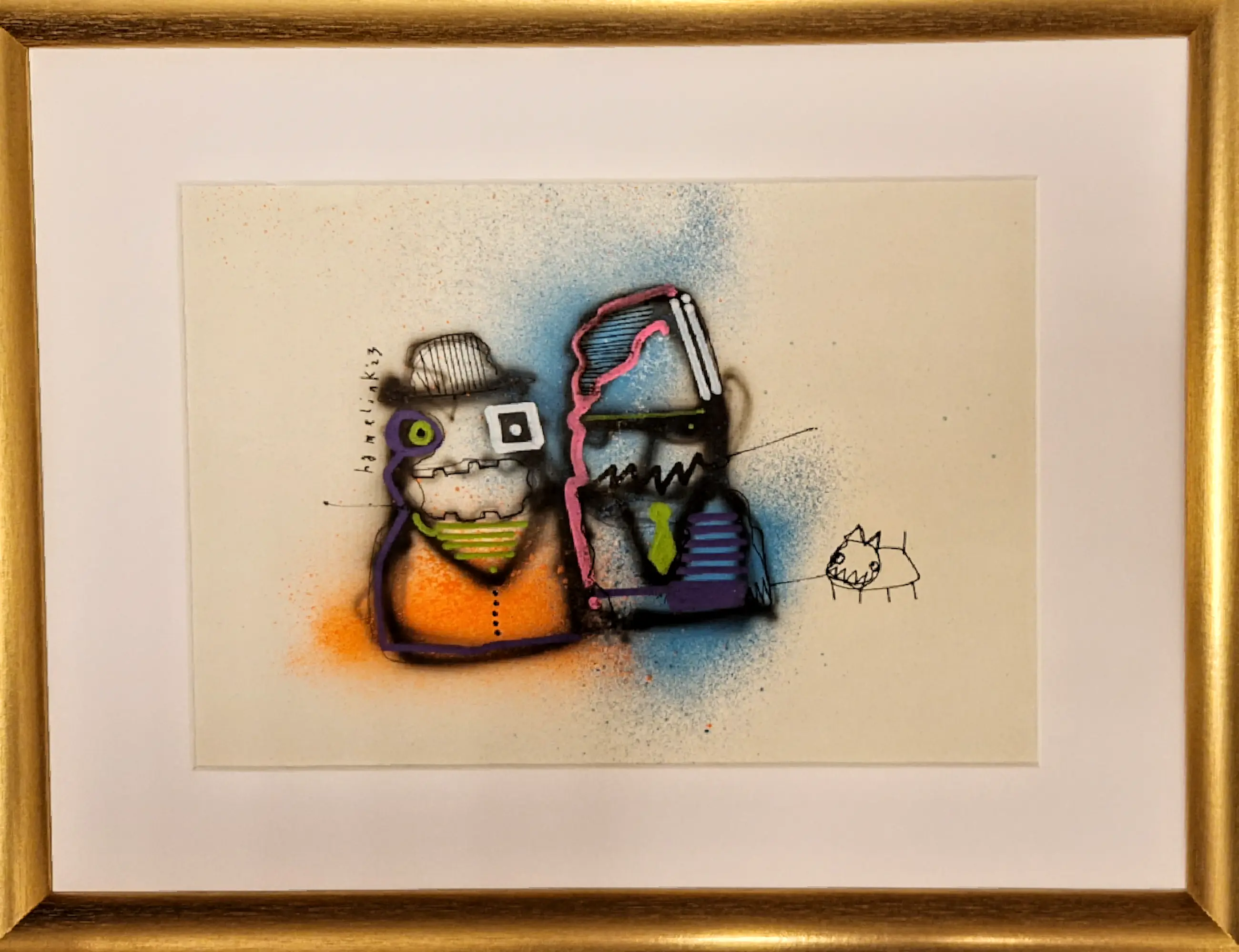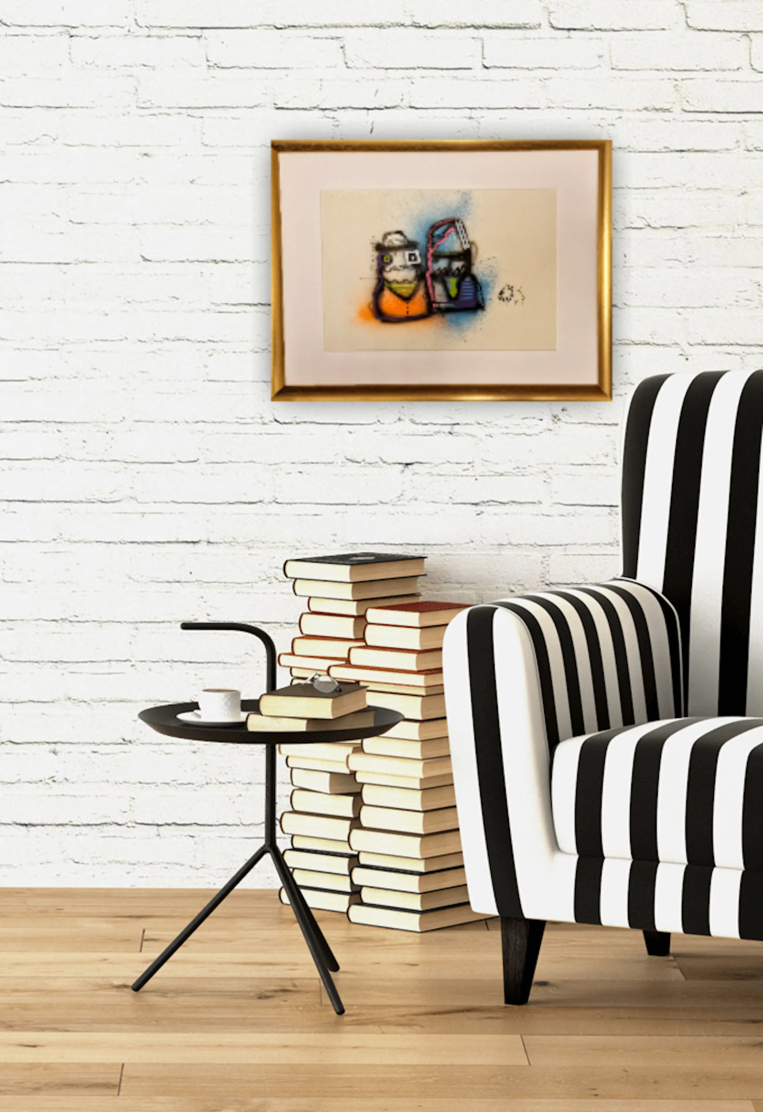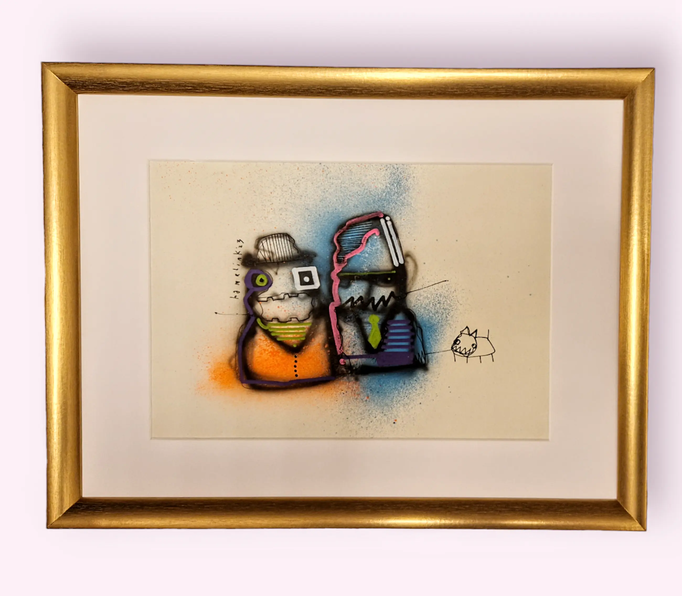 Originele illustratie tekening van Bart Hamelink. Gemaakt met air brush, acryl inkt op 250 gram papier. Het werk is inclusief lijst . Samen een nan en een vrouw en een kat. Het werk is in perfecte staat.