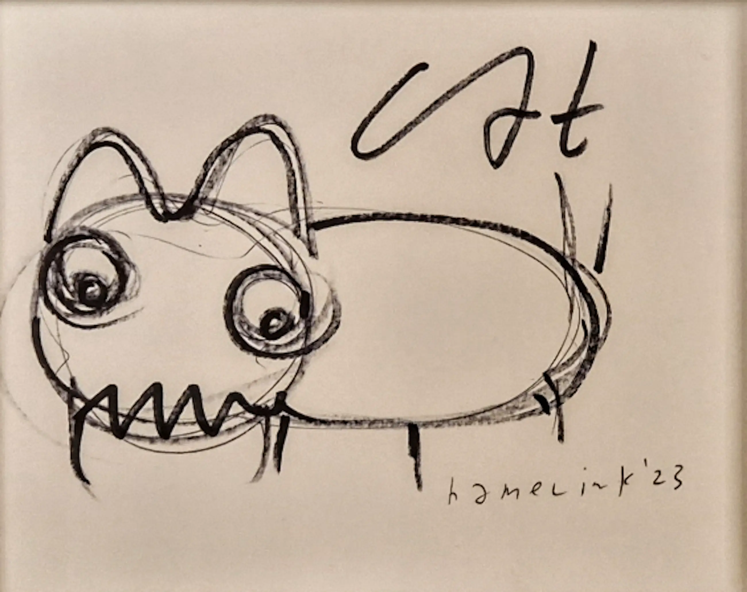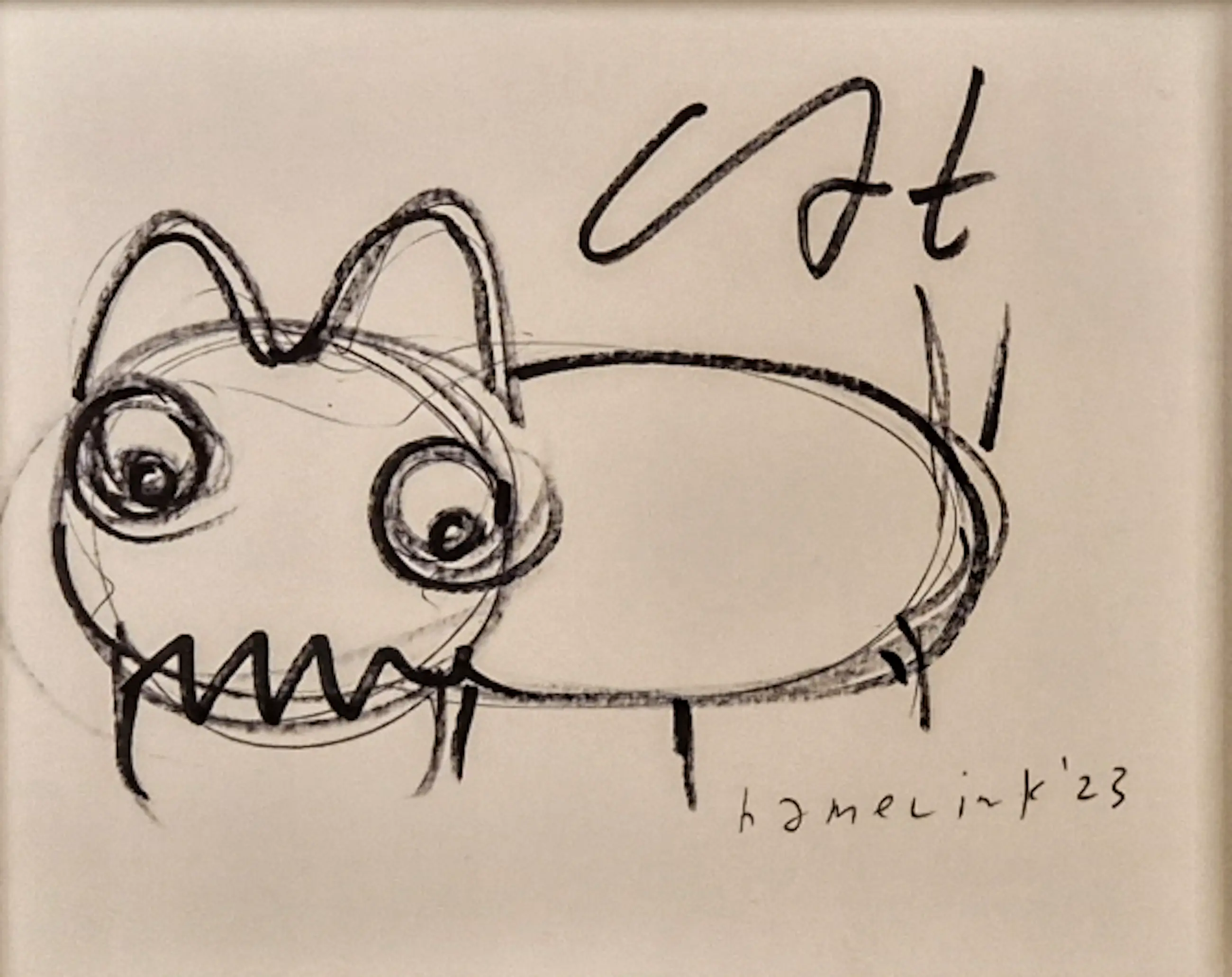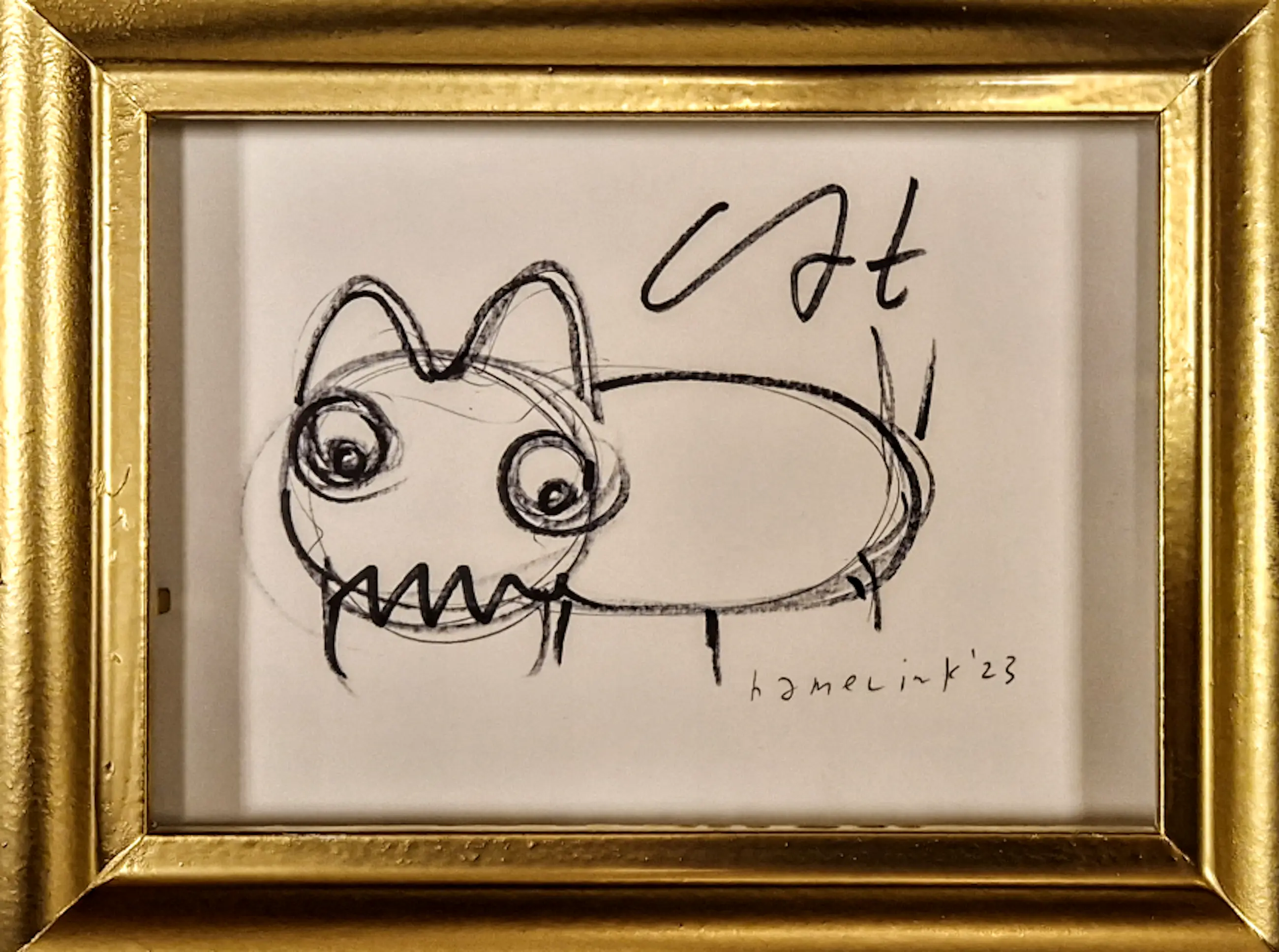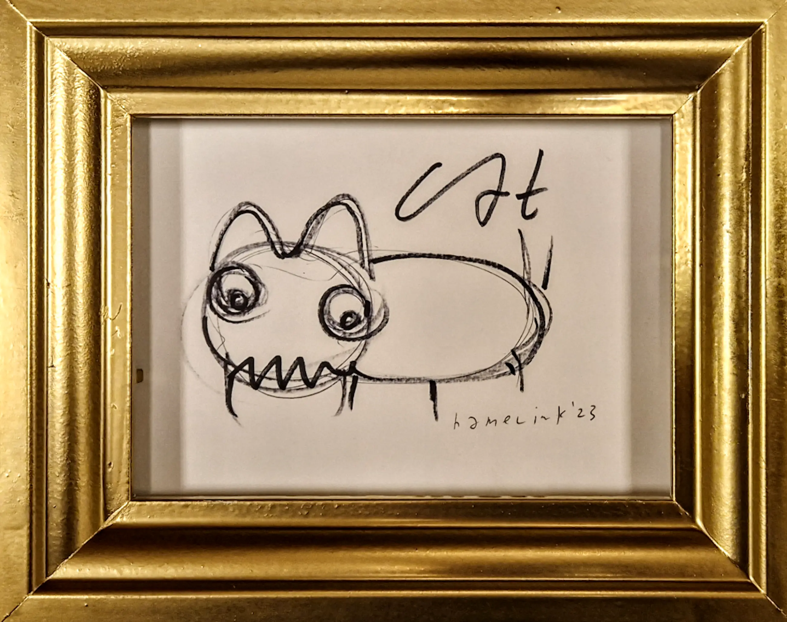 Orginele cartoon illustratie tekening van een kat. Getekend door de Nederlandse kunstenaar Bart Hamelink. De tekening is gemaakt op 250 gram papier met acryl inkt. Geïnspireerd door zijn tekeningen met kat.