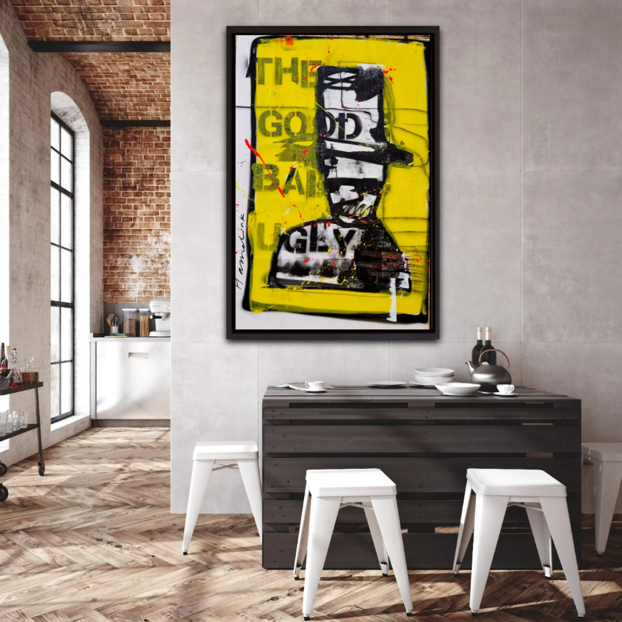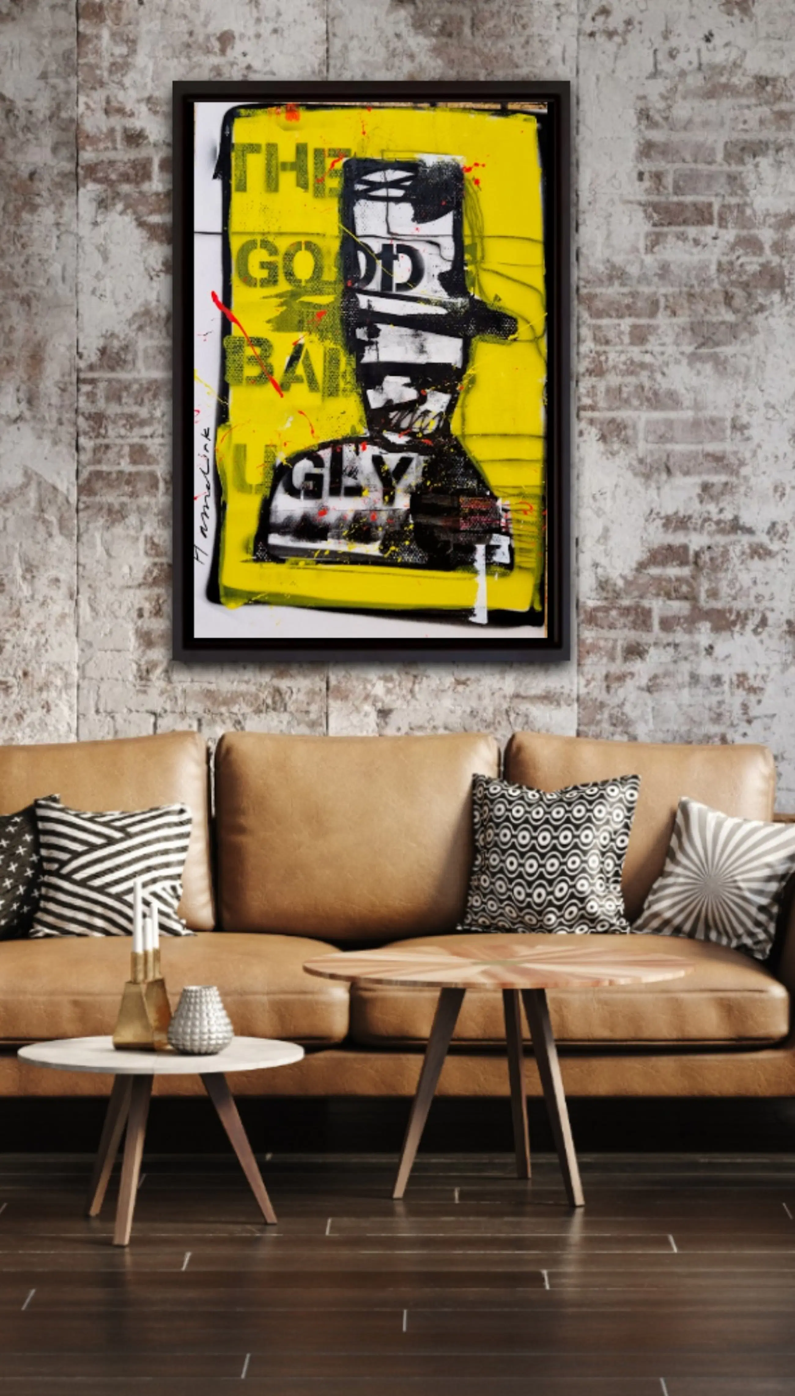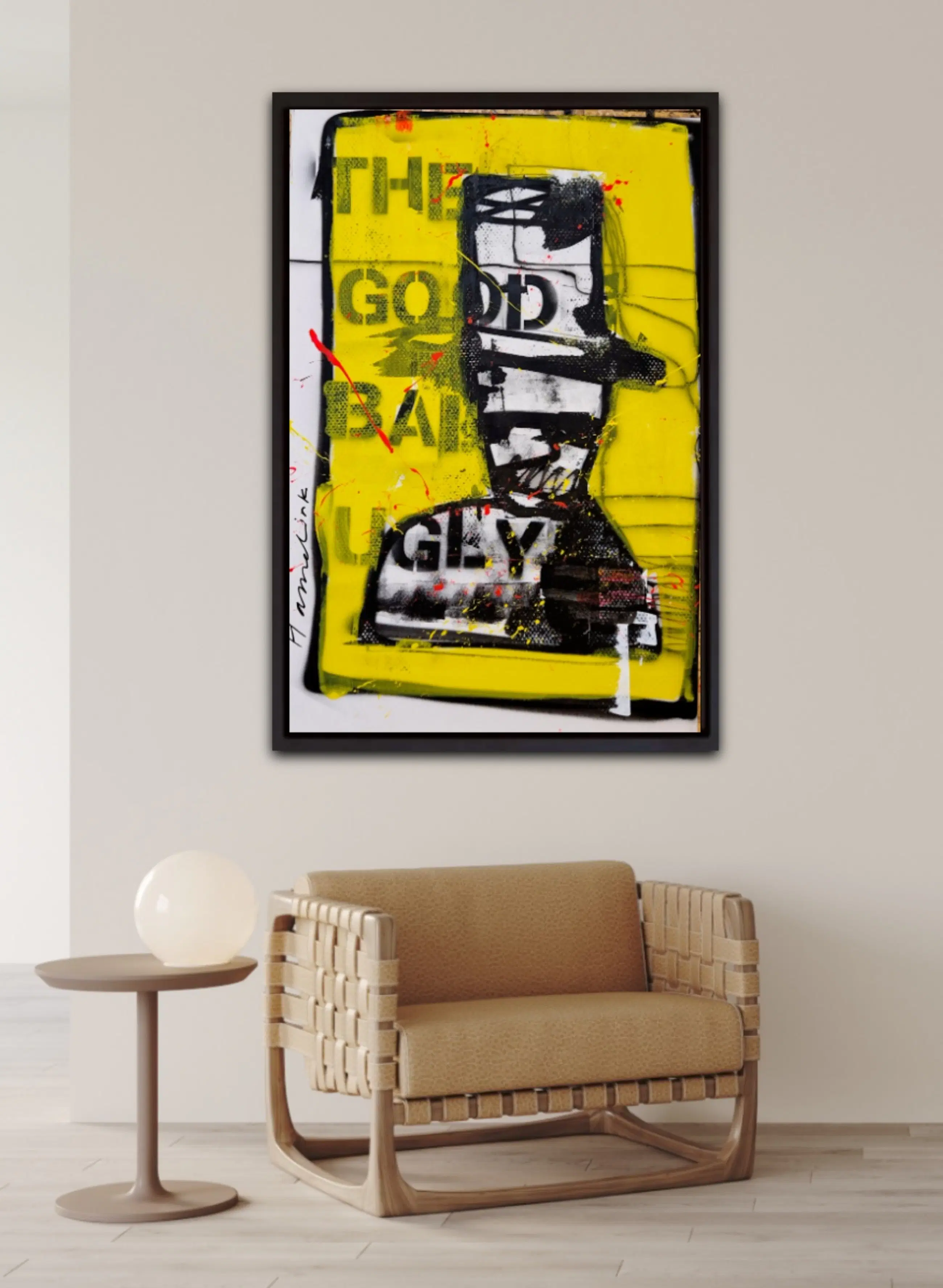 Rauw, direct en met een dikke knipoog naar iconische cinema. In dit werk vangt Hamelink de essentie van goed, kwaad en alles daartussenin met een brute portretstijl op knalgeel doek. De grove lijnen, spetters en stencilteksten maken dit tot een visuele mokerslag vol karakter.