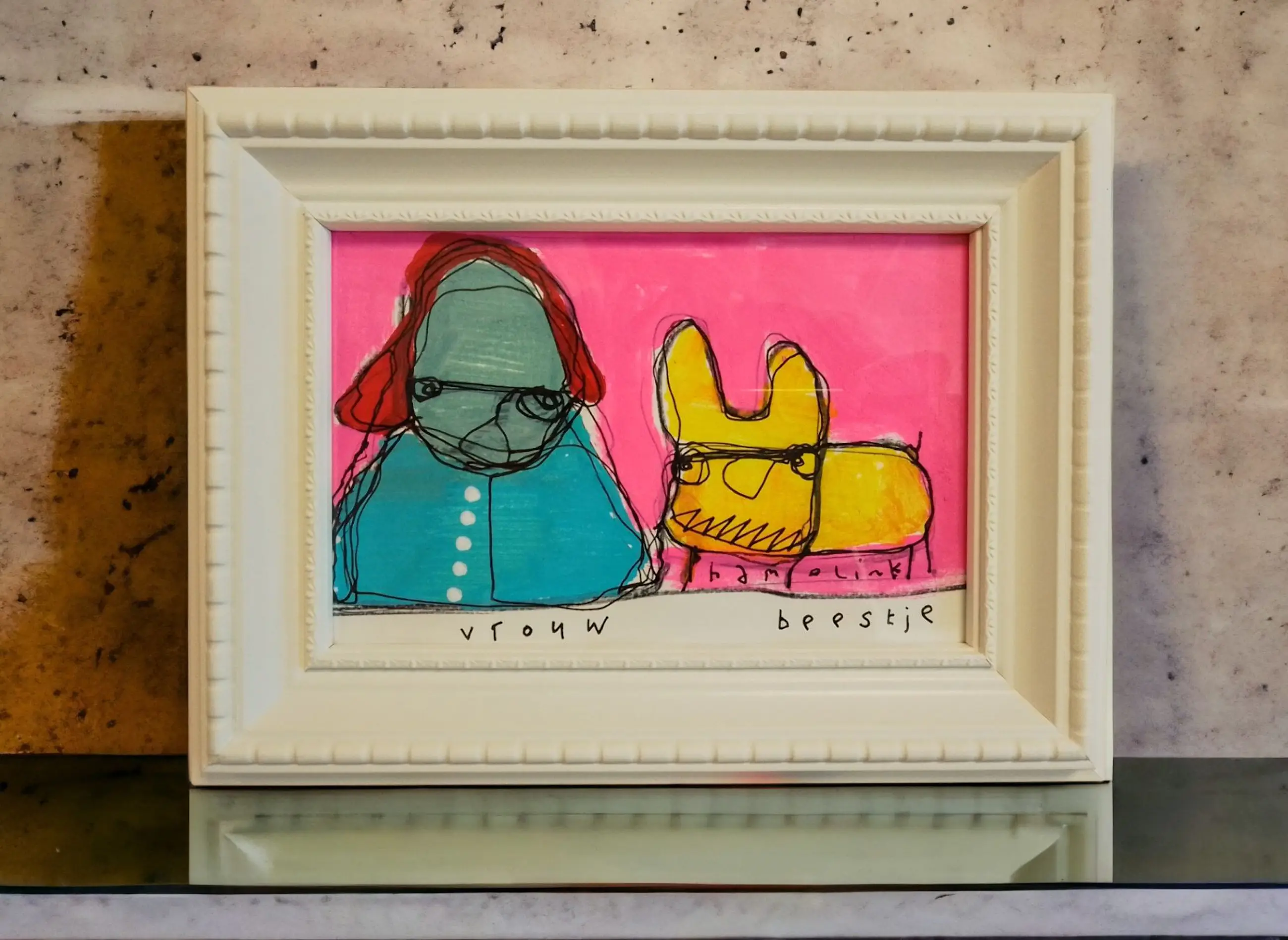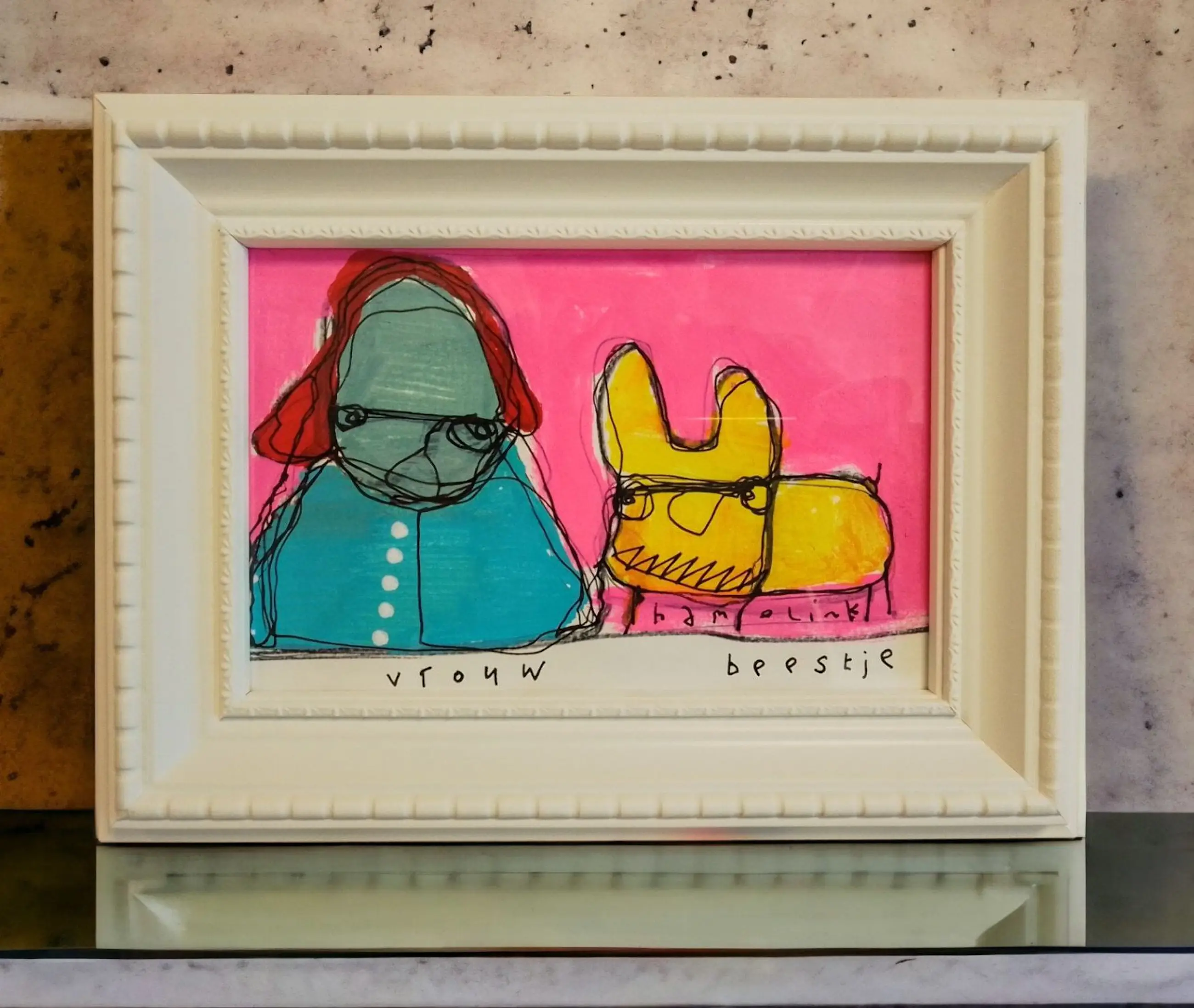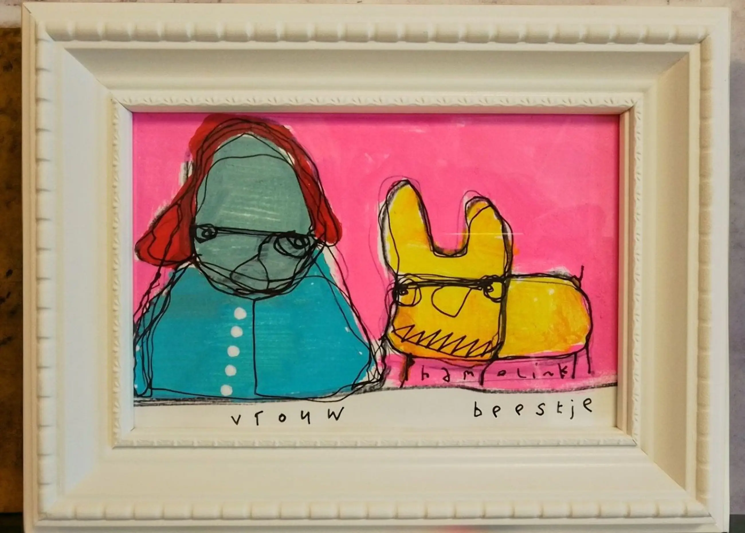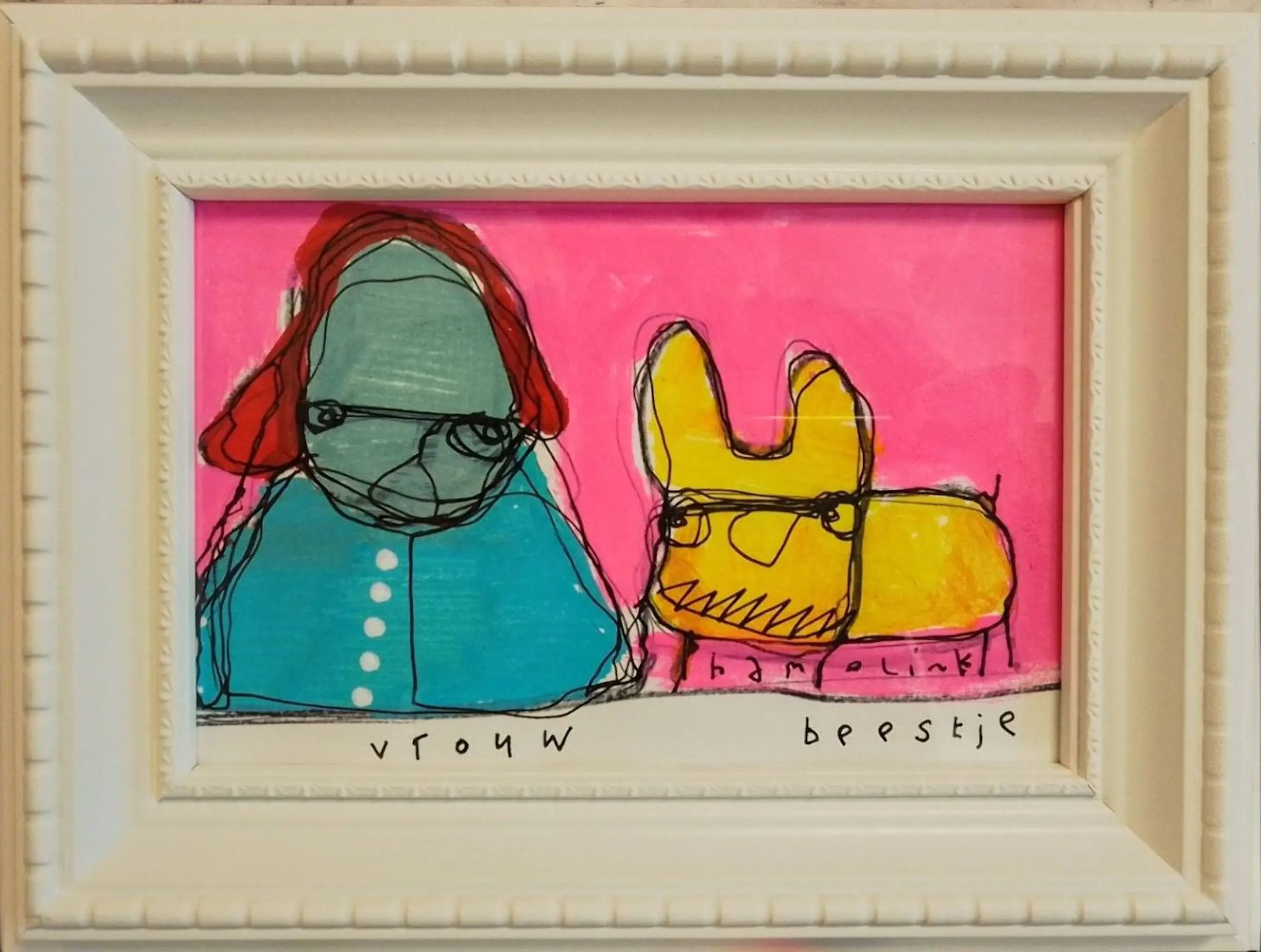 Leuke vrolijke illustratie tekening van Hamelink. Vrouw met beestje, getekend / geschilderd op papier . Het werkje is inclusief lijst en gemaakt met acryl inkt , marker . Handgesigneerd met Hamelink Een vrolijk item leuk voor je prive kunst collectie of om als cadeau te doen .