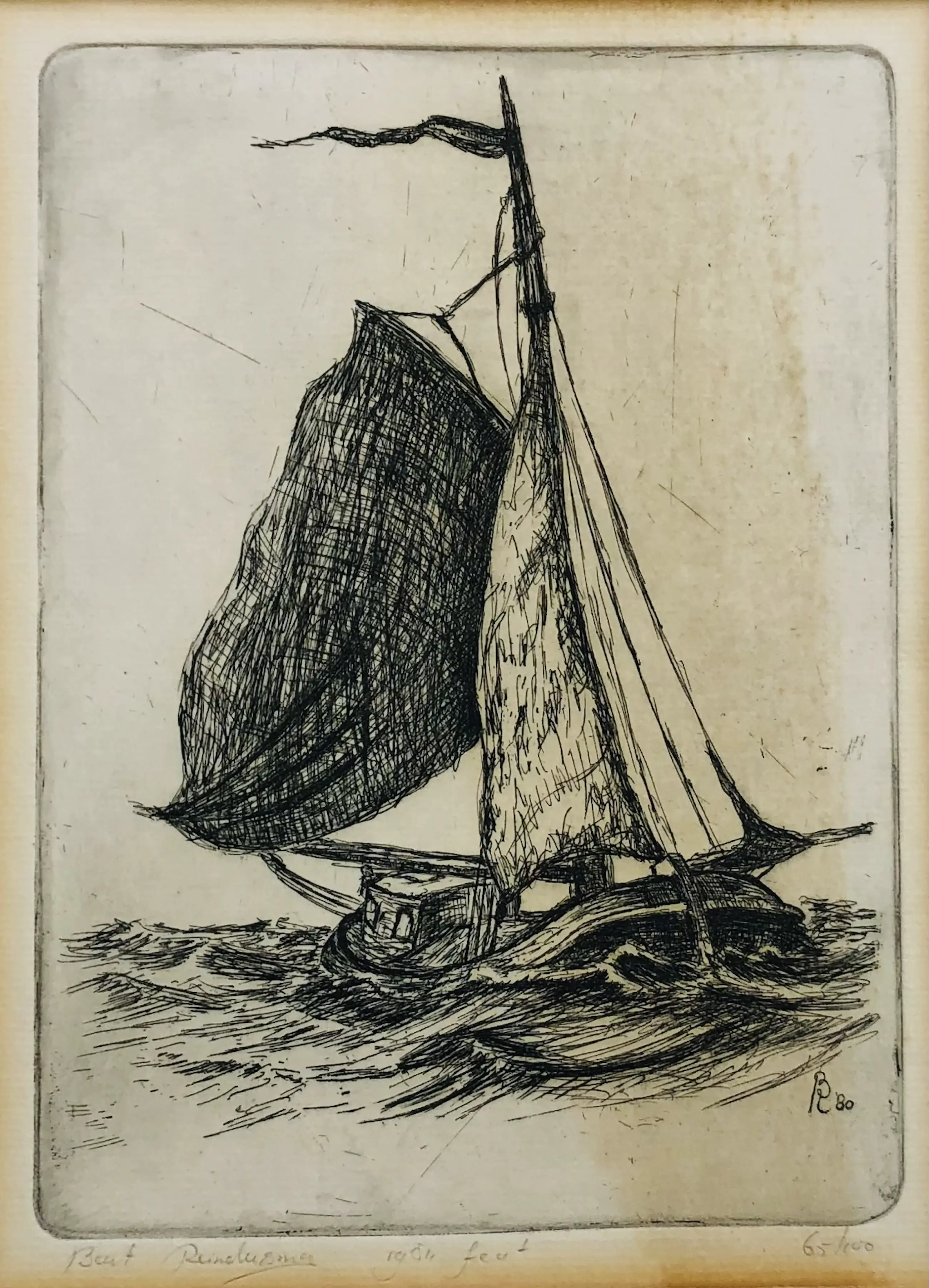Fraai ets werk van de kunstenaar Bart Reindersma. De maataanduiding heeft betrekking op het gehele papier, de etsindruk is kleiner. ca 17 x12 cm. De ets is verkleurd en verdient het om te laten restaureren. U kunt het werk vooraf komen beoordelen in de schatkamer van galerie Rotor in Gorcum. In overleg kunt u uw aankopen gratis laten opslaan in onze verwarmde opslagruimte en ze in een later stadium ophalen. Ook kunnen wij uw inlijstingen verzorgen.