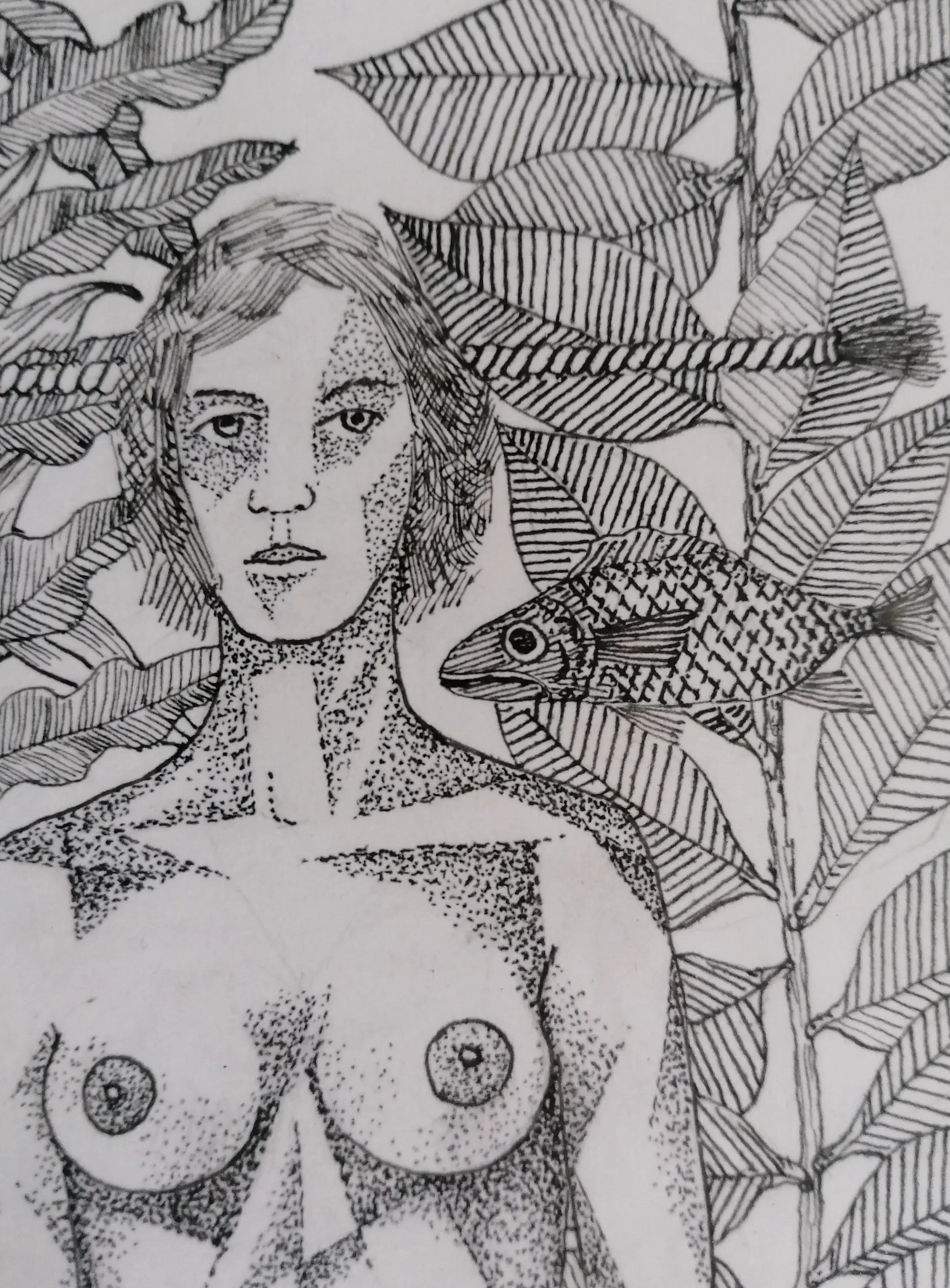 Pen en O. I. inkt. "Paradijs XXI "uit een serie van 30 stuks. Kristal figuren. "Outsiderkunst" Gesigneerd: b.20