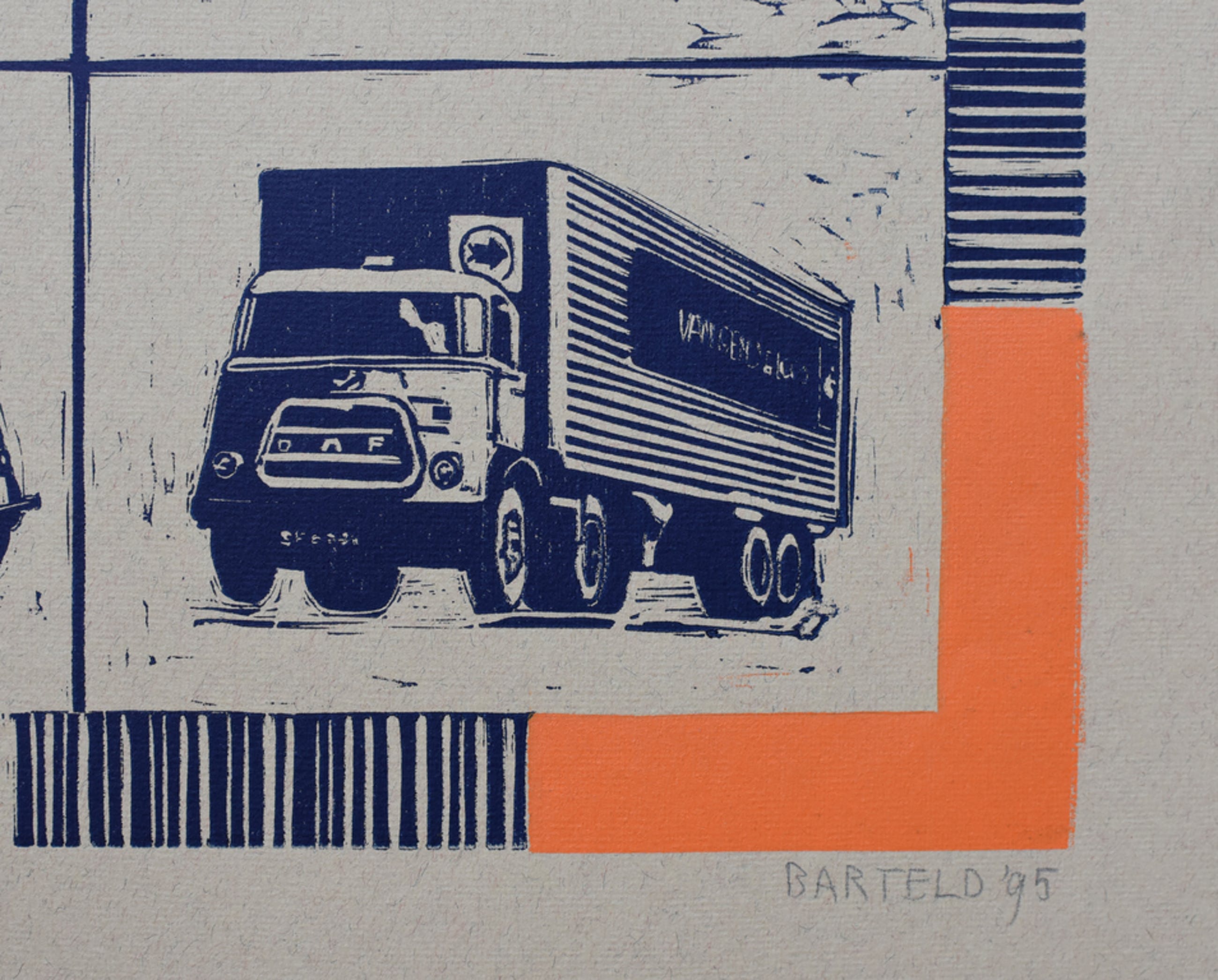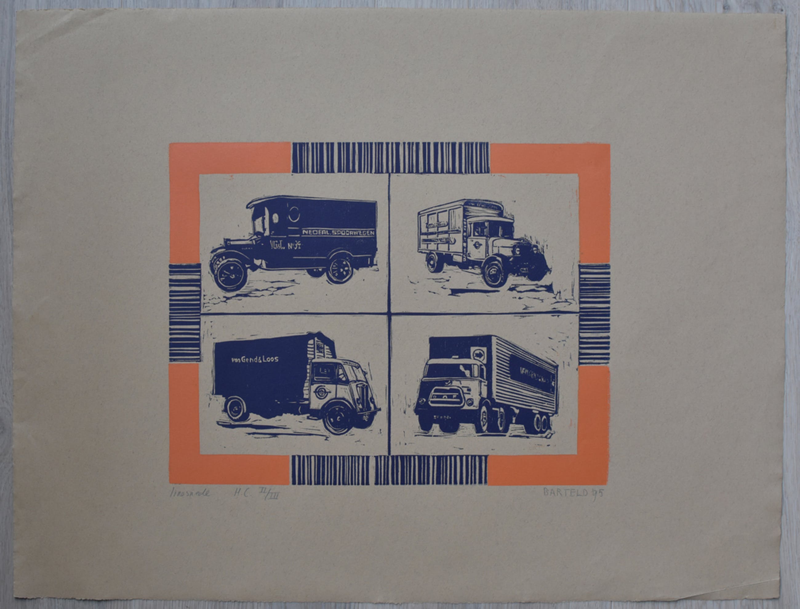Op bruin papier gedrukte linosnede in een oplage van 3 ex. met darop een voorstelling van 4 van Gend & Loos vrachtautos, waarbij de gebruikte kleurstelling overeenkomt met het gebruikte oranje van van G&L.
