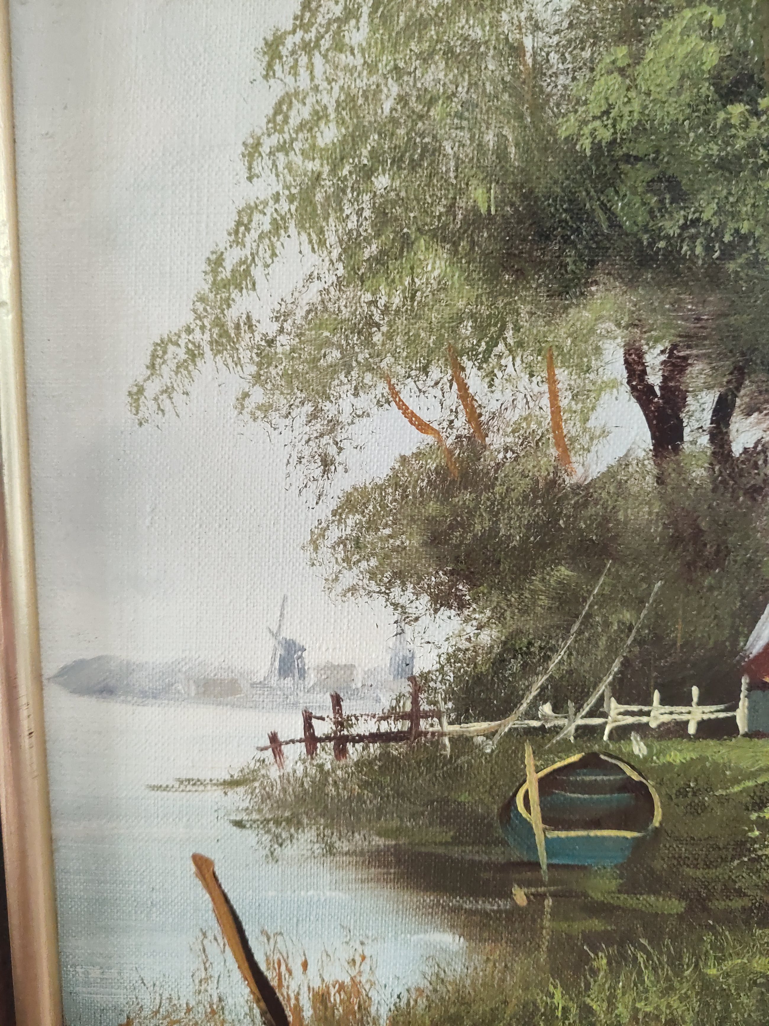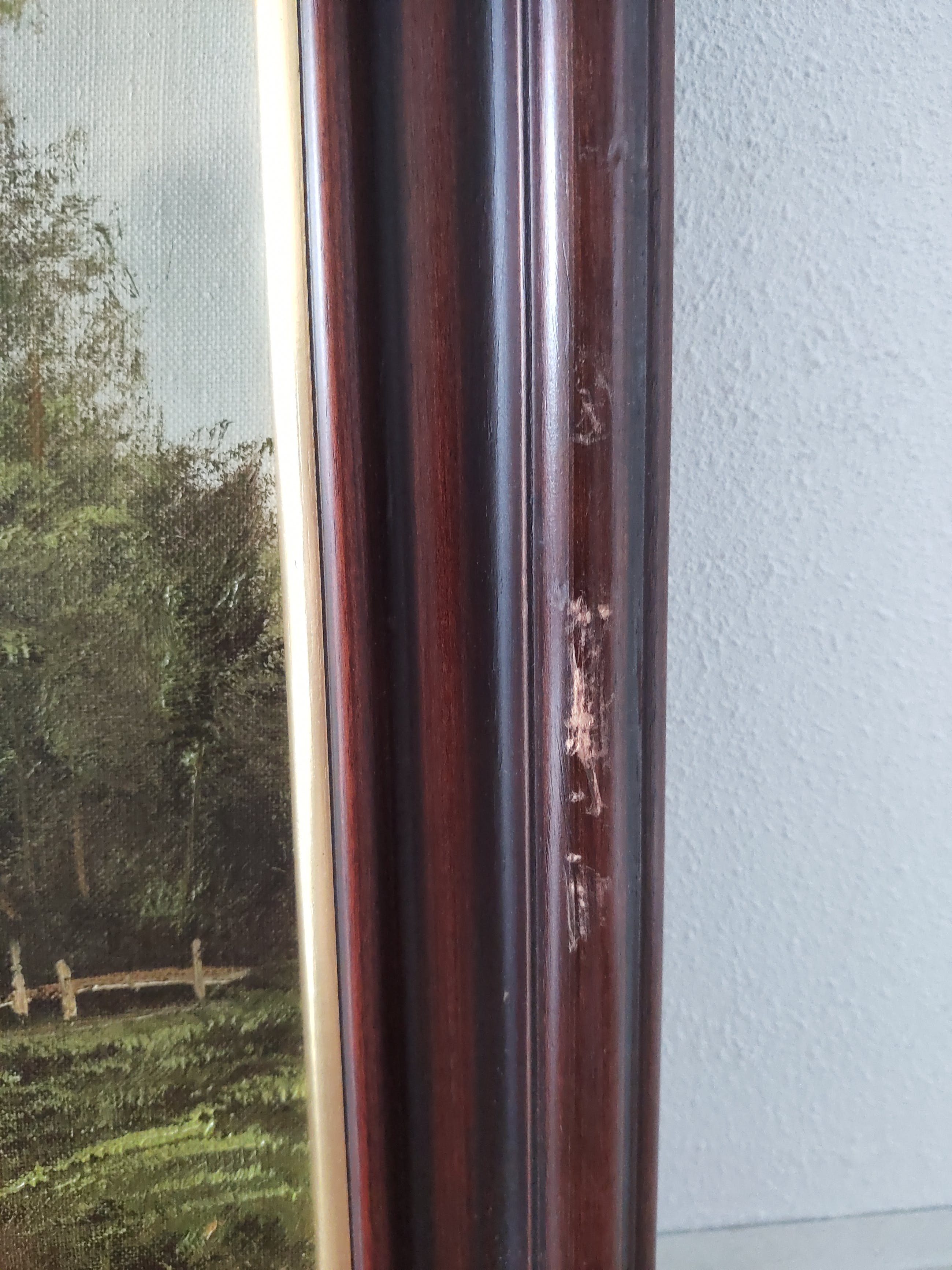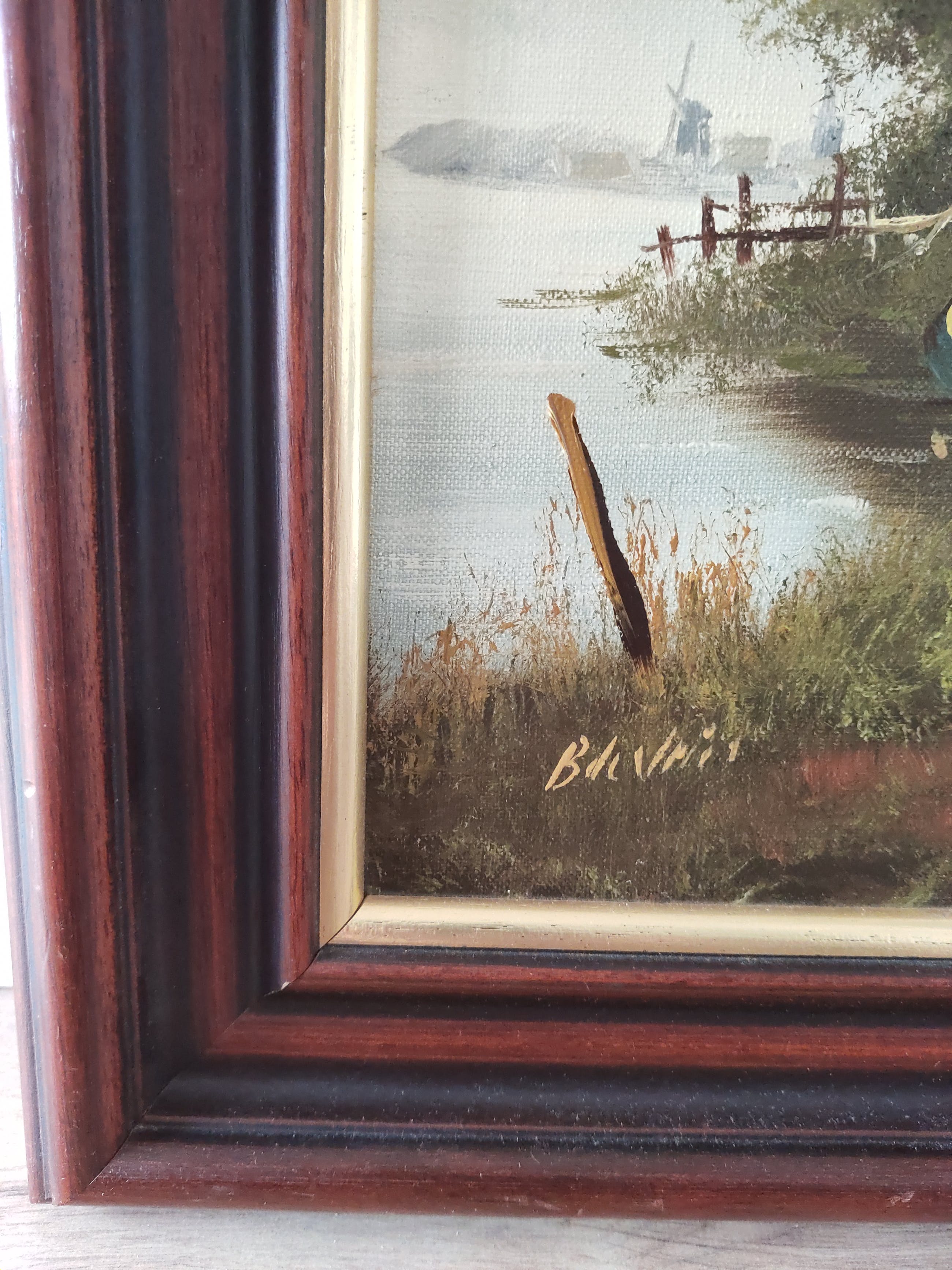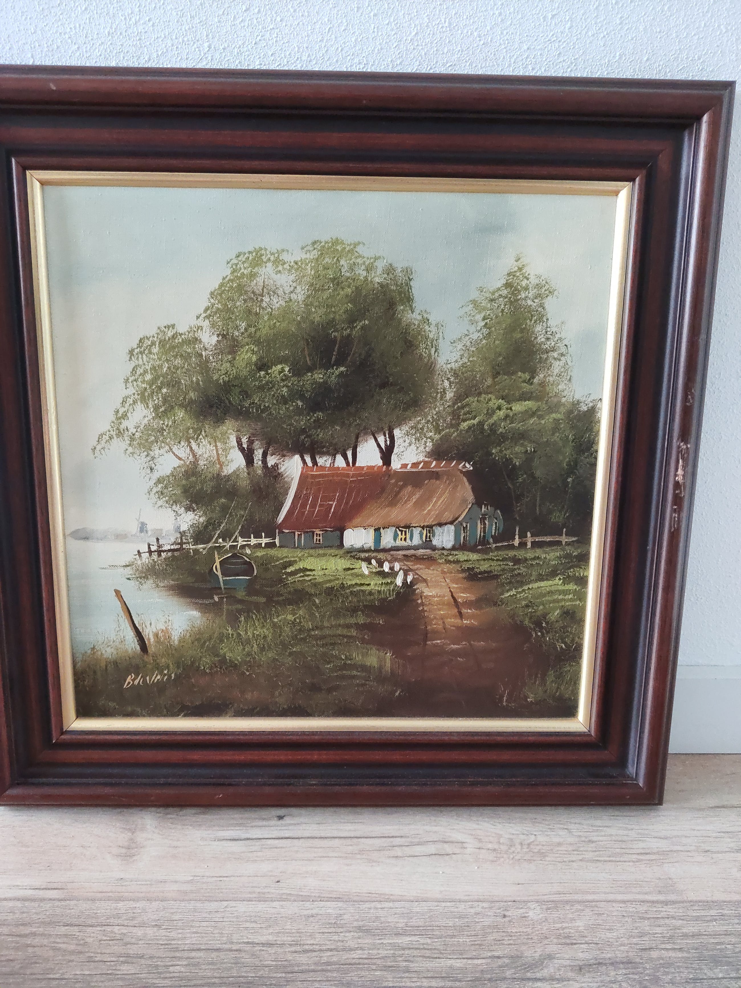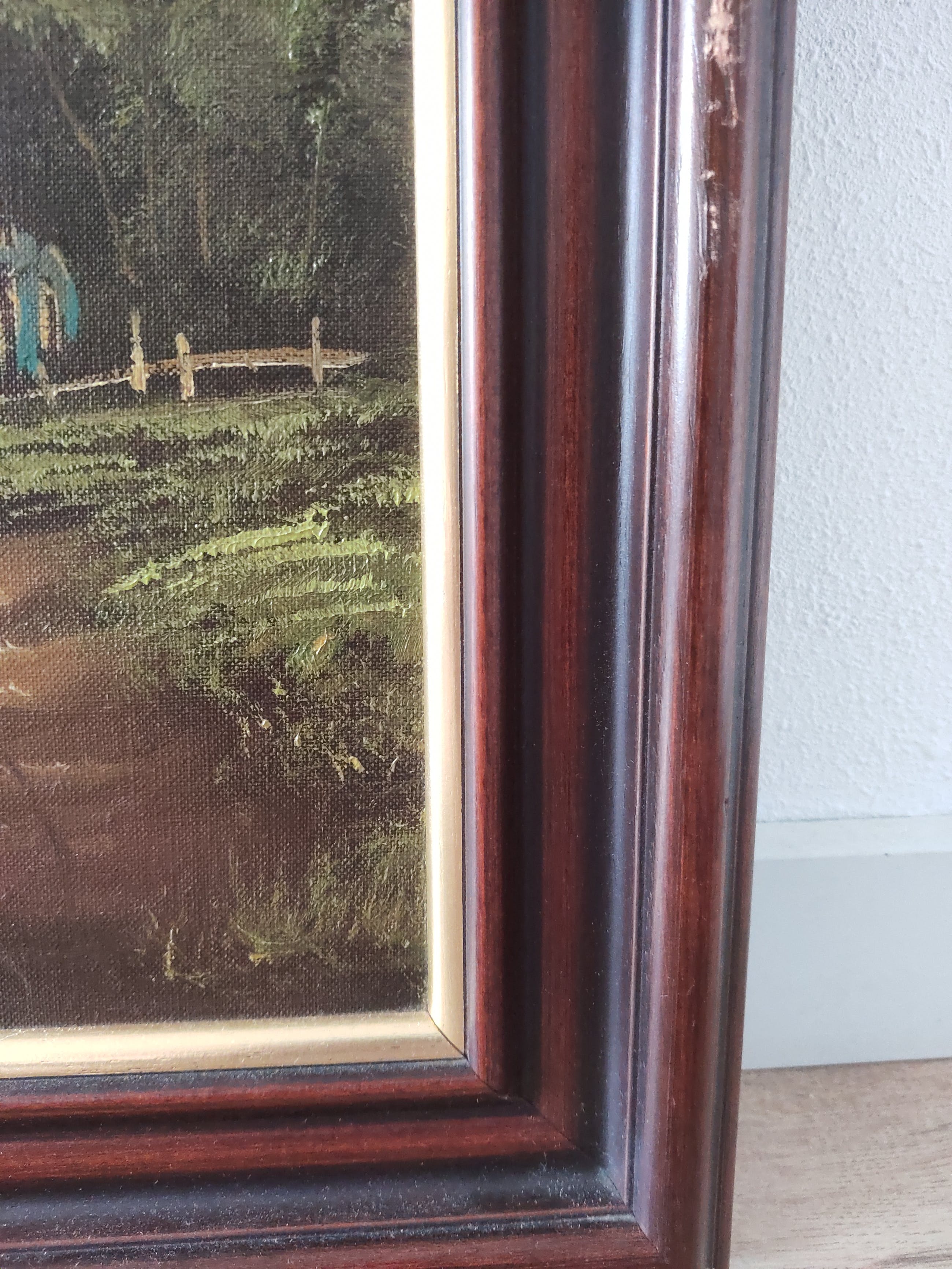 Prachtig schilderij met een landweg en boerderij op de voorgrond. Bootje in het water en in de verte een molen. Waarschijnlijk een Fries landschap, waar Bartha ook woonde. De lijst is in redelijke staat, één echte beschadiging. Zie foto's
